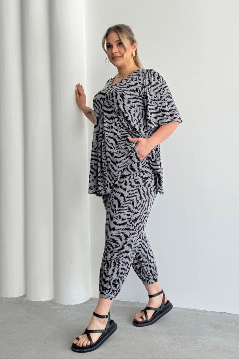 Büyük Beden Beli ve Paçası Lastikli Cepli Desenli Şalvar Pantolon 99-3