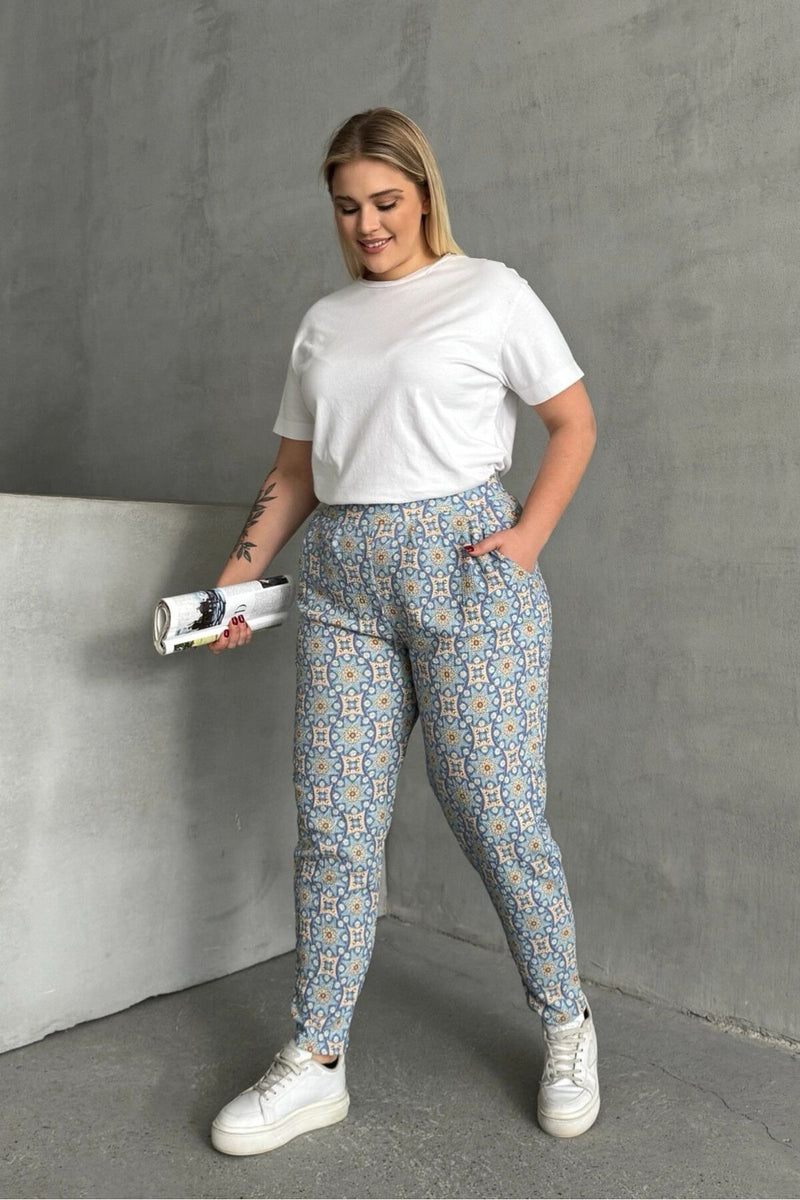 Büyük Beden Beli ve Paçası Lastikli Desenli Cepli Pantolon 303490