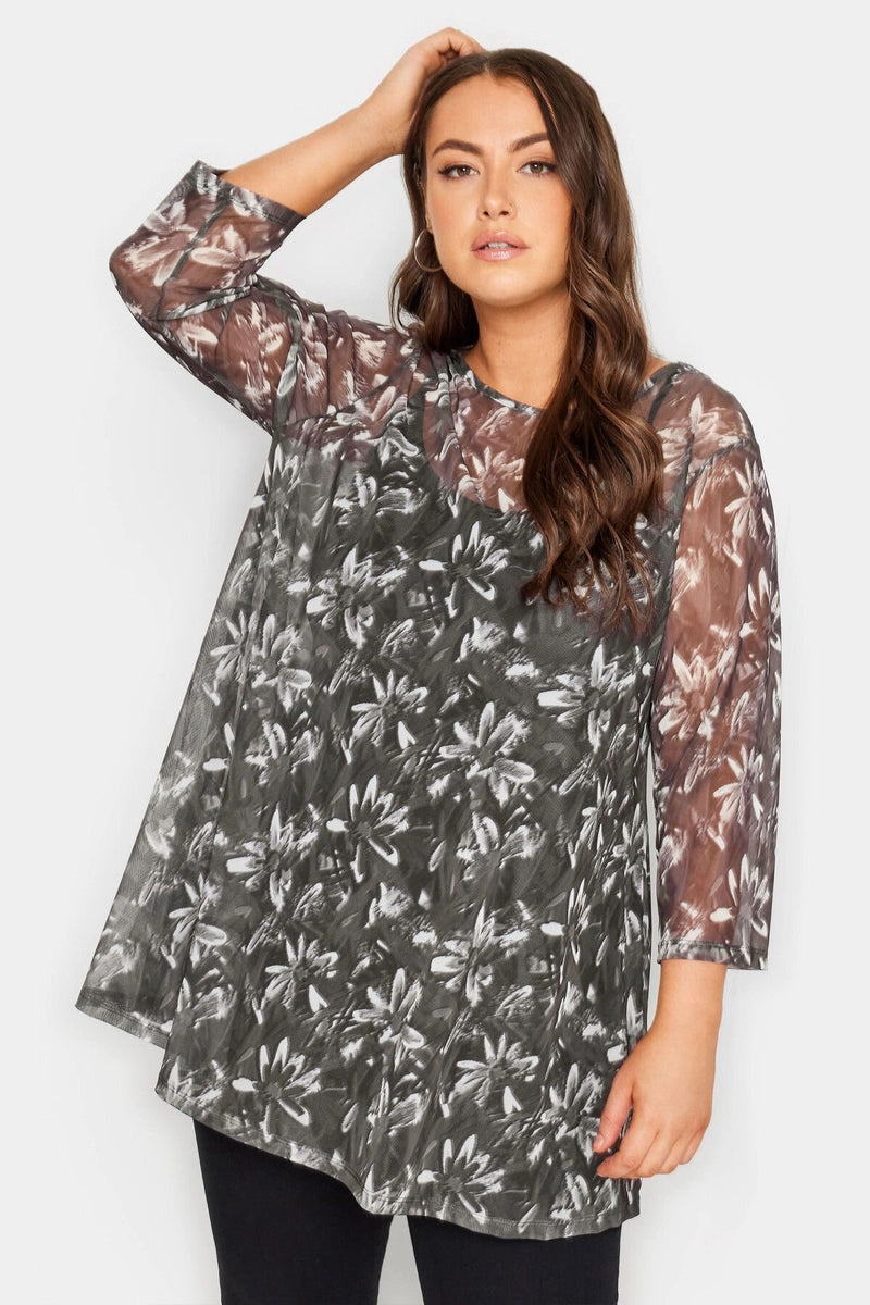 Büyük Beden Bisiklet Yaka Çiçek Desenli Uzun Kollu Tül Bluz 302701