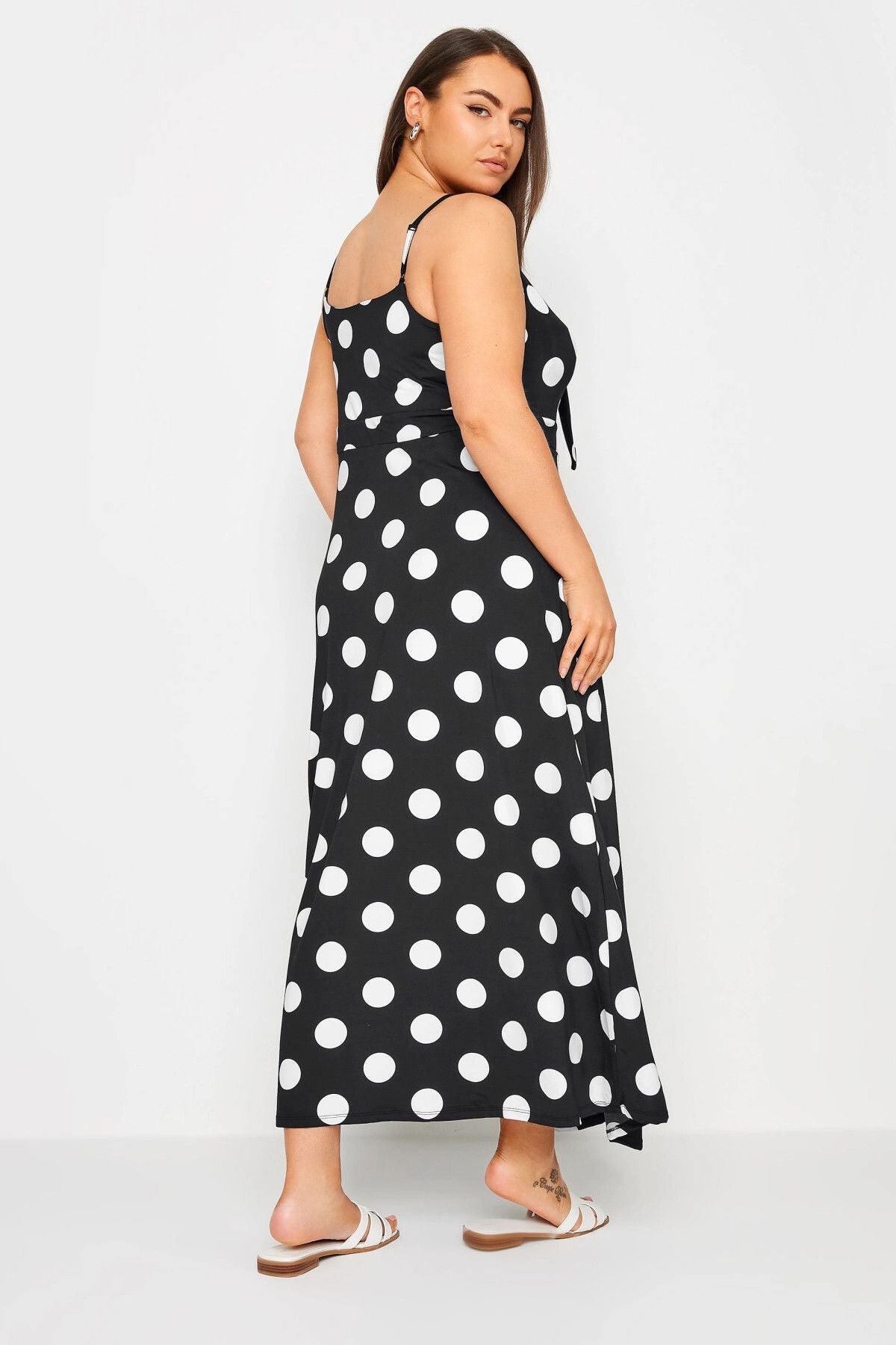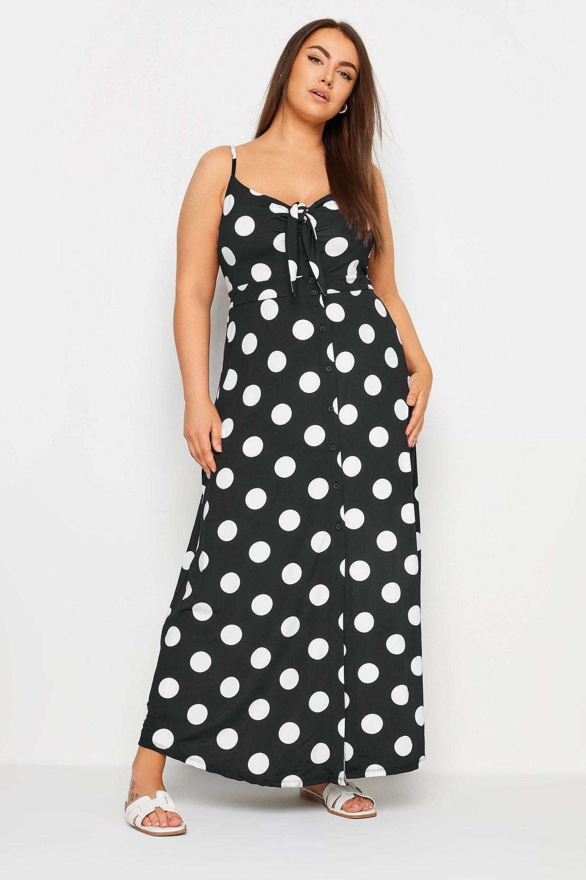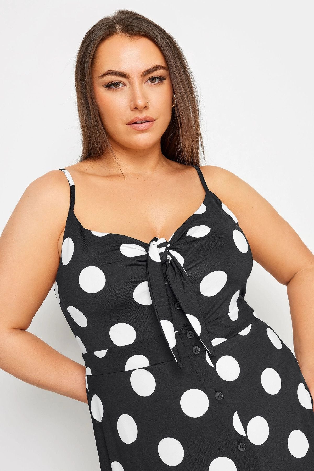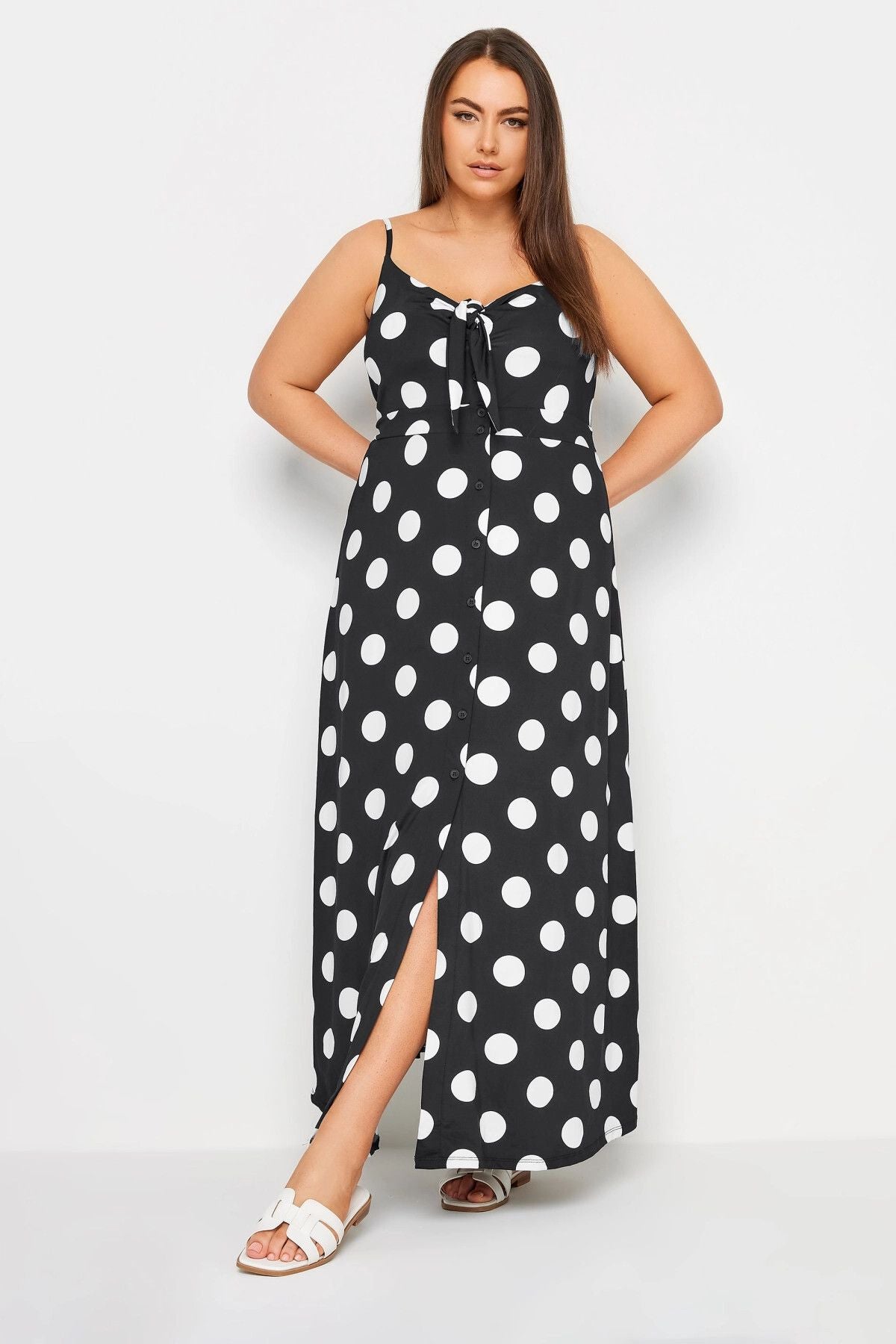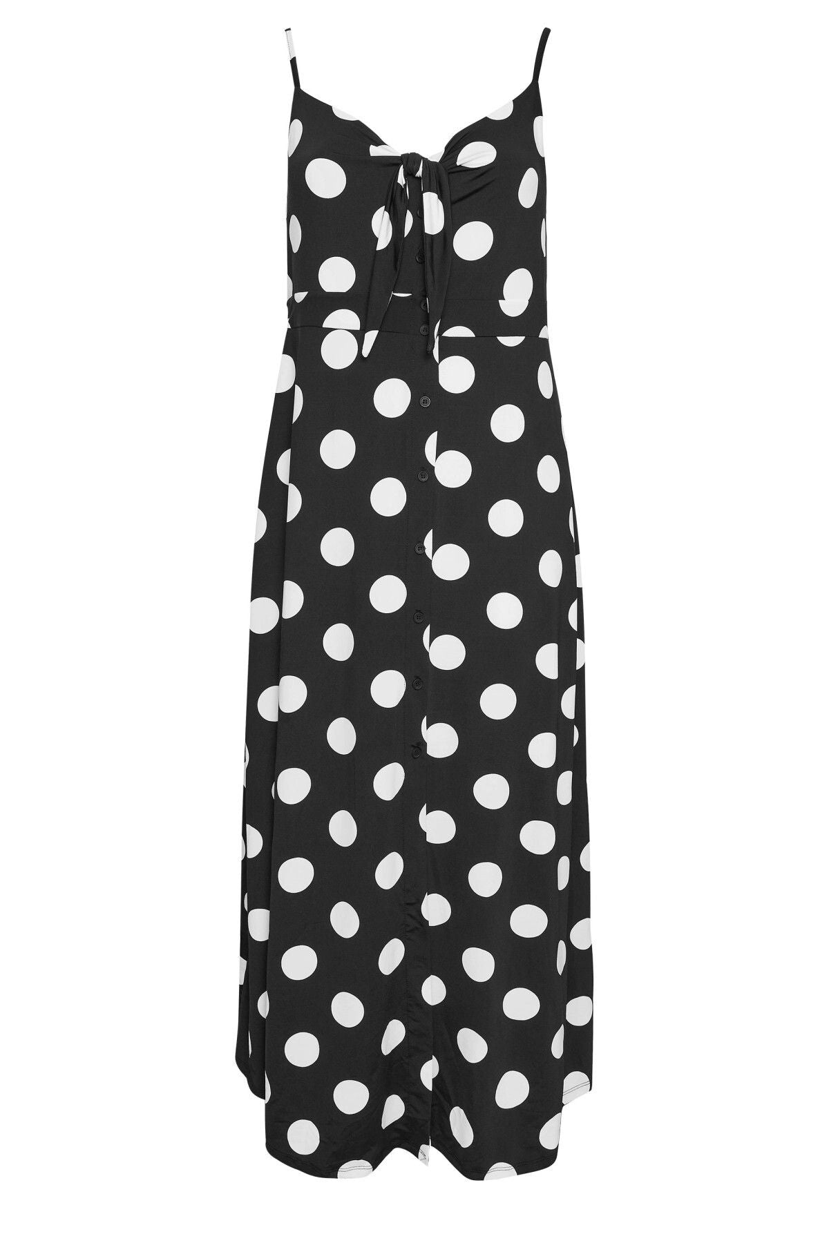 Büyük Beden Askılı Bağlama Detaylı Puantiyeli Düğmeli Yırtmaçlı Elbise 302378