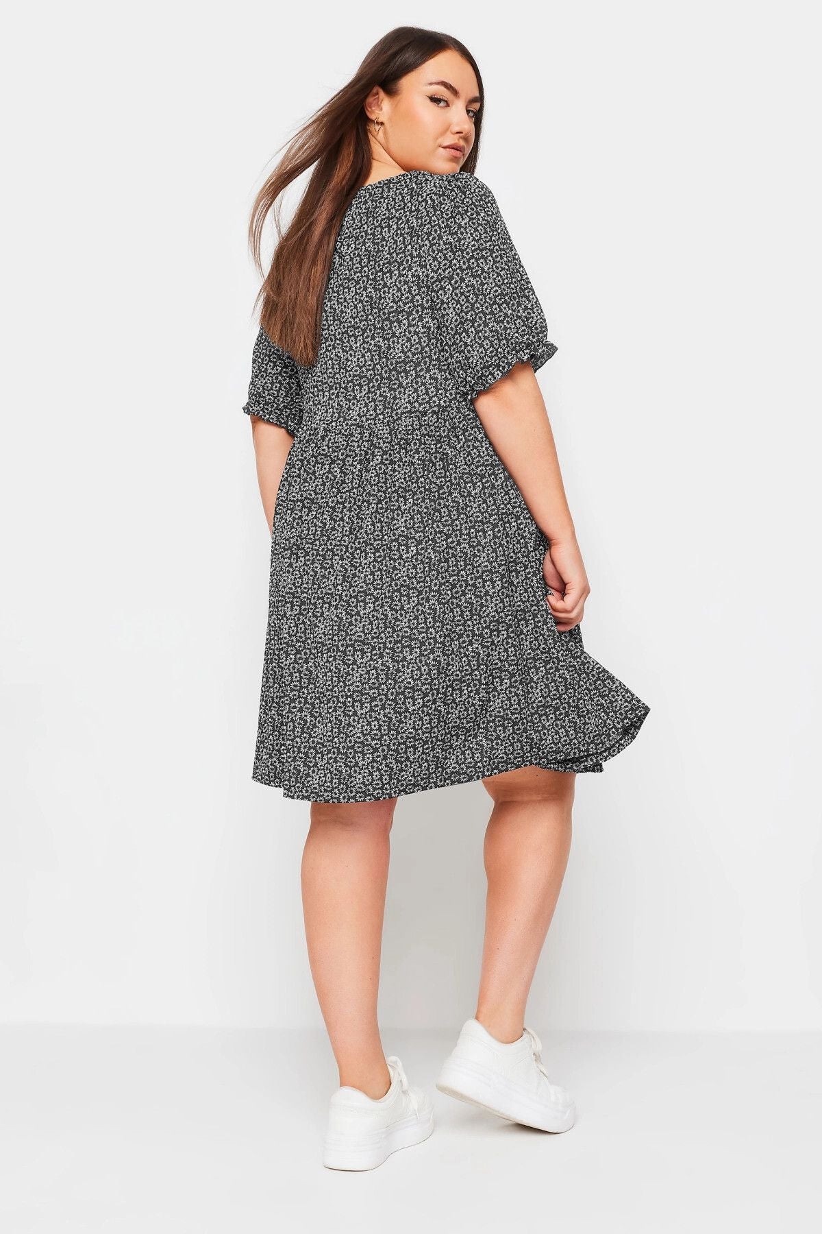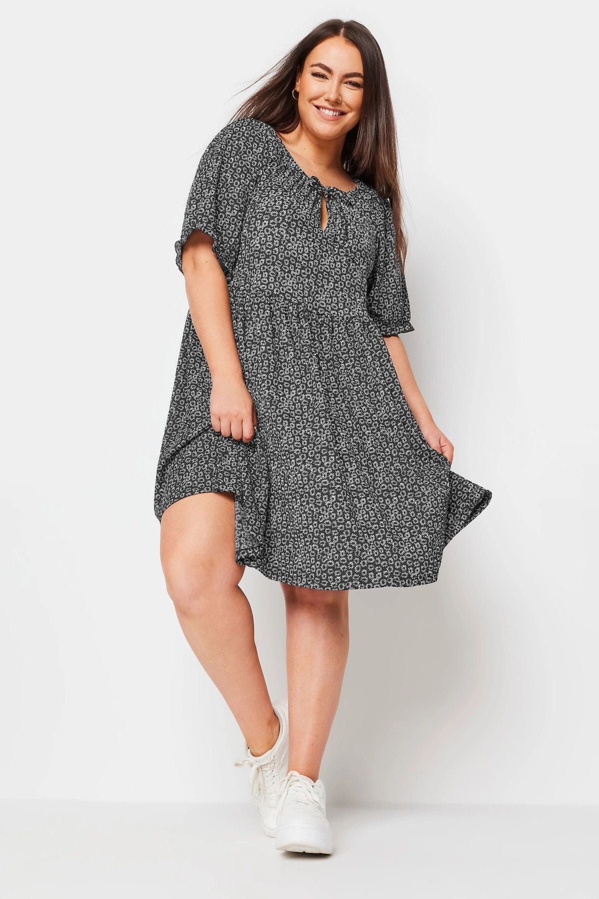 Büyük Beden Bağlama Detaylı Kolları Fırfırlı Çiçek Desenli Elbise 303187