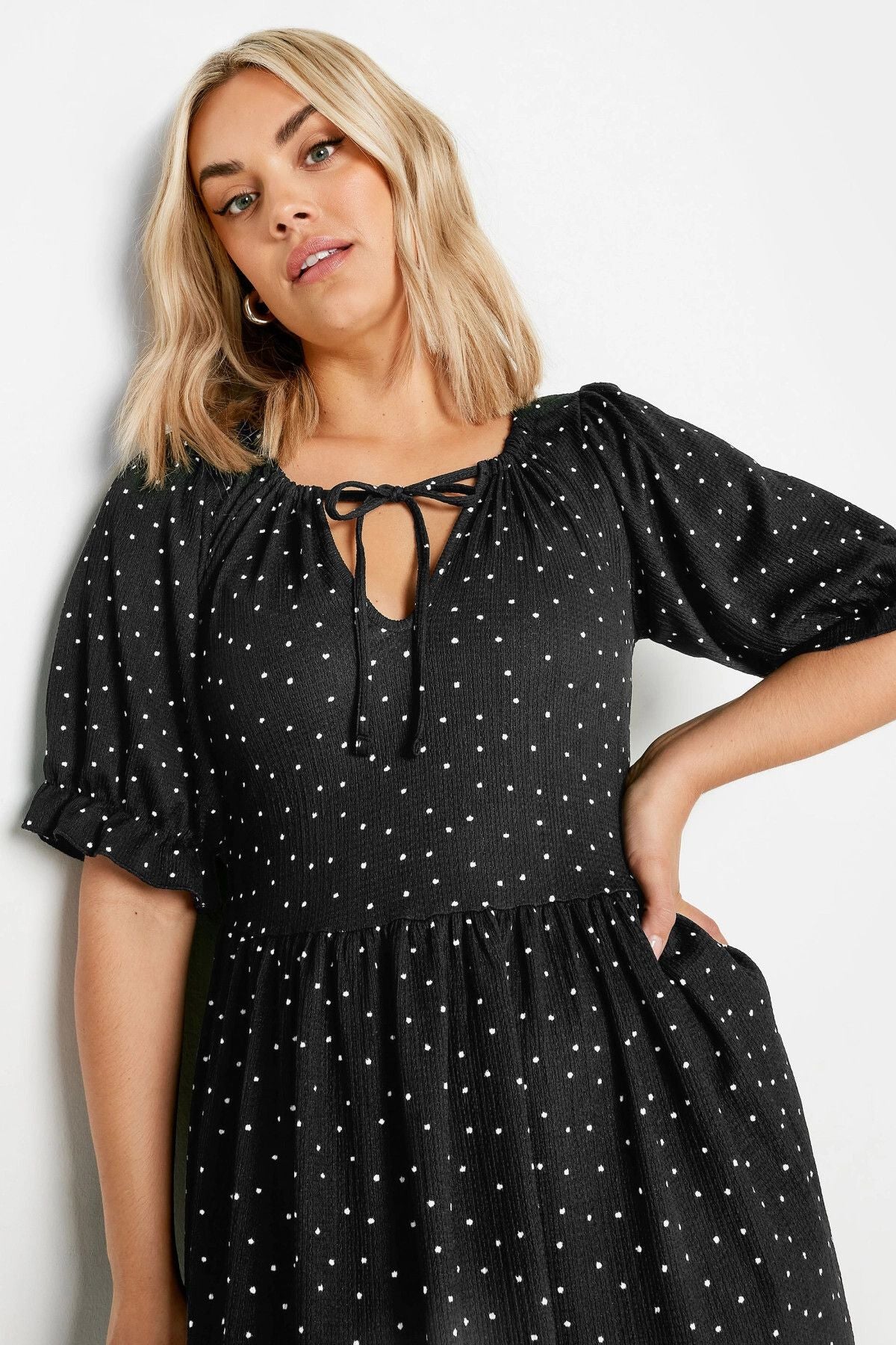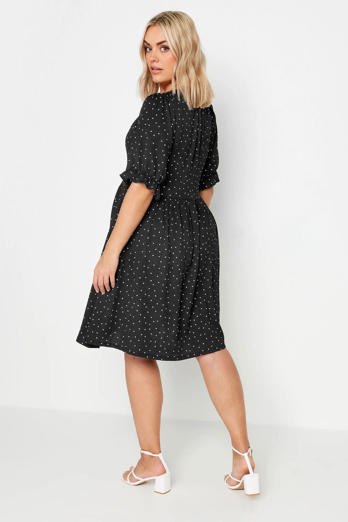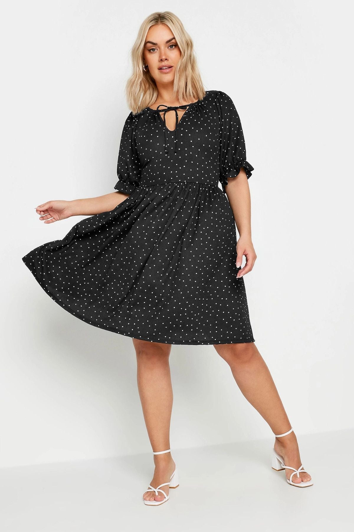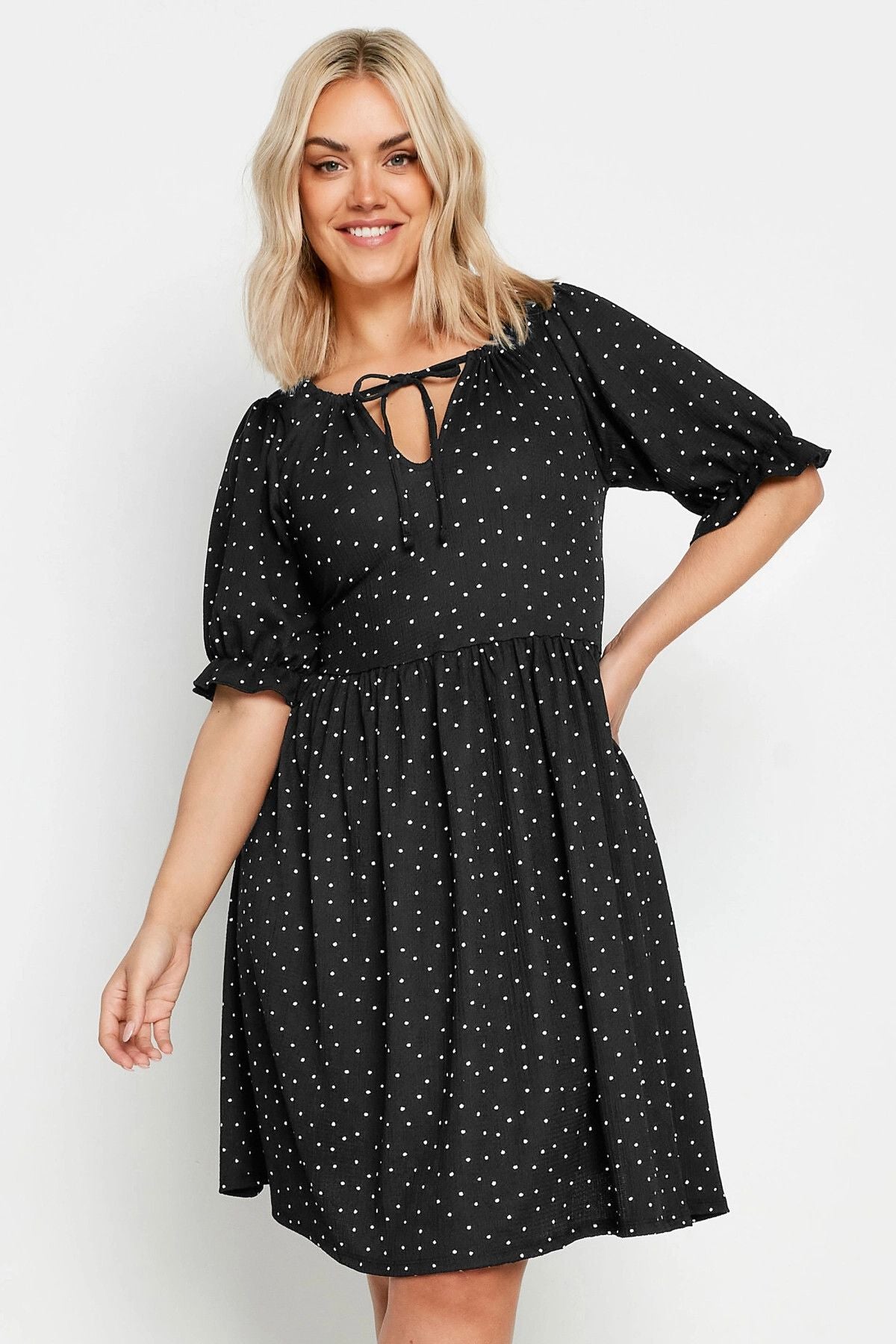 Büyük Beden Bağlama Detaylı Kolları Fırfırlı Puantiye Desenli Elbise 303150