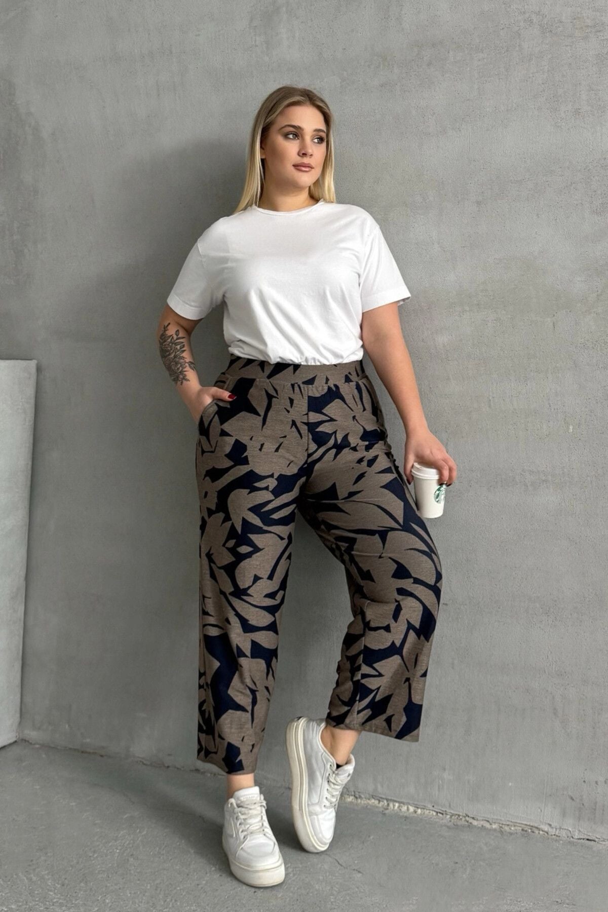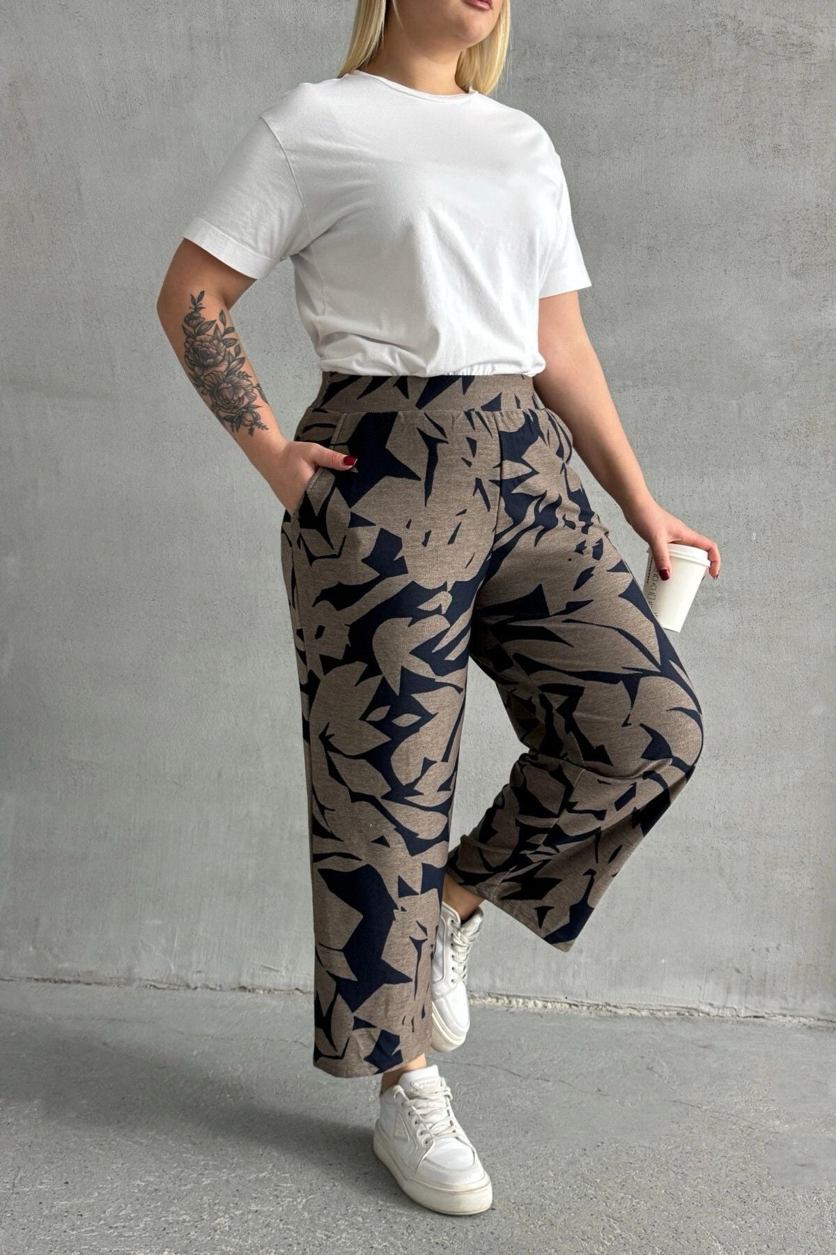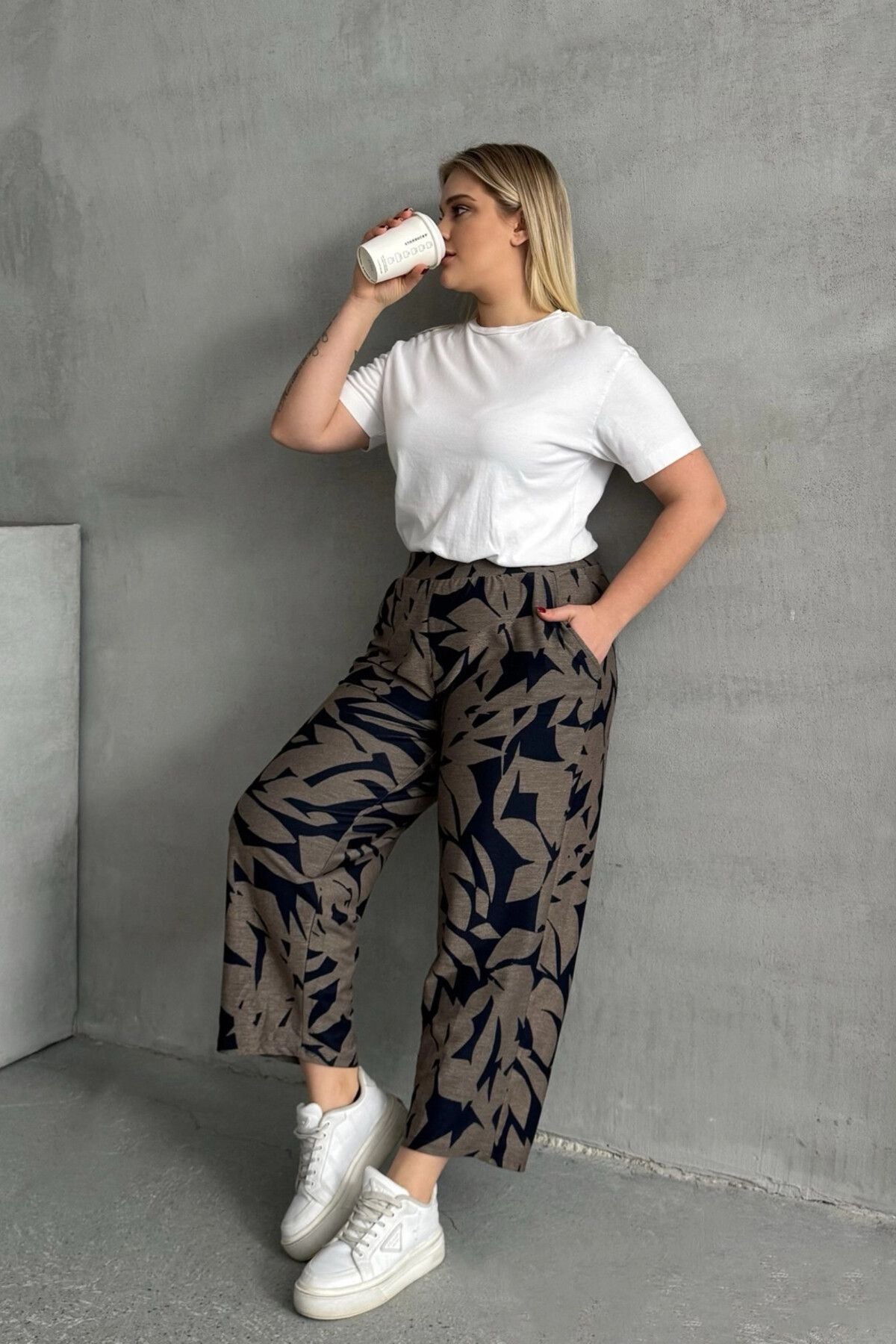 Büyük Beden Beli Lastikli Bol Paça Desenli Cepli Pantolon 74-109