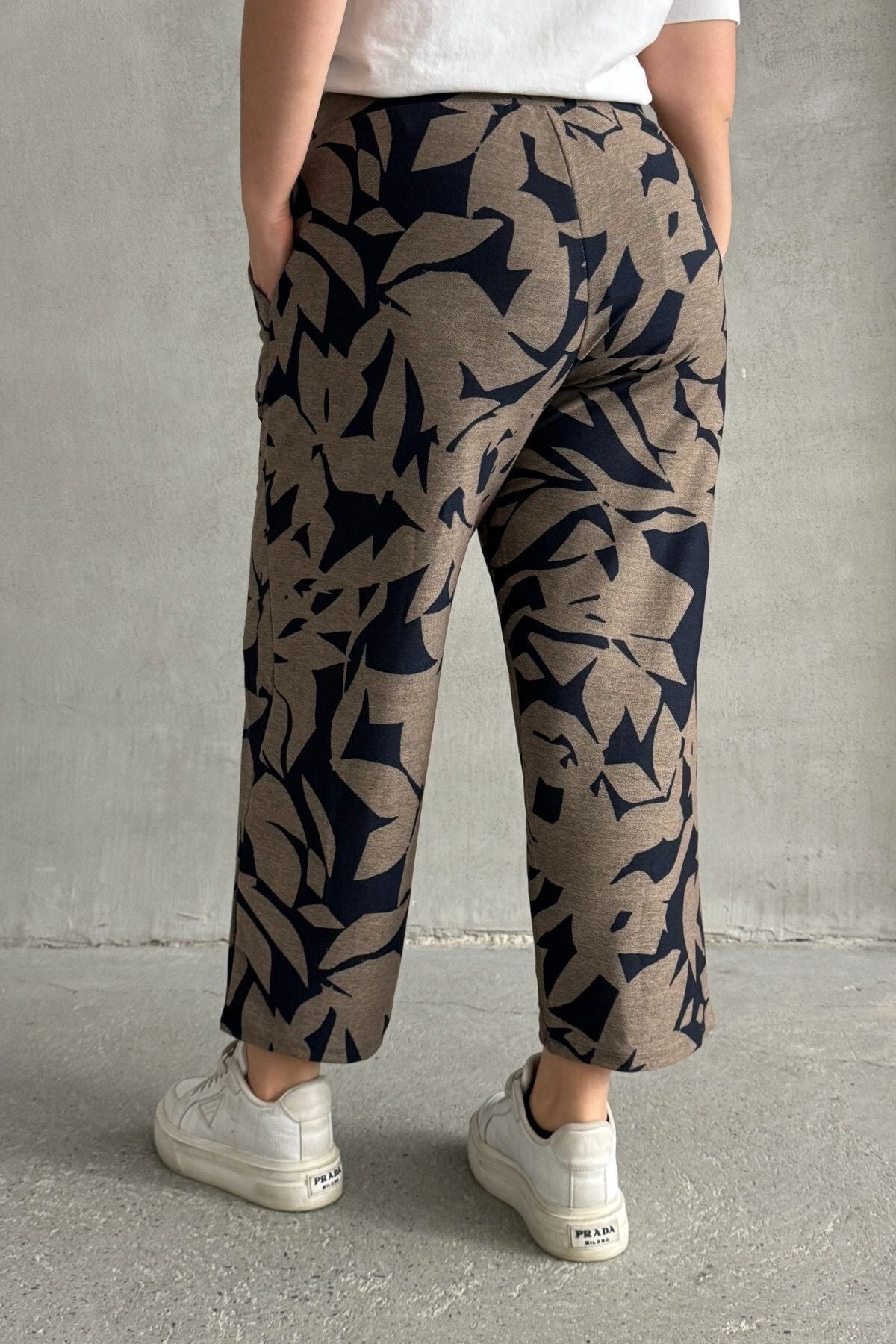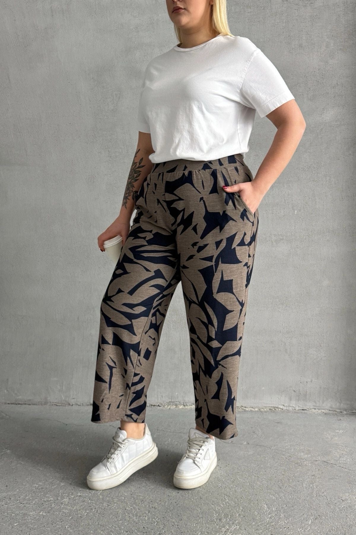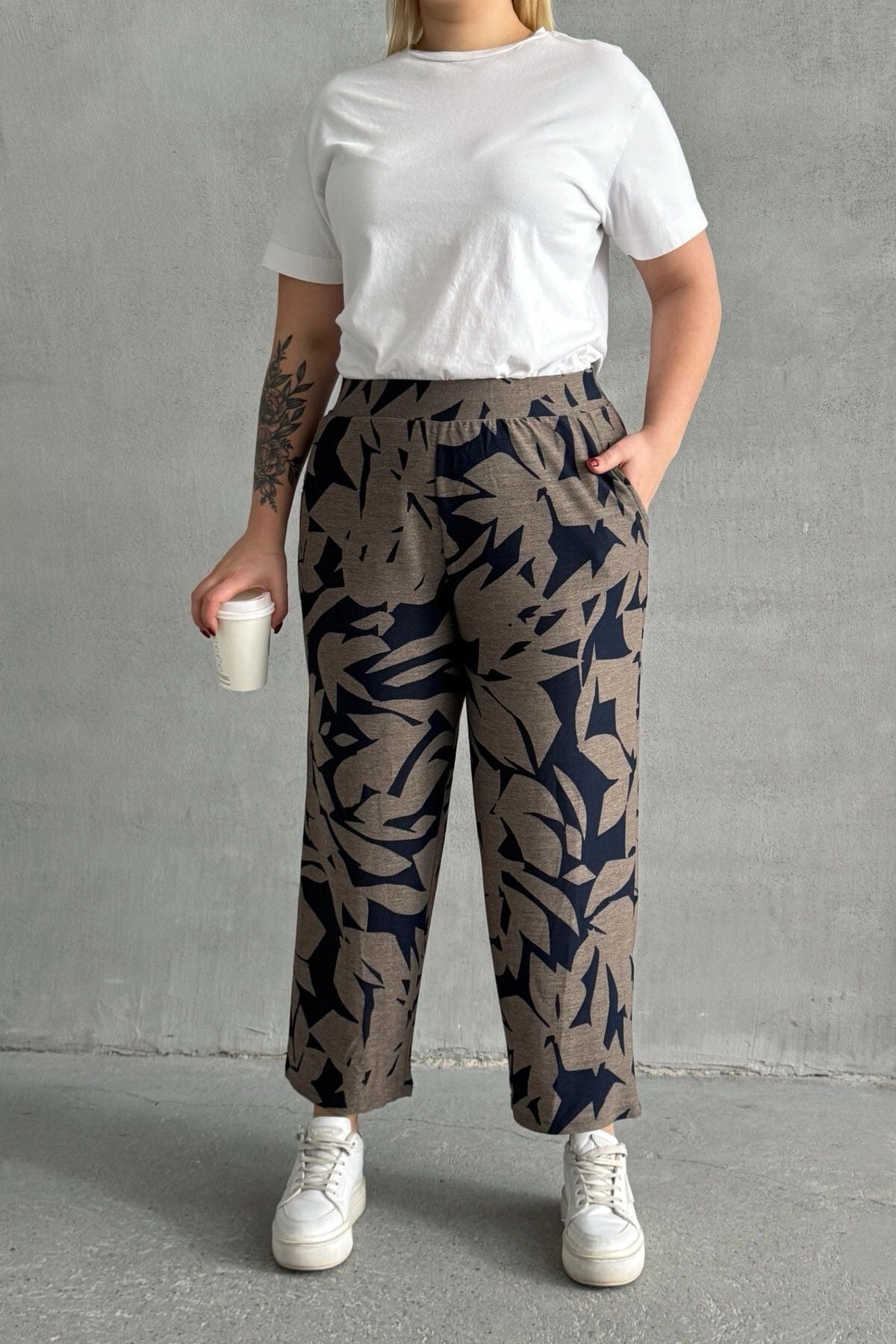 Büyük Beden Beli Lastikli Bol Paça Desenli Cepli Pantolon 74-109