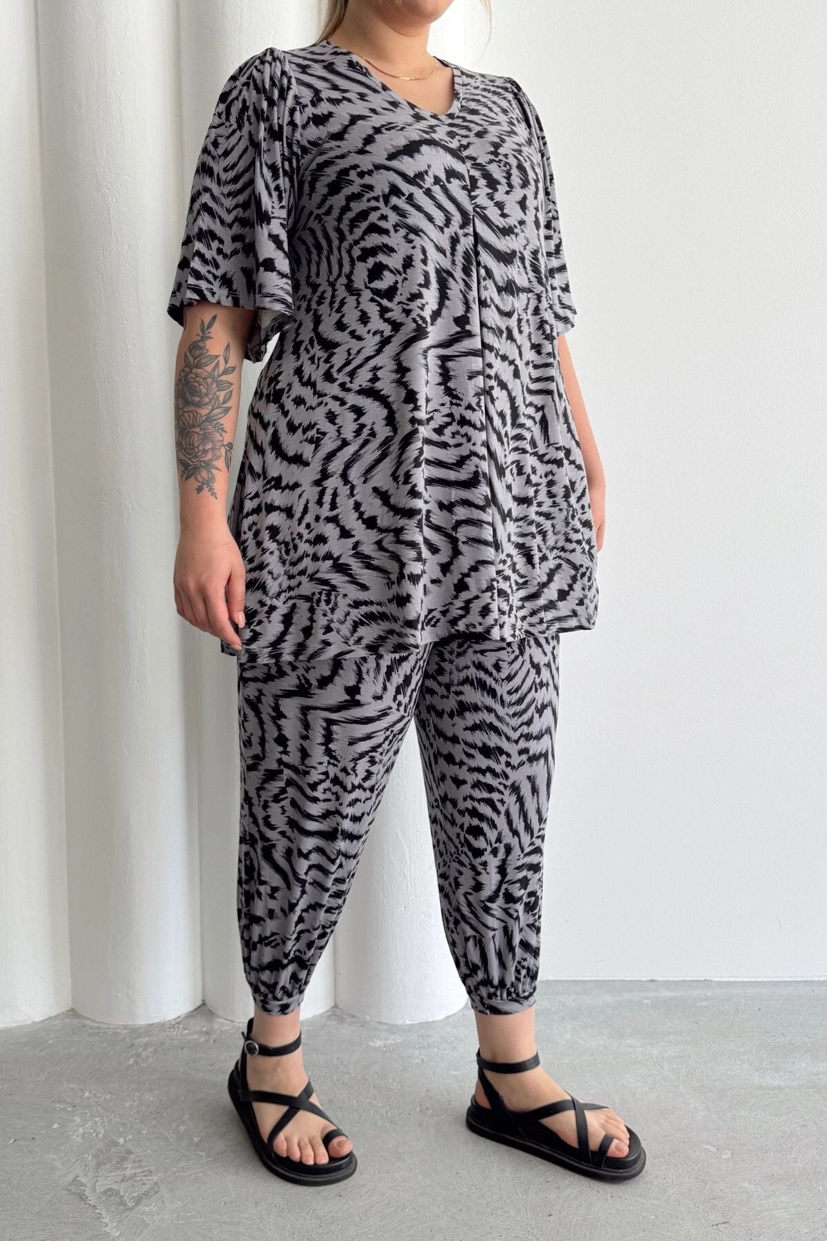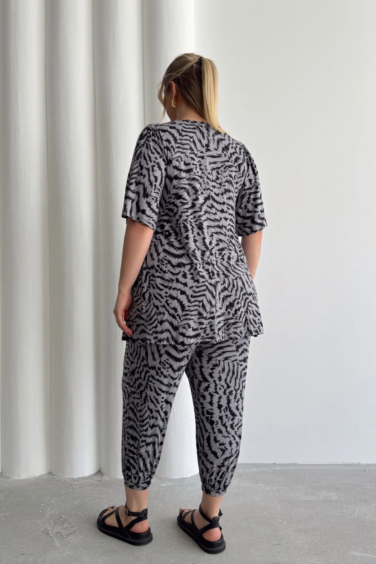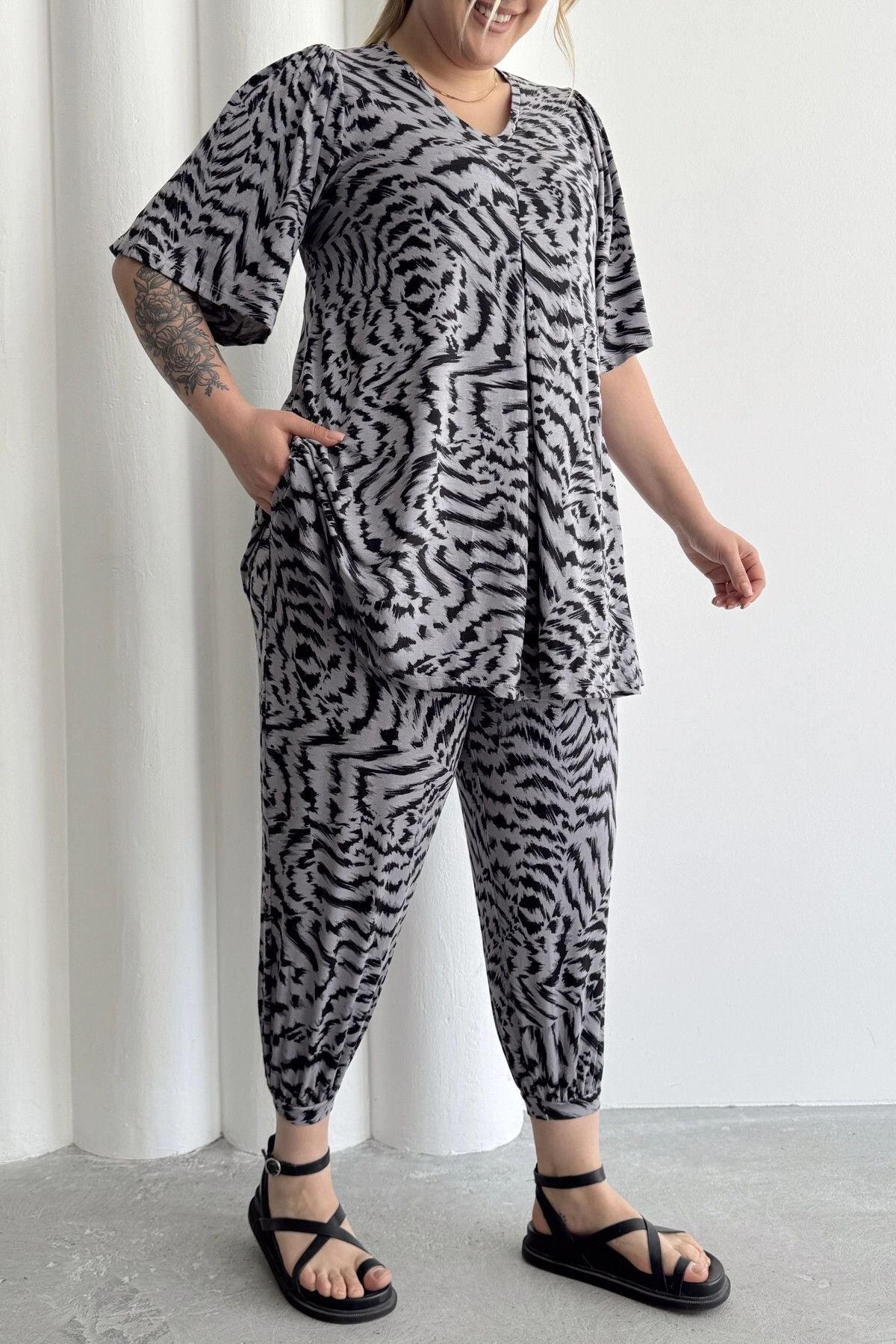 Büyük Beden Beli ve Paçası Lastikli Cepli Desenli Şalvar Pantolon 99-3