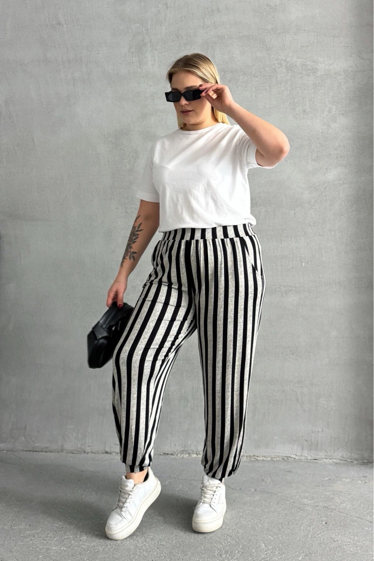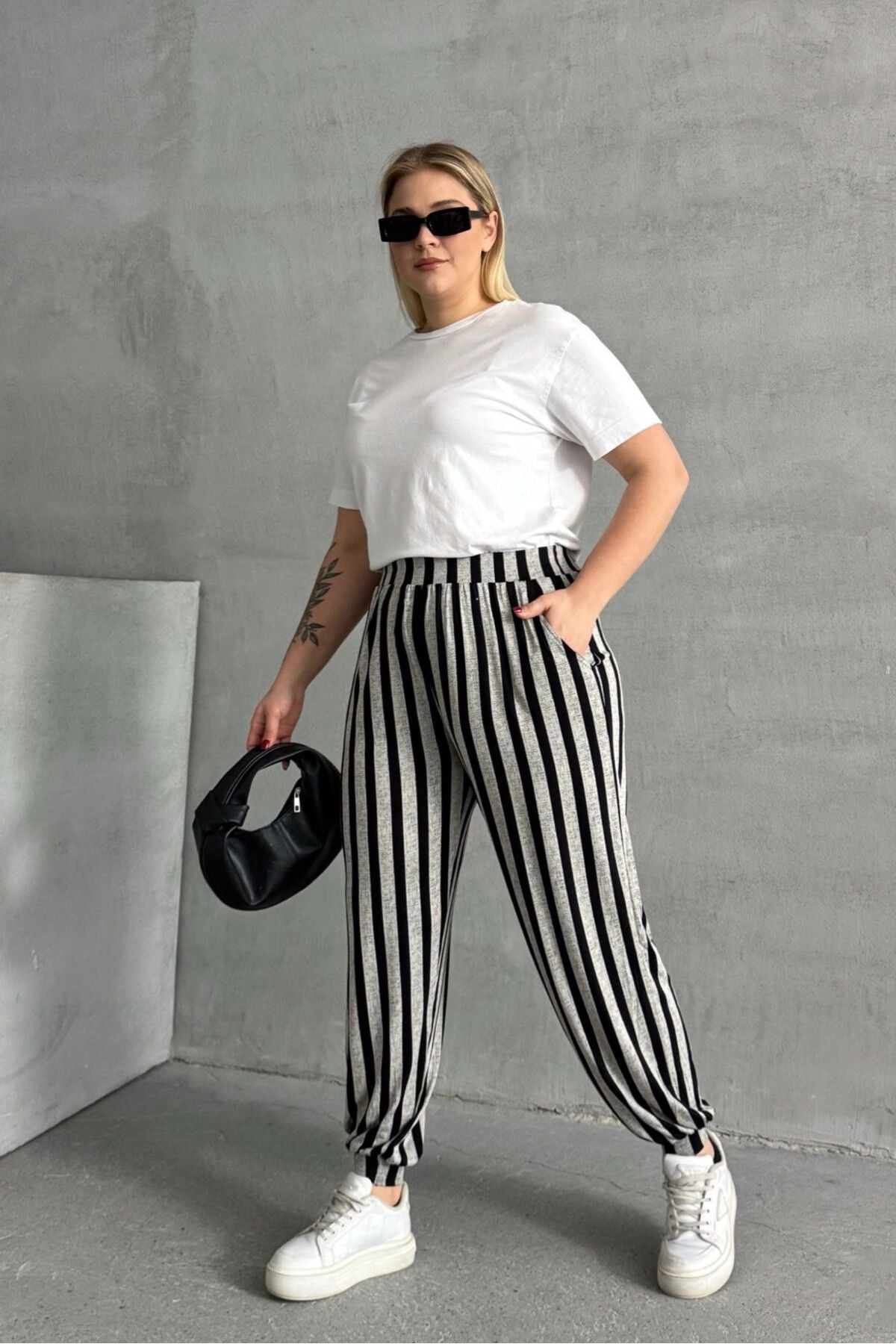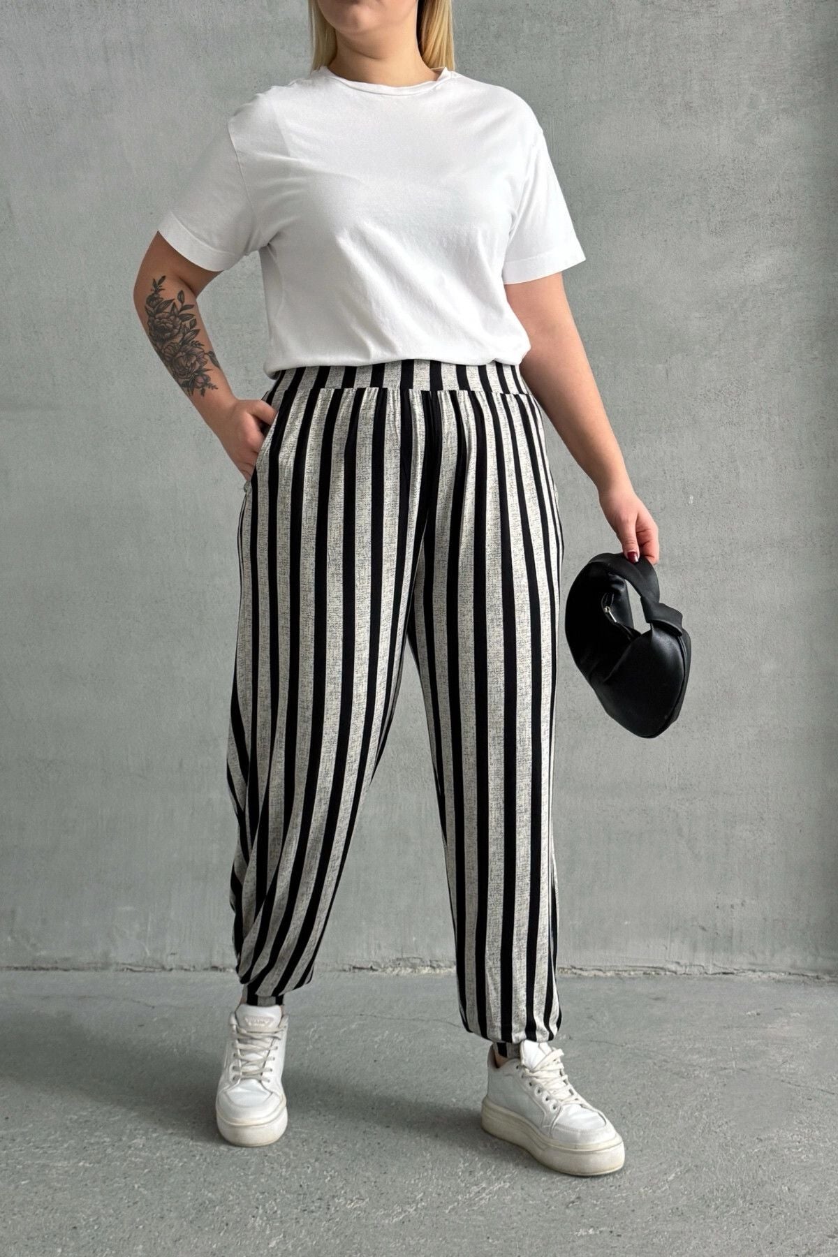 Büyük Beden Beli ve Paçası Lastikli Çizgili Cepli Pantolon 89-70