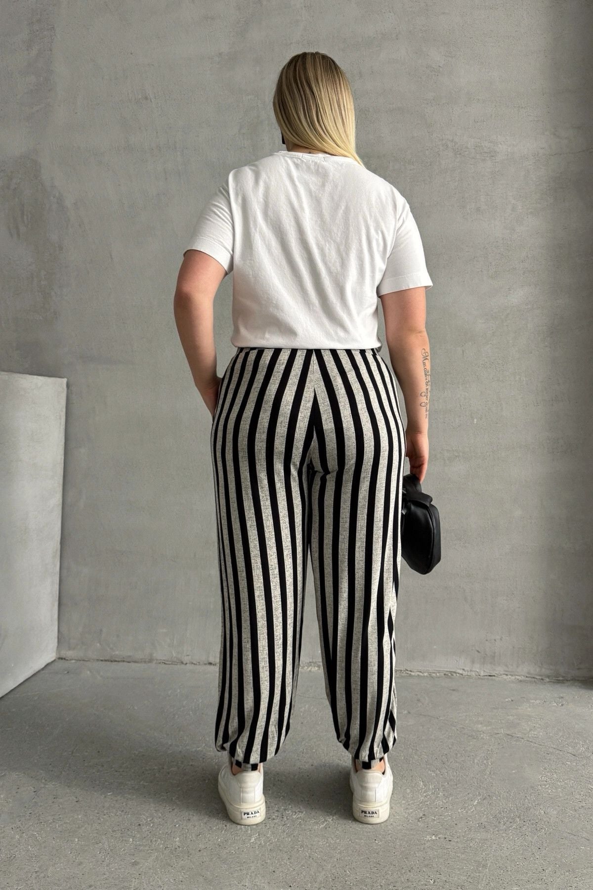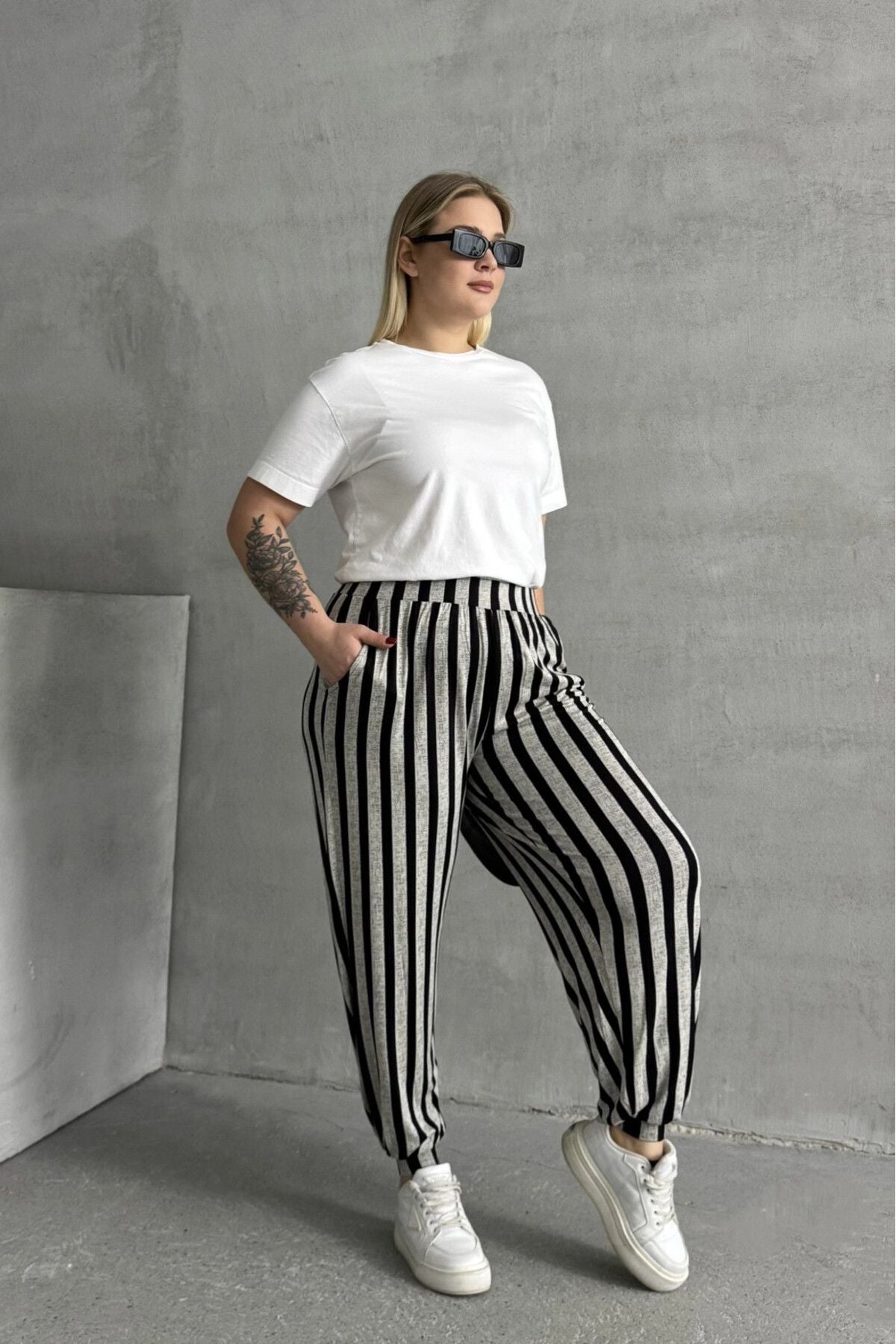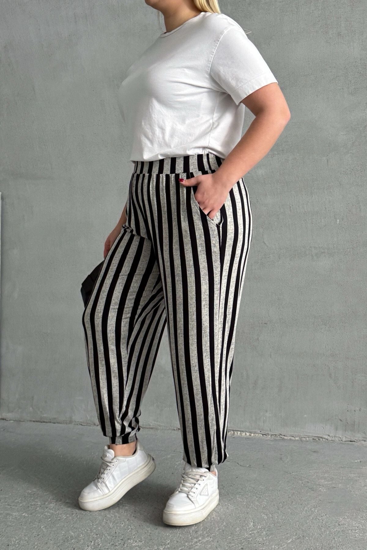 Büyük Beden Beli ve Paçası Lastikli Çizgili Cepli Pantolon 89-70