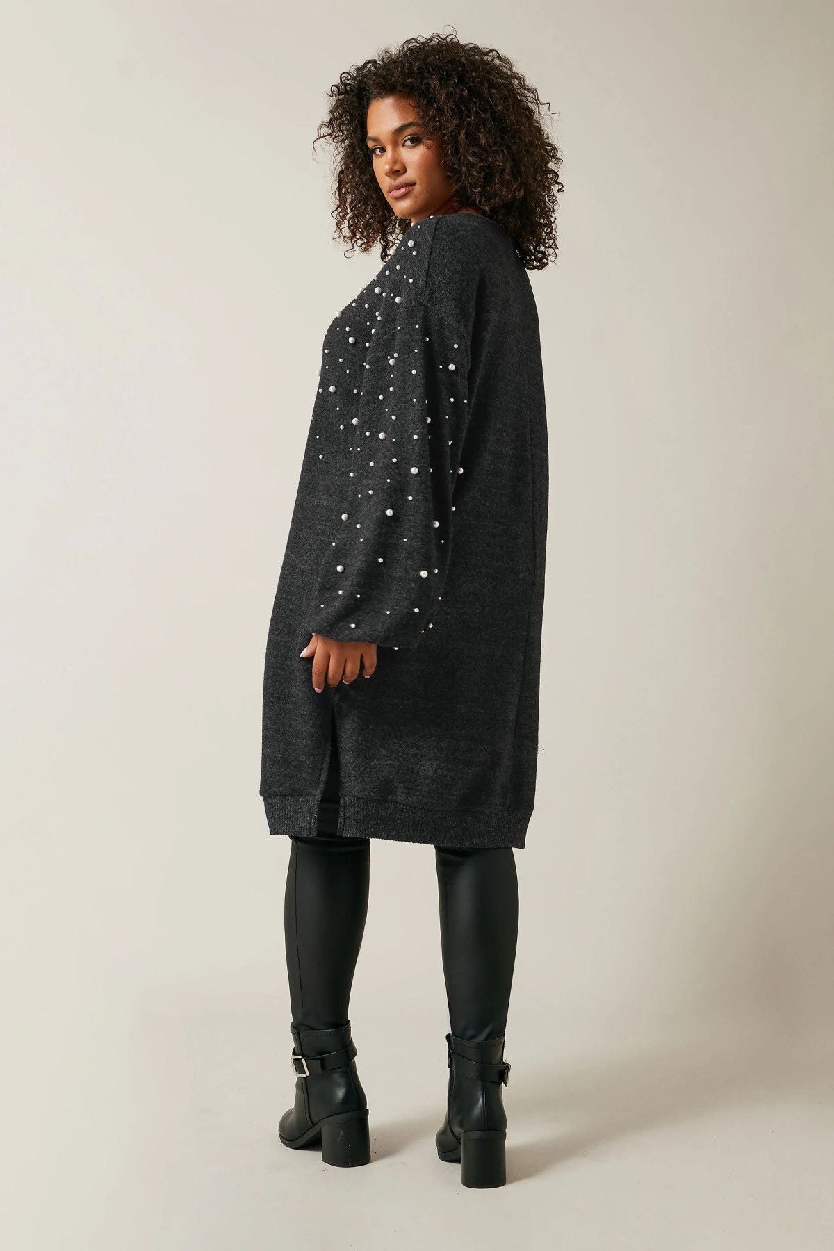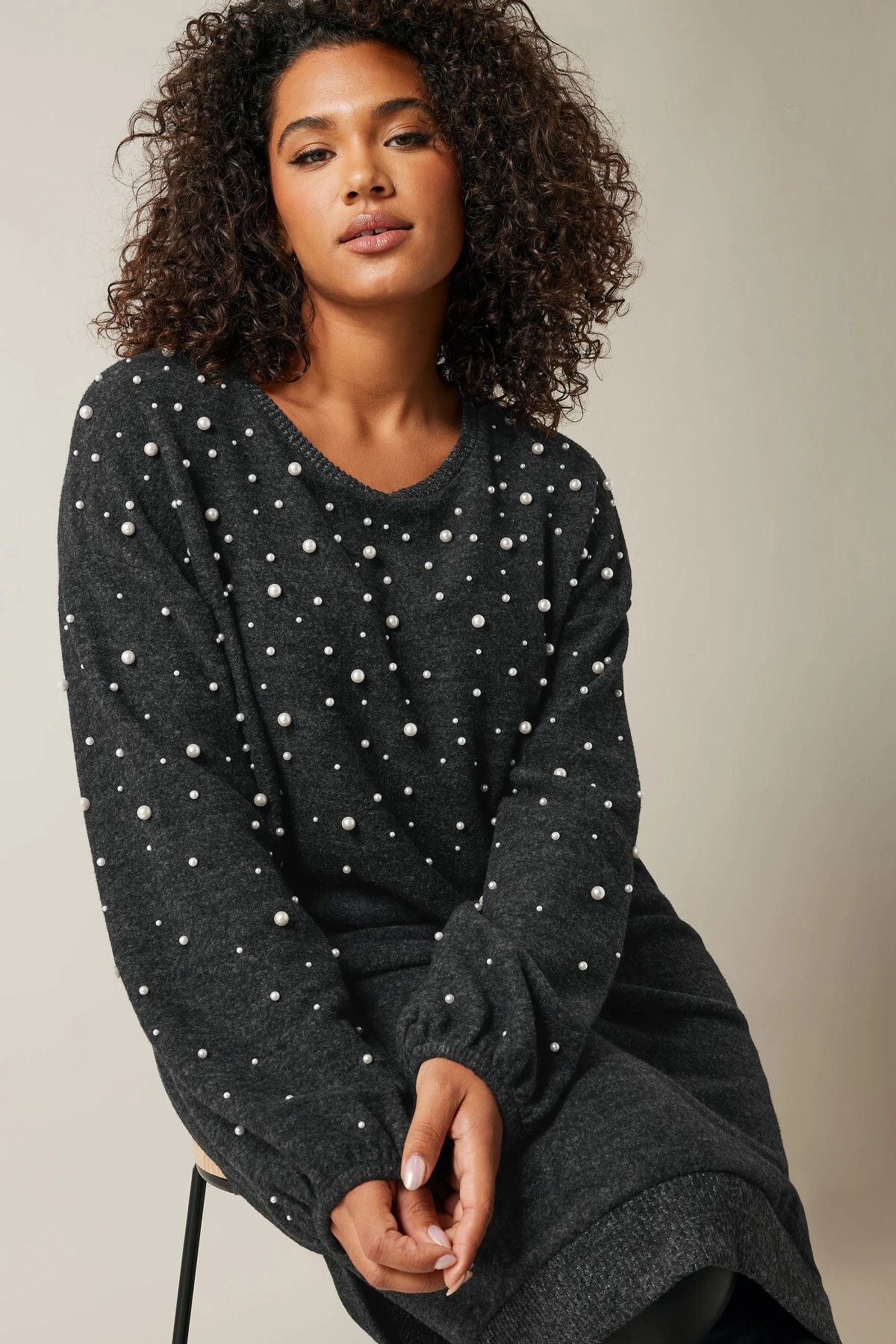 Büyük Beden Bisiklet Yaka Balon Kol Boncuk İşlemeli Triko Elbise 615670