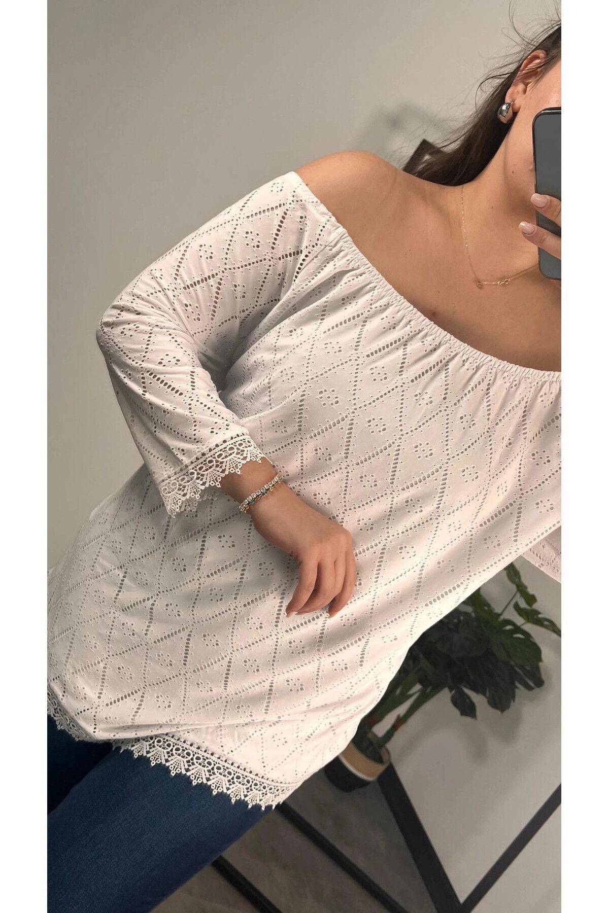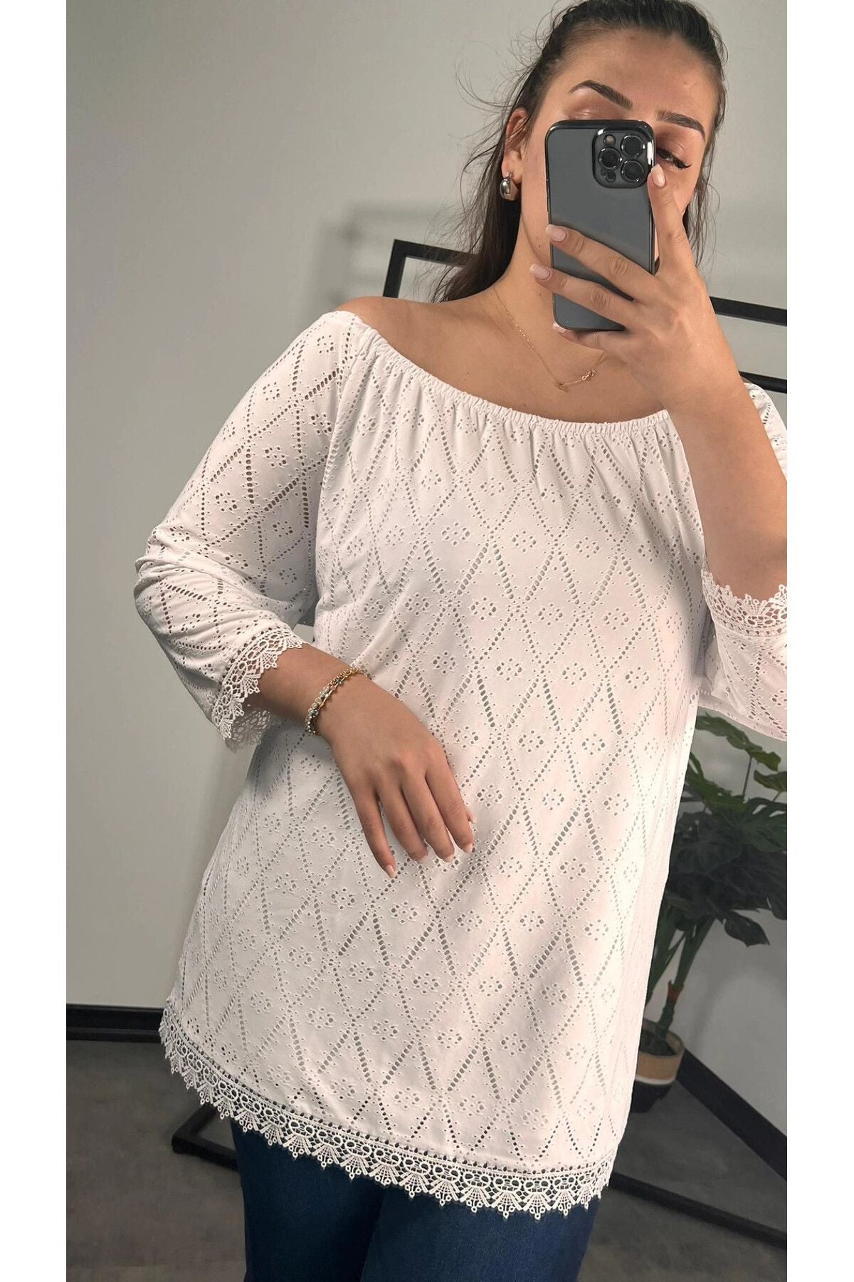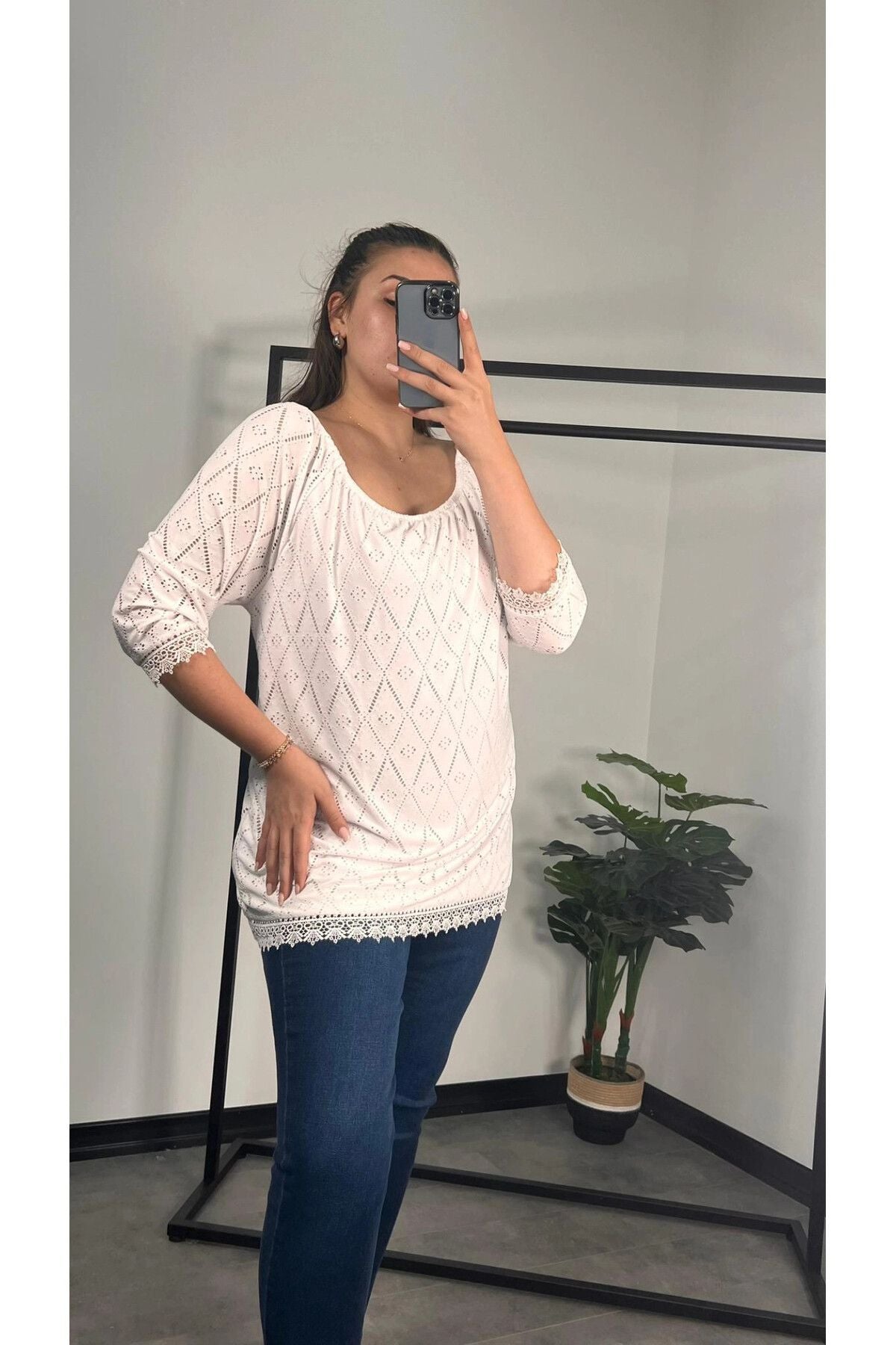 Büyük Beden Bisiklet Yaka Dantel Detaylı Fakir Bol Bluz 301195