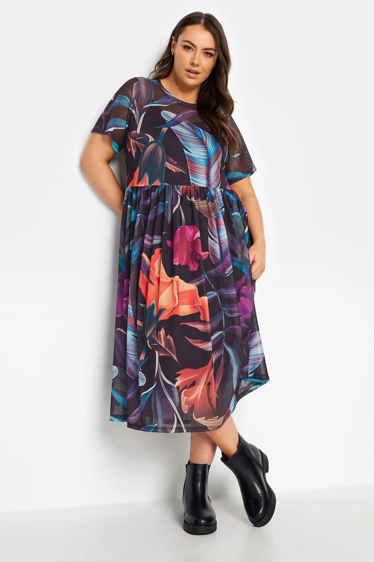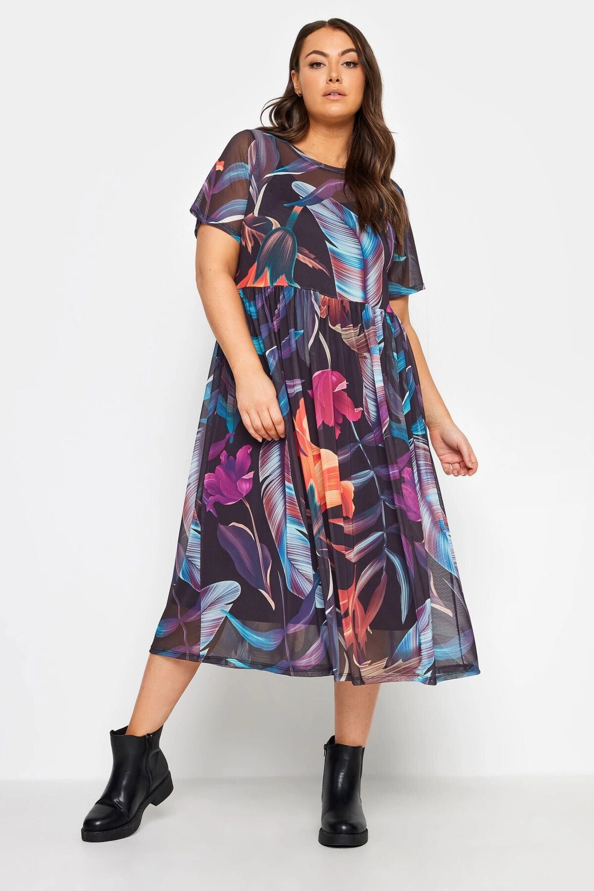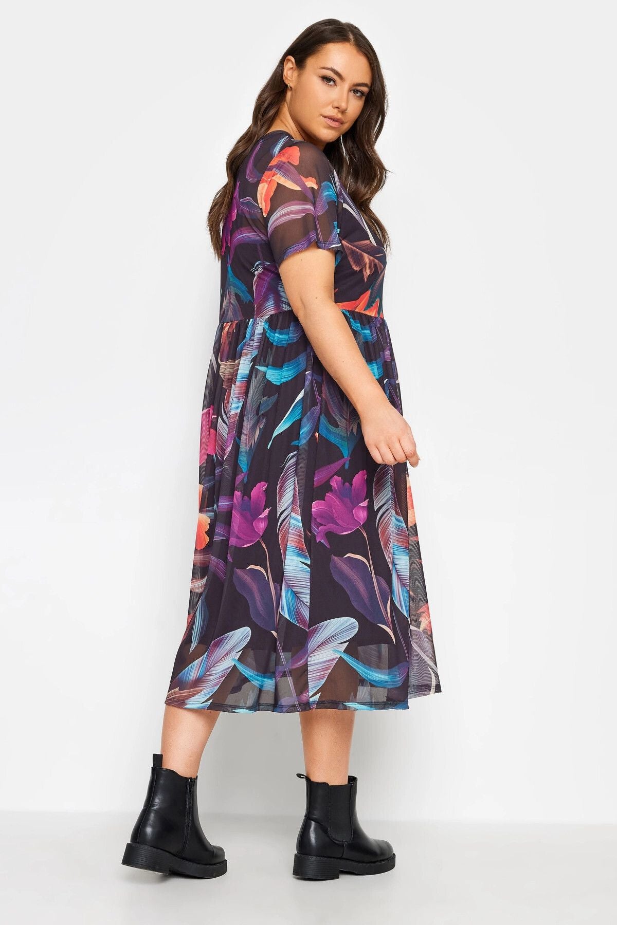 Büyük Beden Bisiklet Yaka İçi Astarlı Desenli Midi Boy Tül Elbise 302708