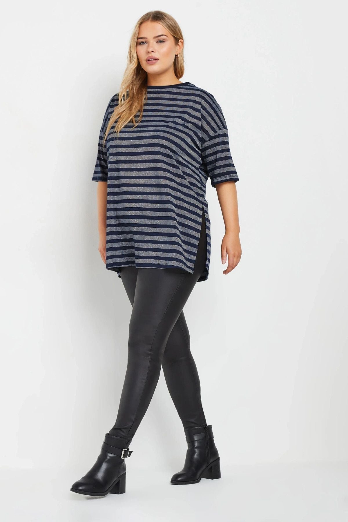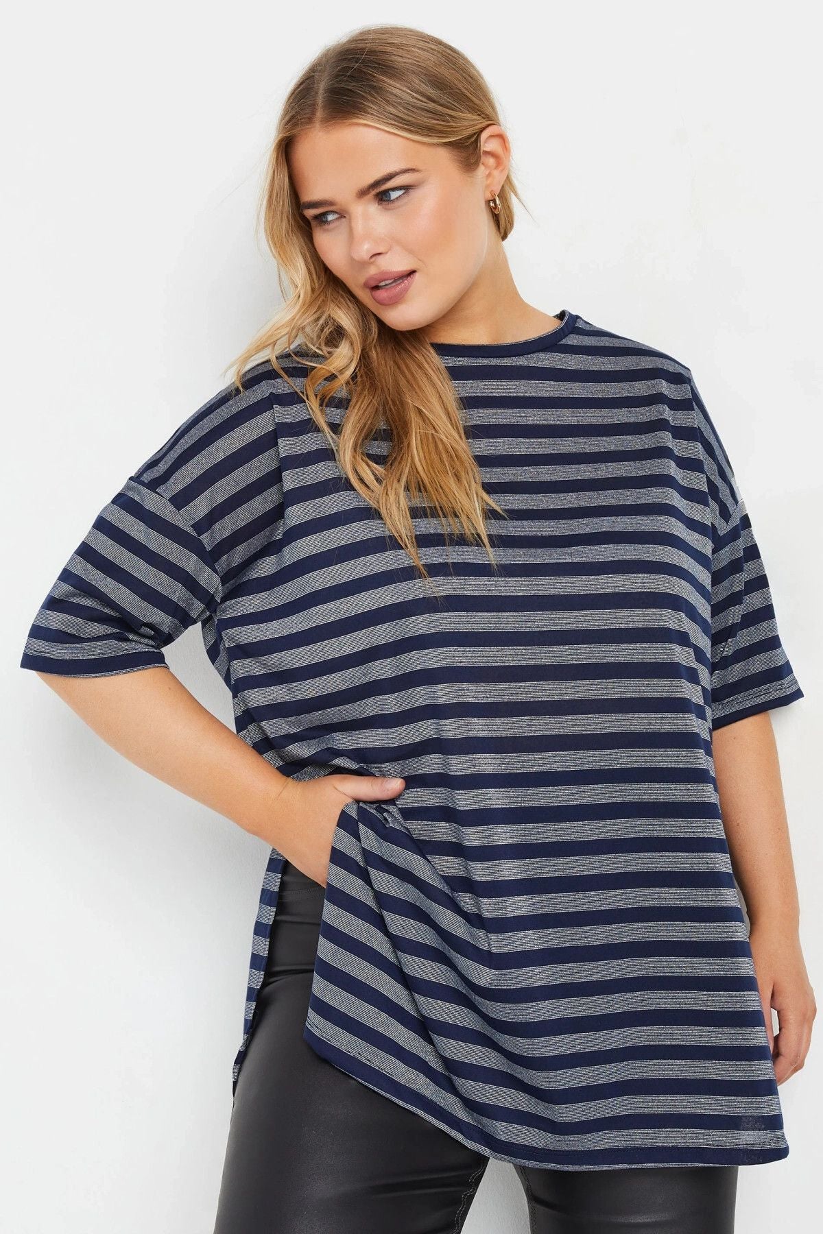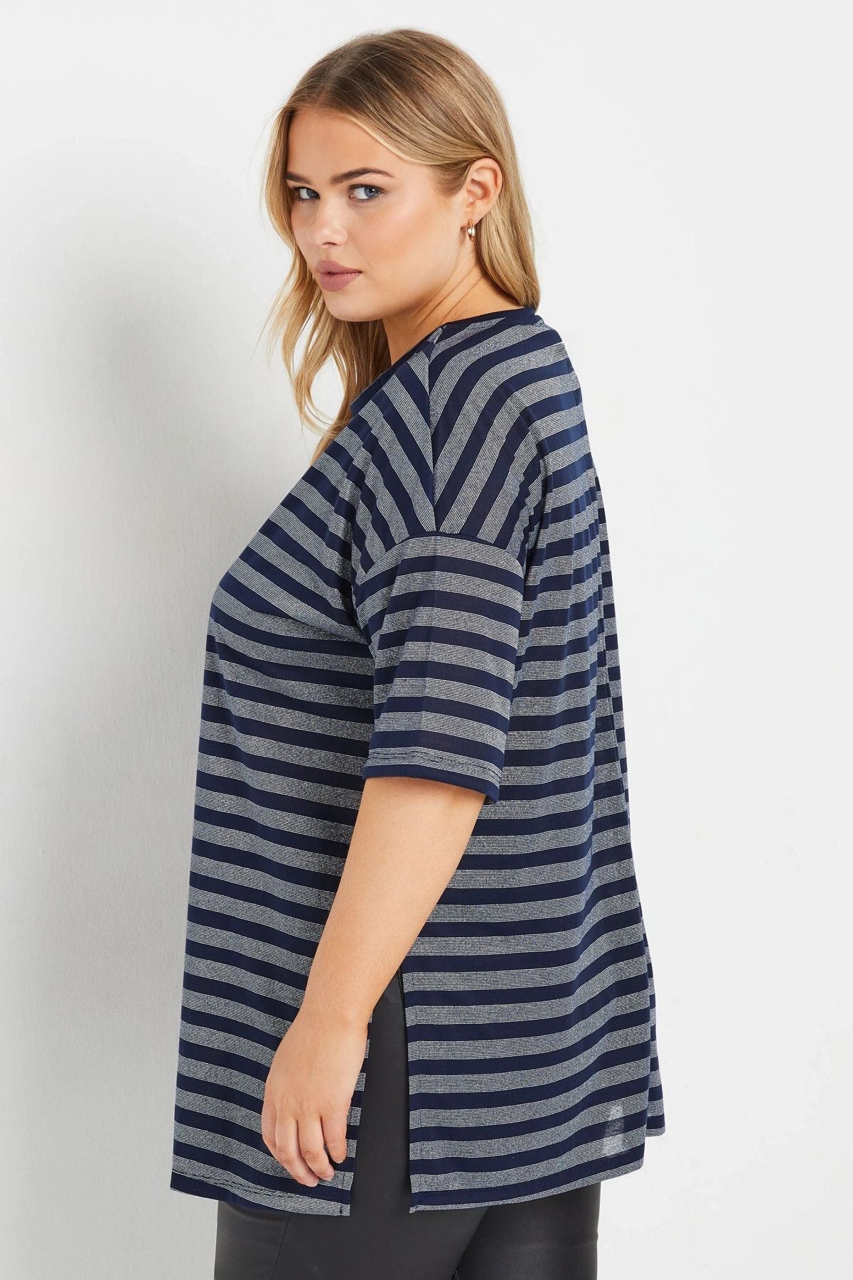 Büyük Beden Bisiklet Yaka Kısa Kollu Çizgili Yanları Yırtmaçlı T-shirt 303611