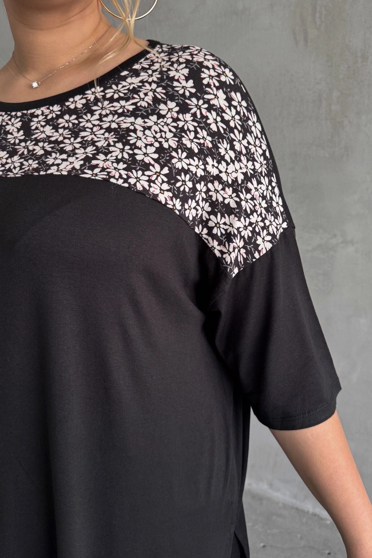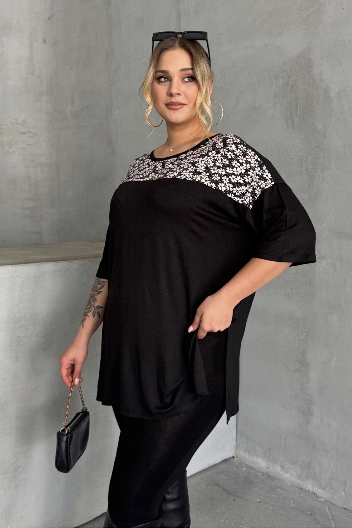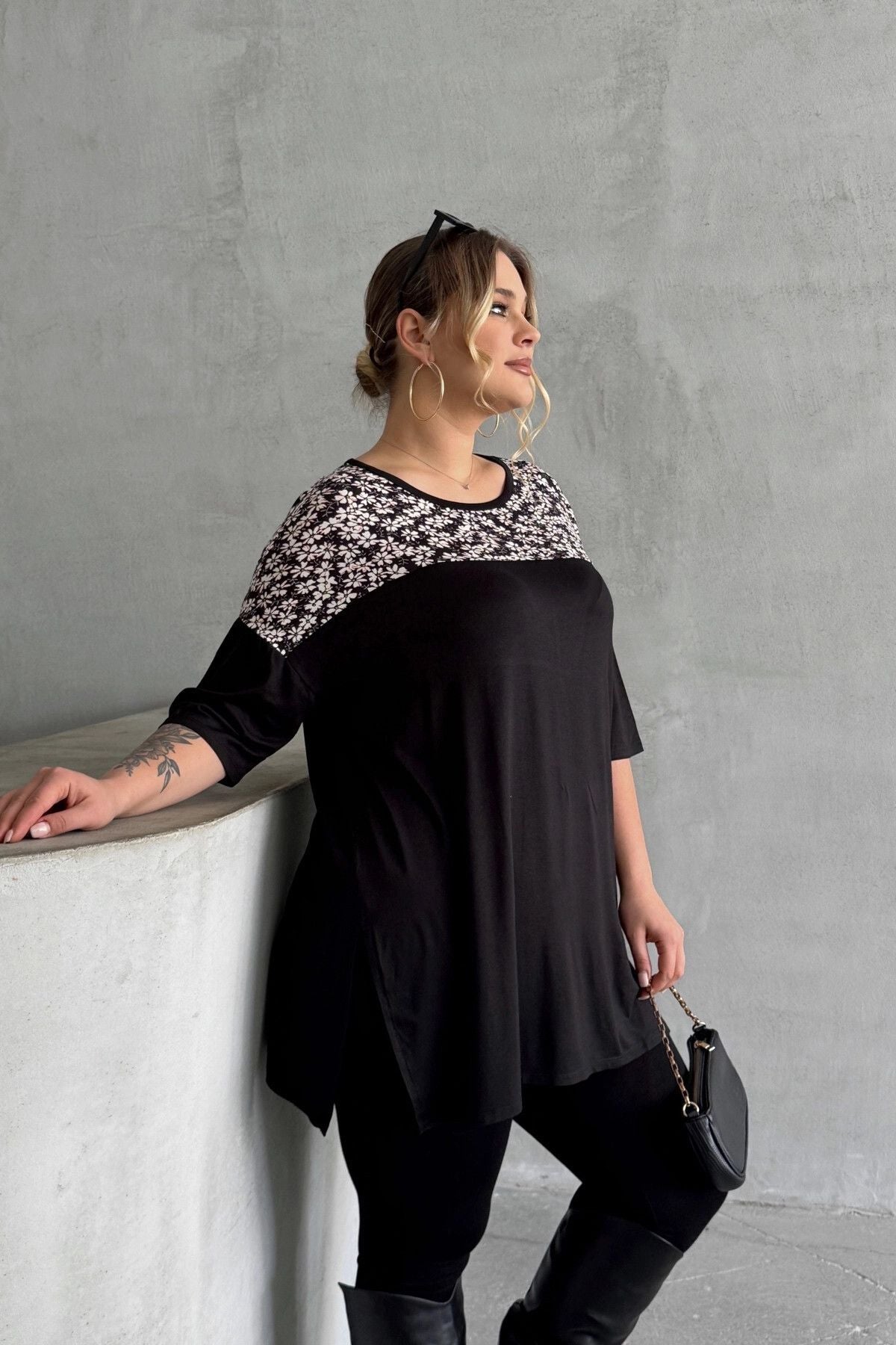 Büyük Beden Bisiklet Yaka Kısa Kollu Yırtmaç Detaylı Desenli Bluz 301623