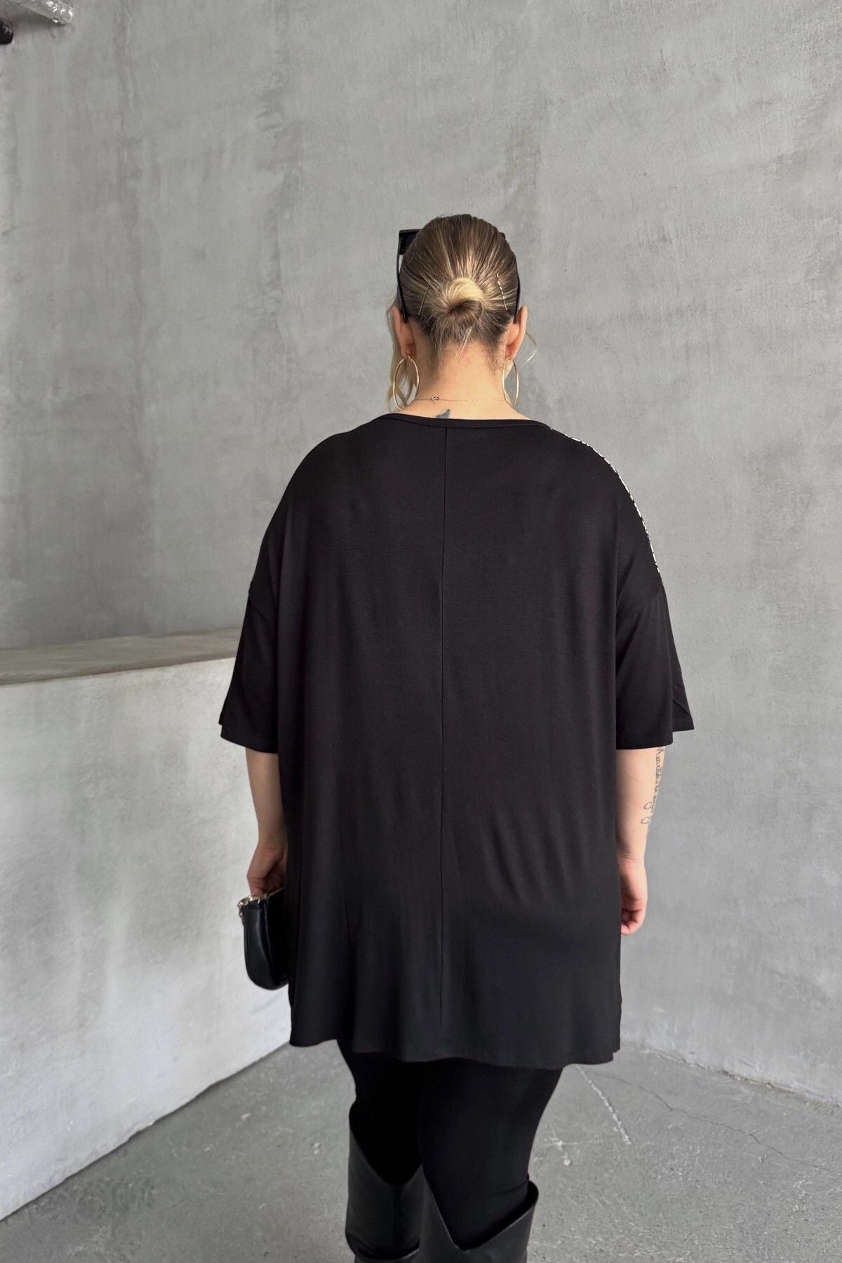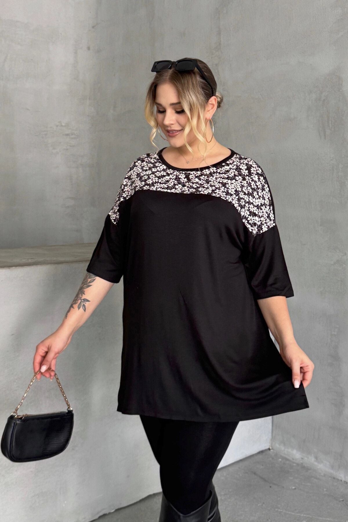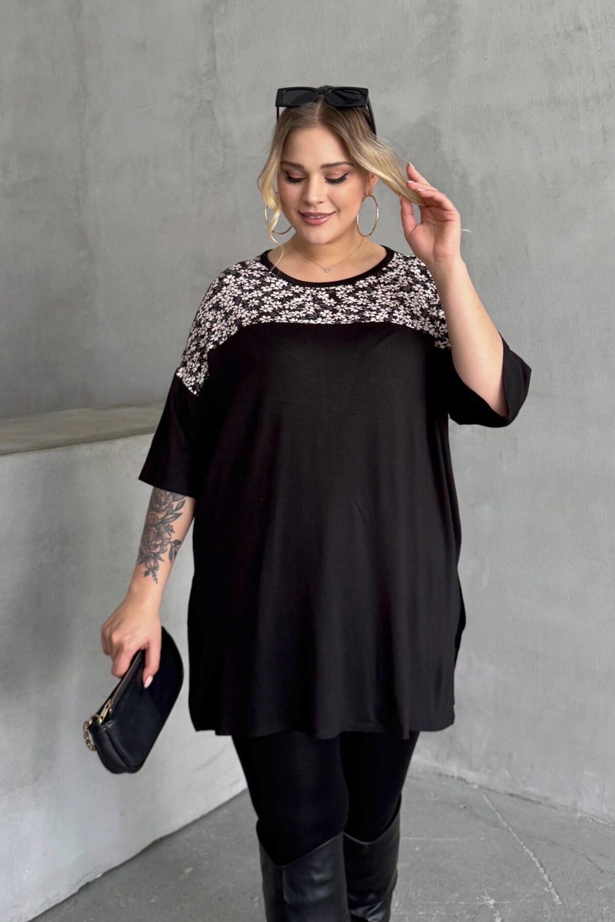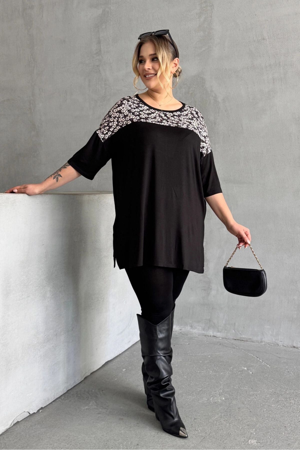 Büyük Beden Bisiklet Yaka Kısa Kollu Yırtmaç Detaylı Desenli Bluz 301623