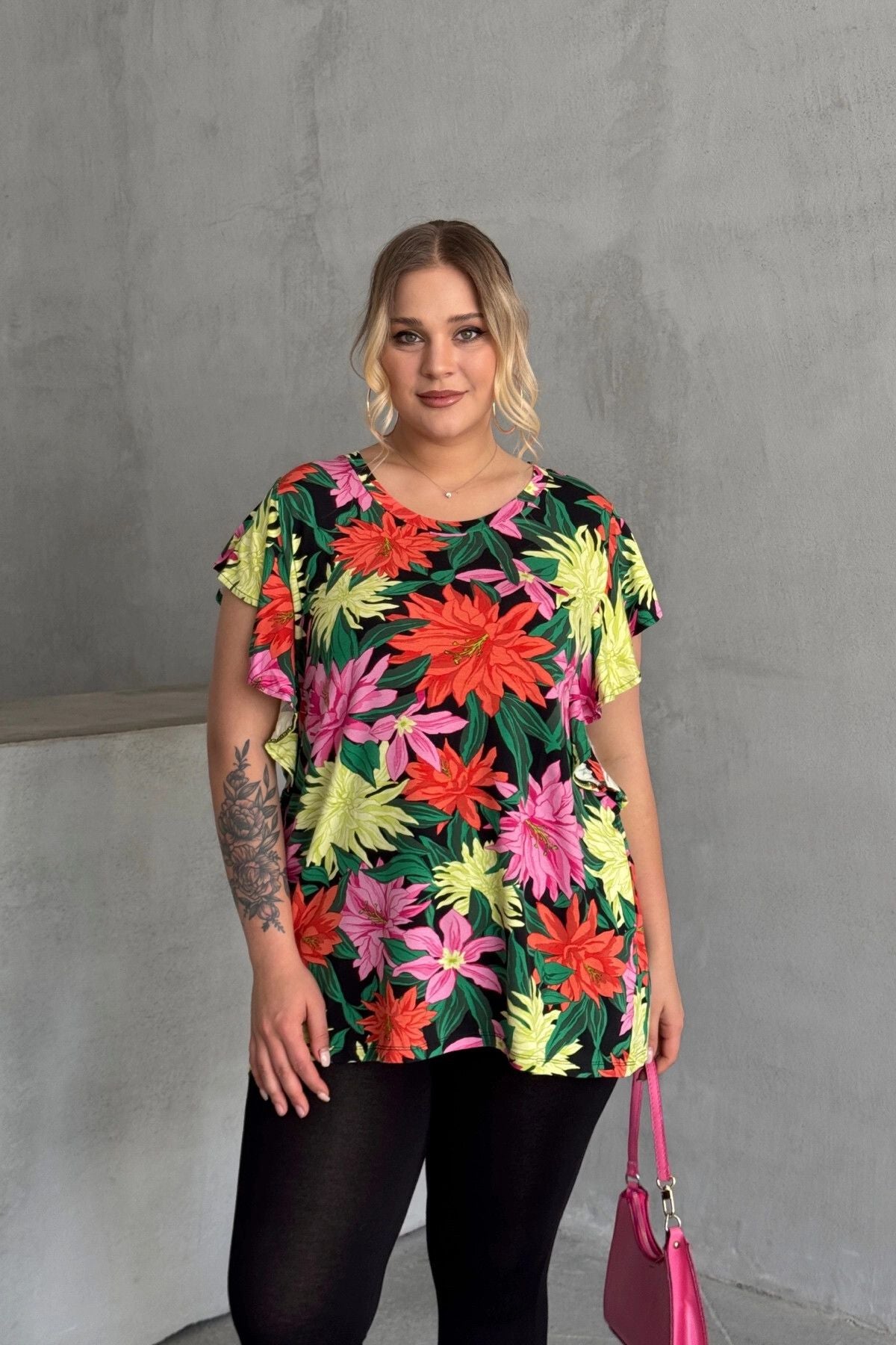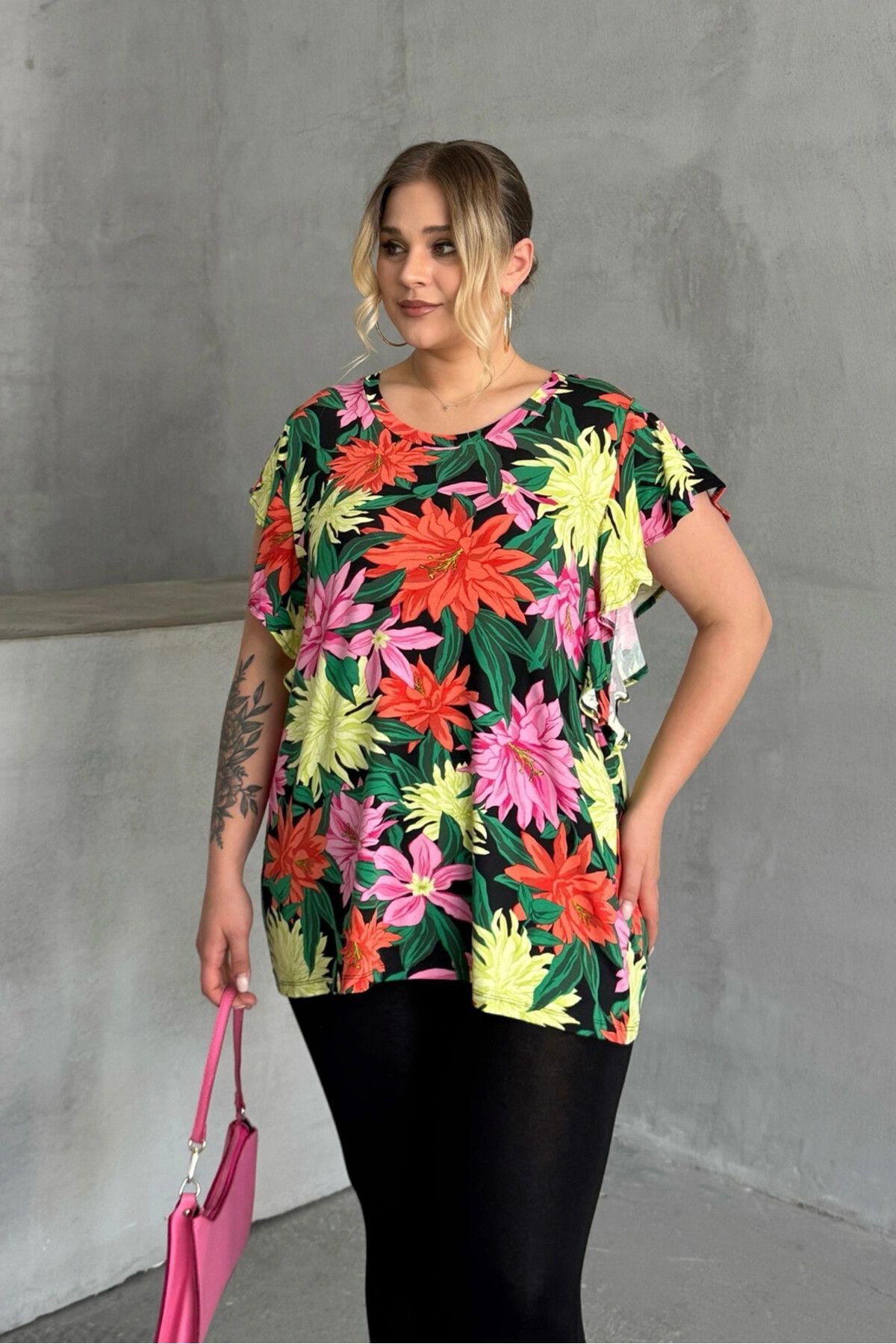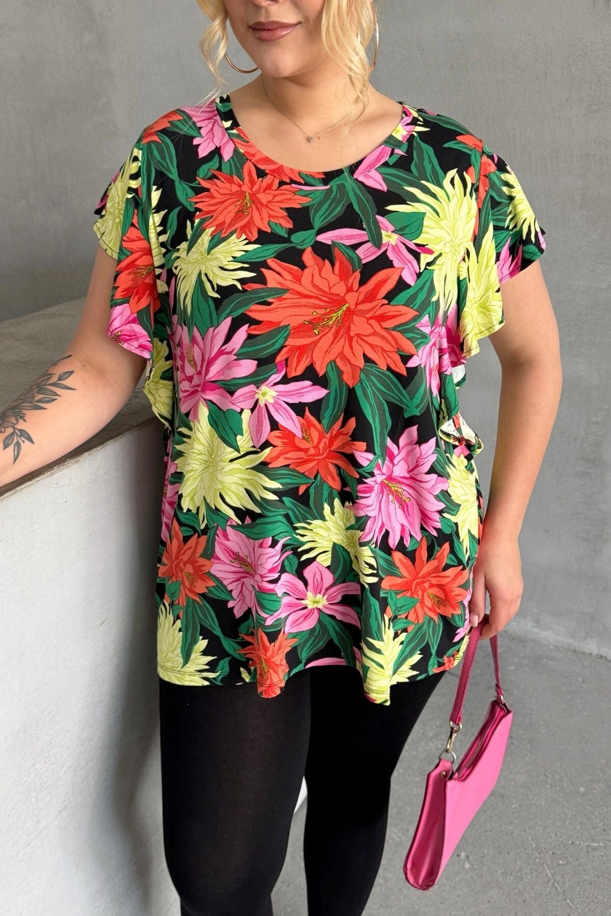 Büyük Beden Bisiklet Yaka Kolları Fırfır Detaylı Çiçek Desenli Bluz 1060
