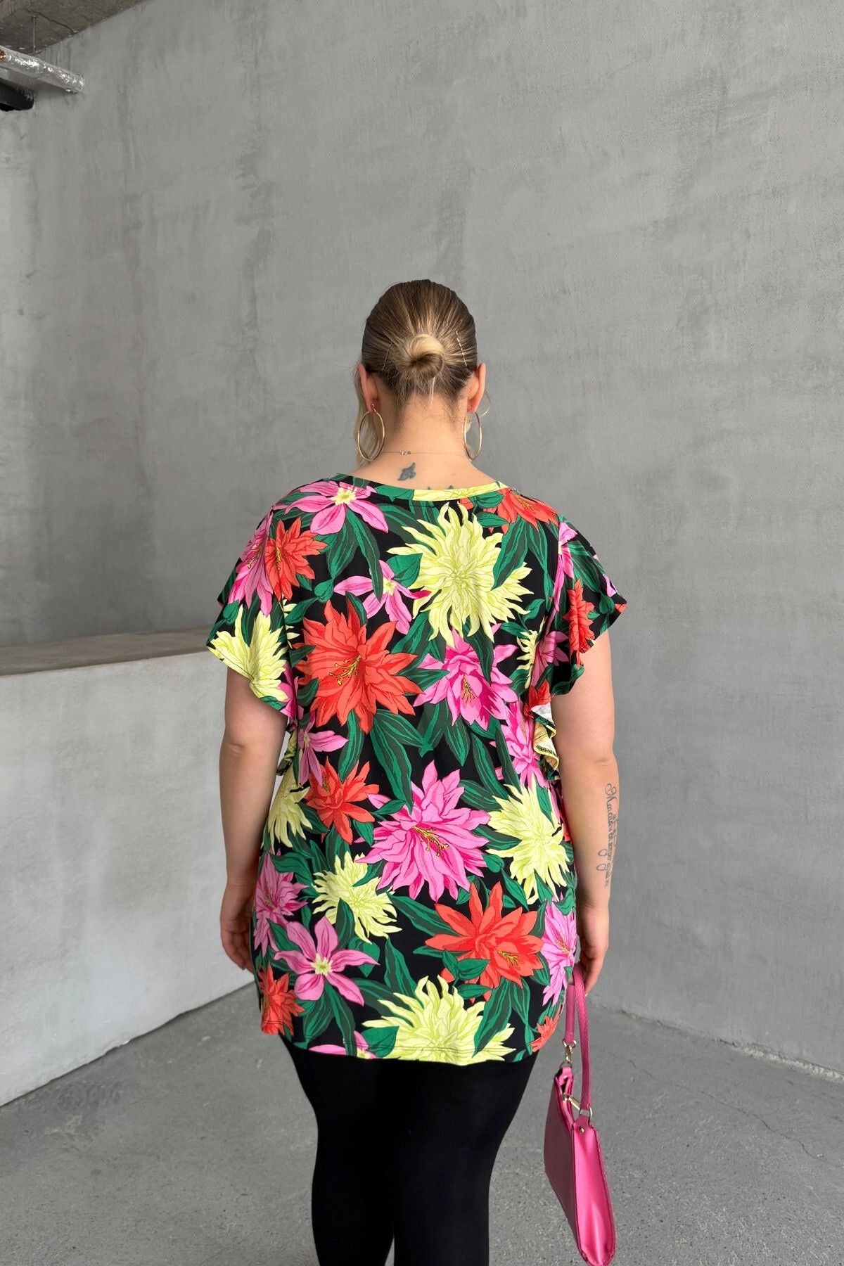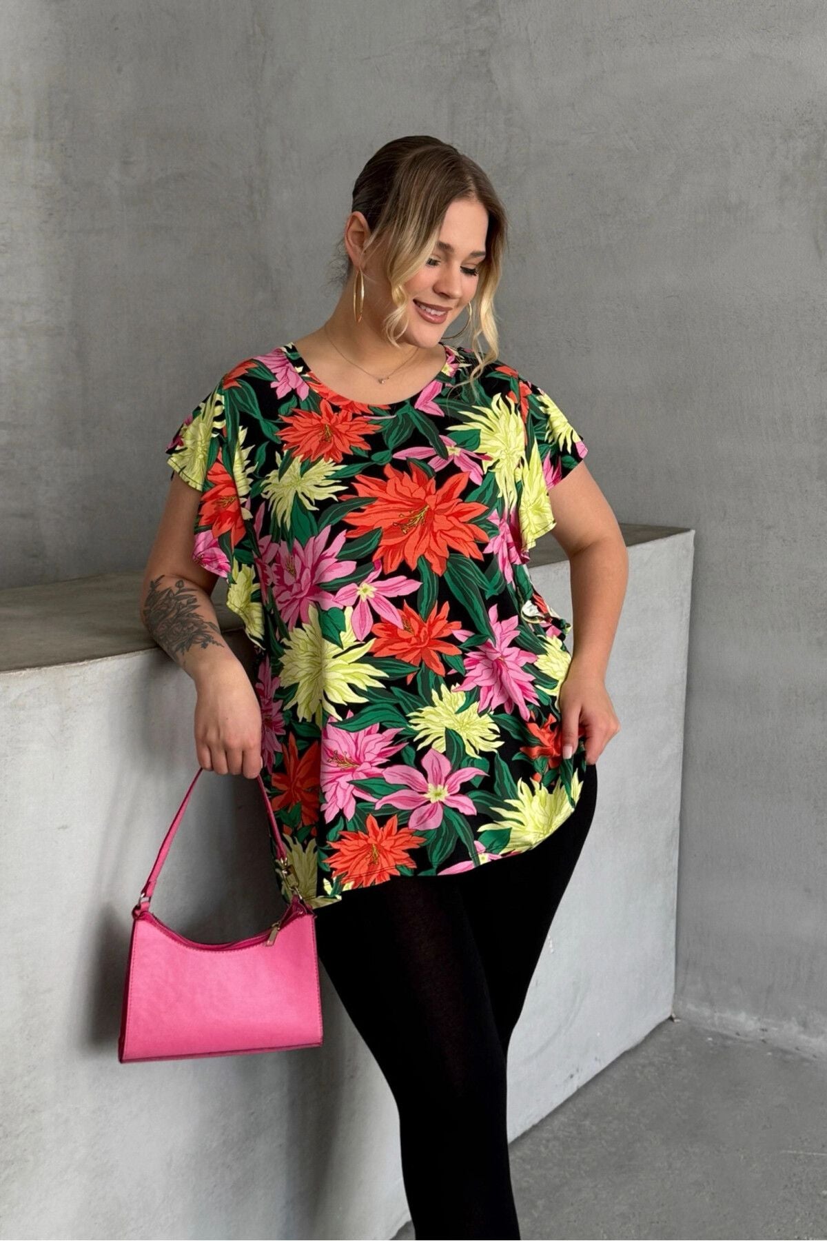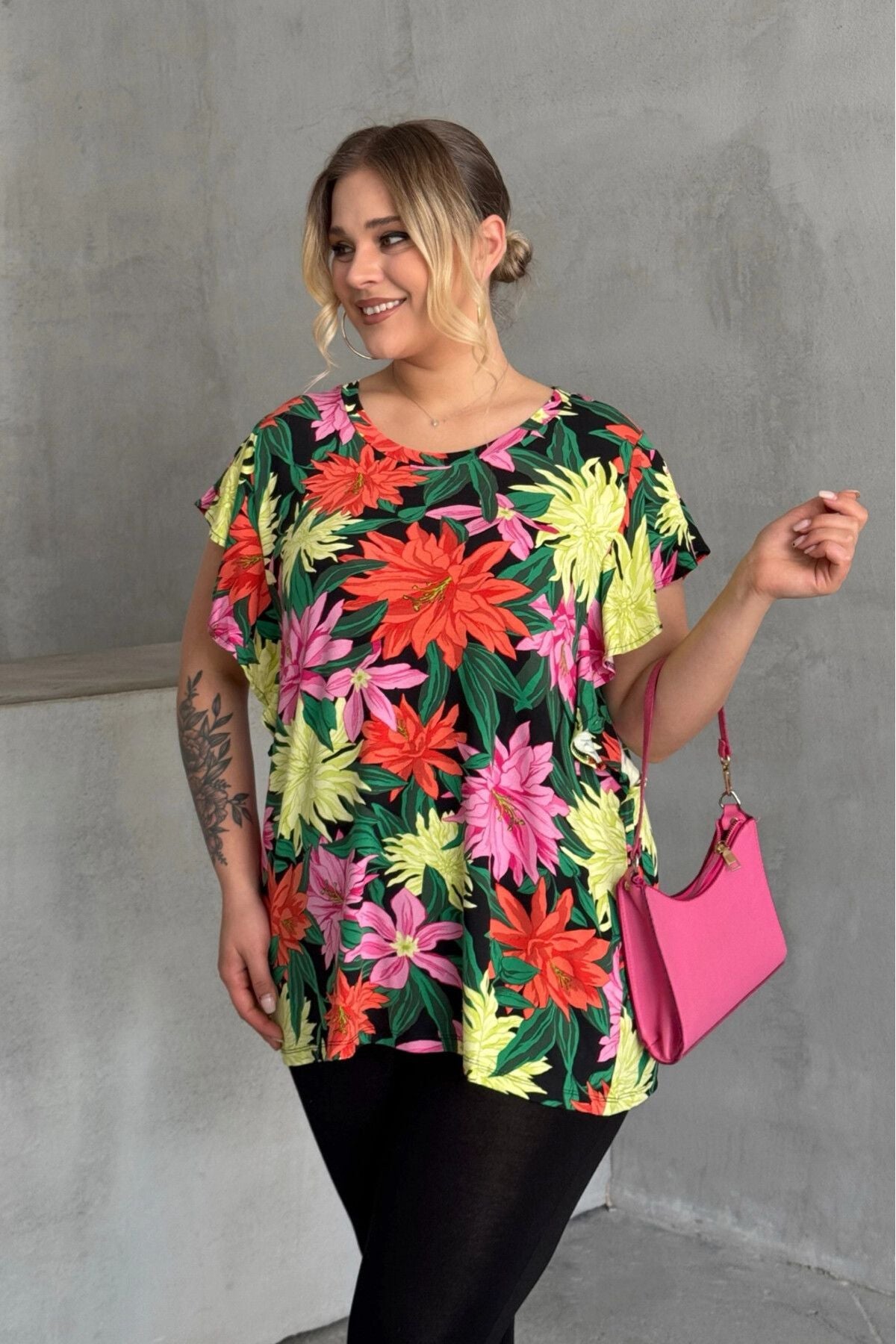 Büyük Beden Bisiklet Yaka Kolları Fırfır Detaylı Çiçek Desenli Bluz 1060