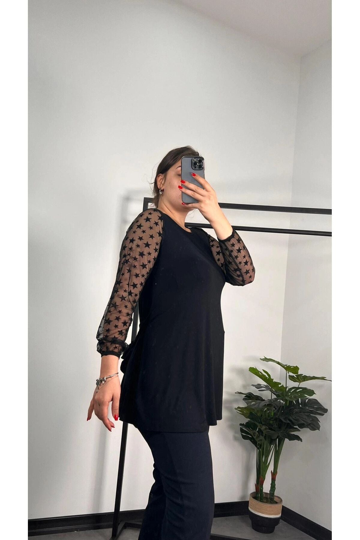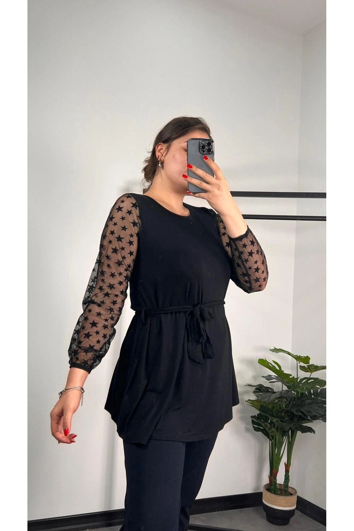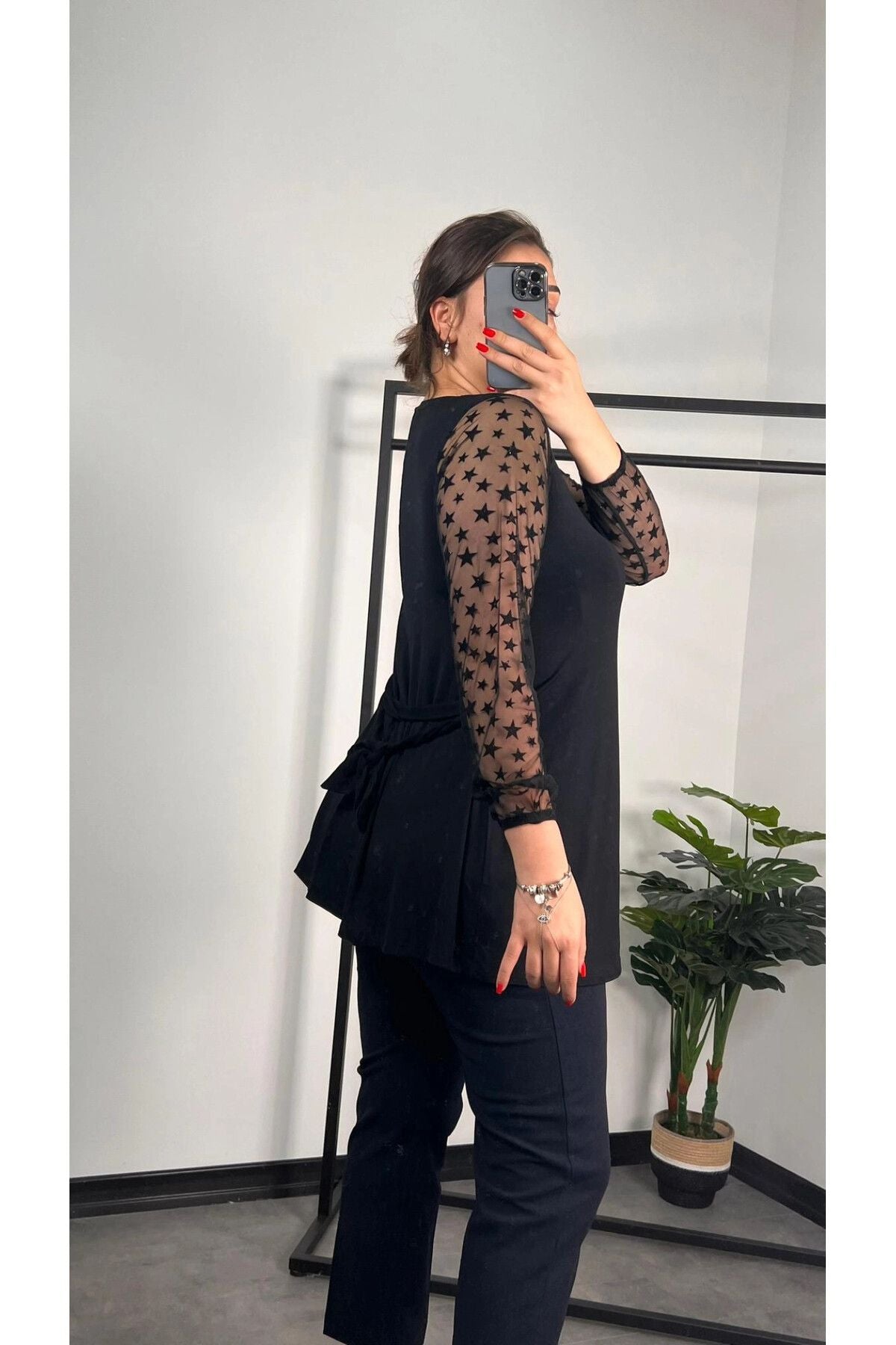 Büyük Beden Bisiklet Yaka Kolları Tül Detaylı Kemerli Bluz 300309