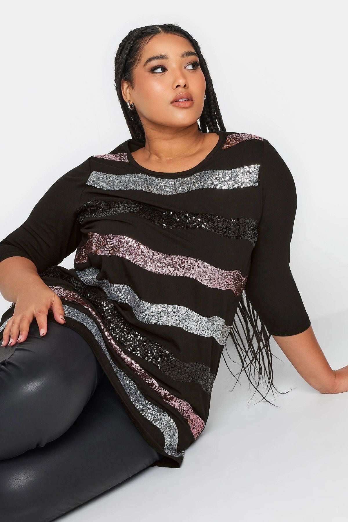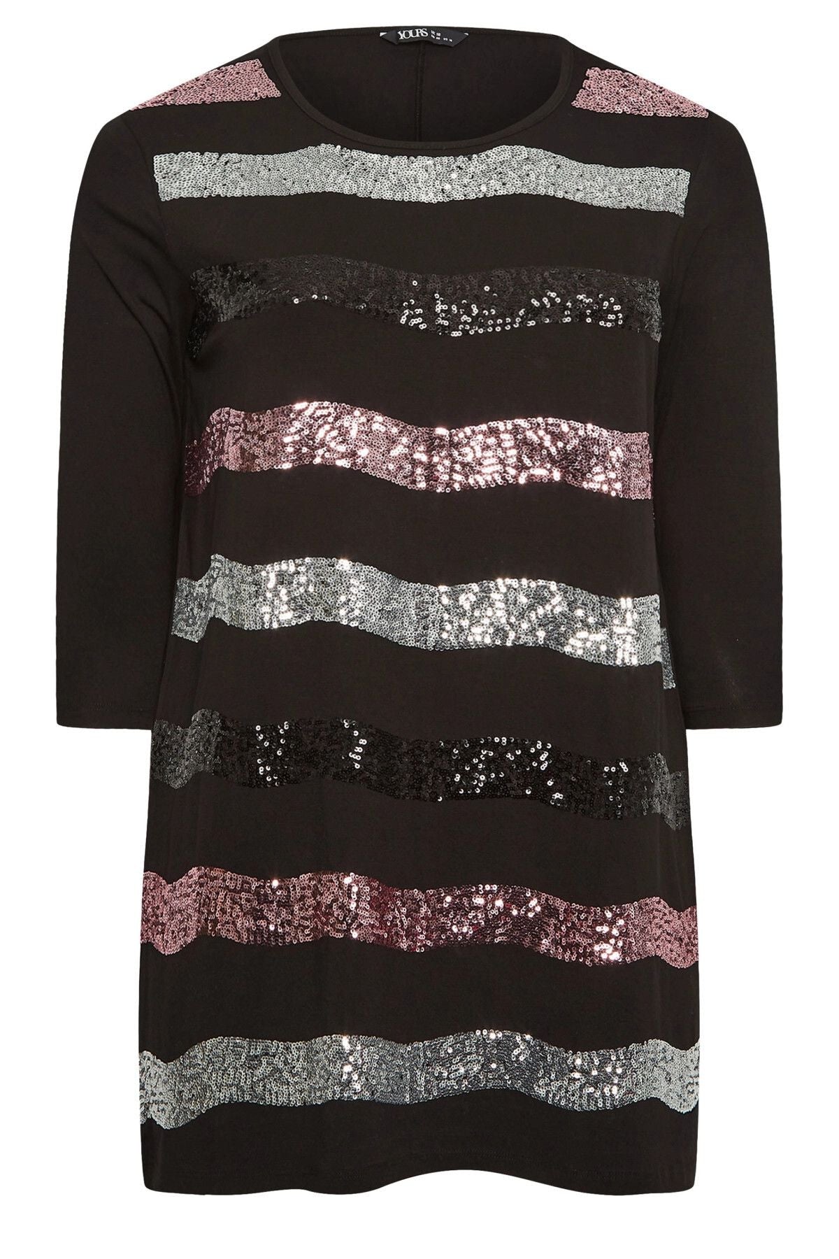 • Model Detayı: Geniş Yuvarlak (U) Yaka, Truvakar (3/4) Kol, Payet İşlemeli Çizgi Desenli