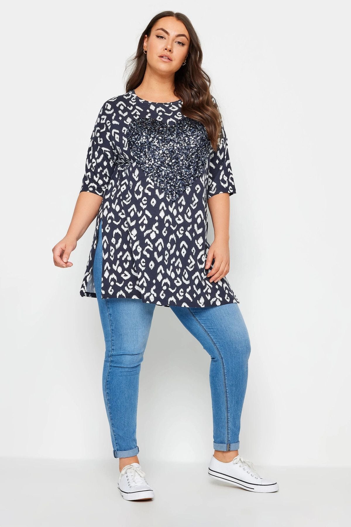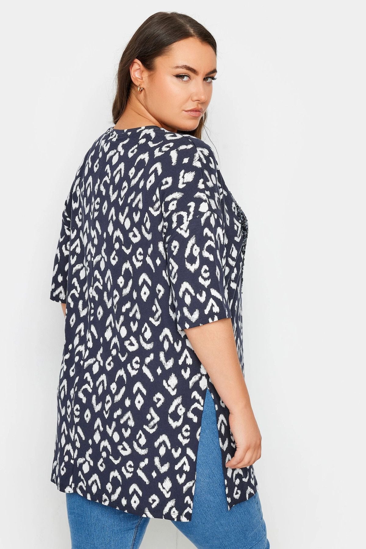 Büyük Beden Bisiklet Yaka Payet İşlemeli Yırtmaç Detaylı Bluz 303078