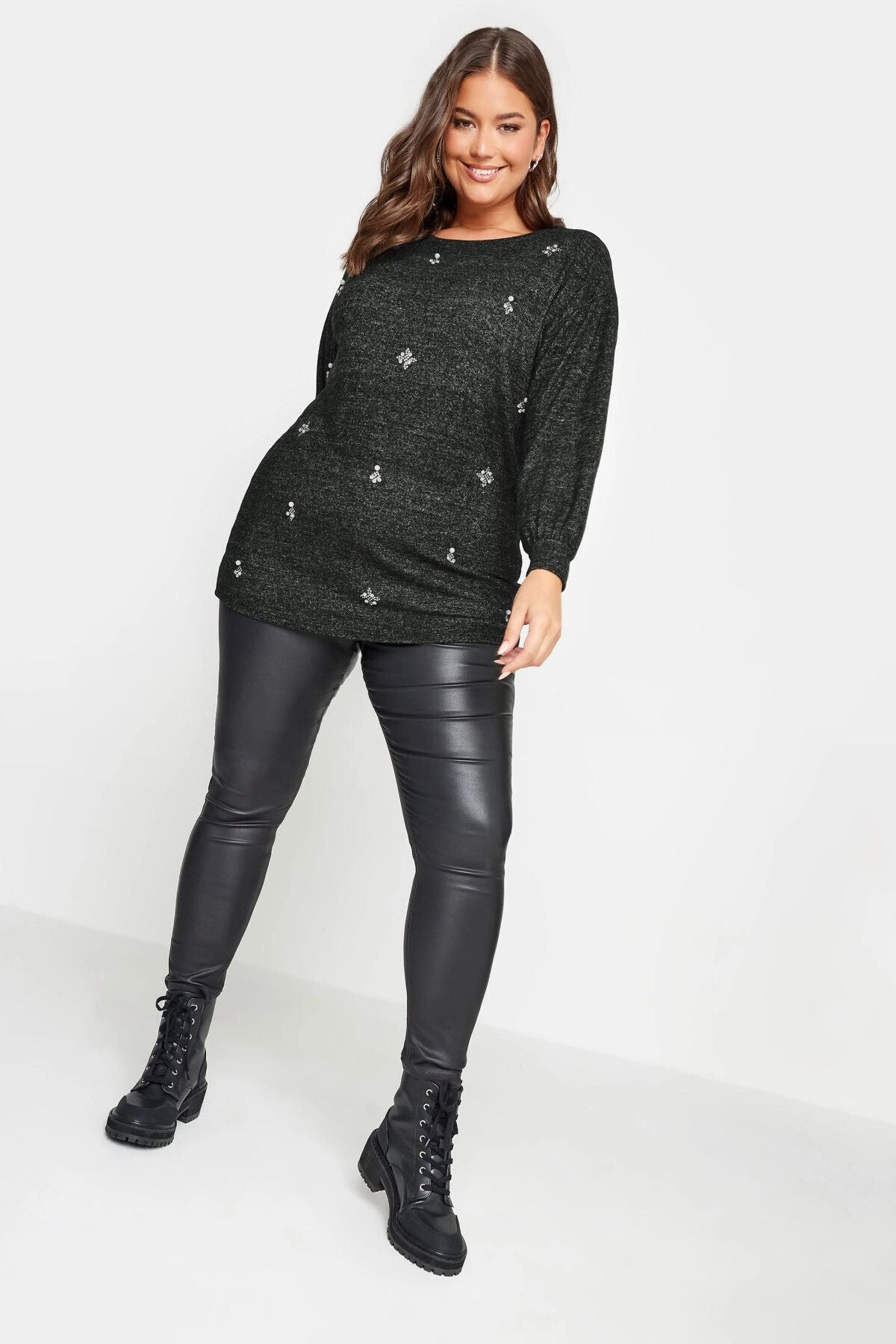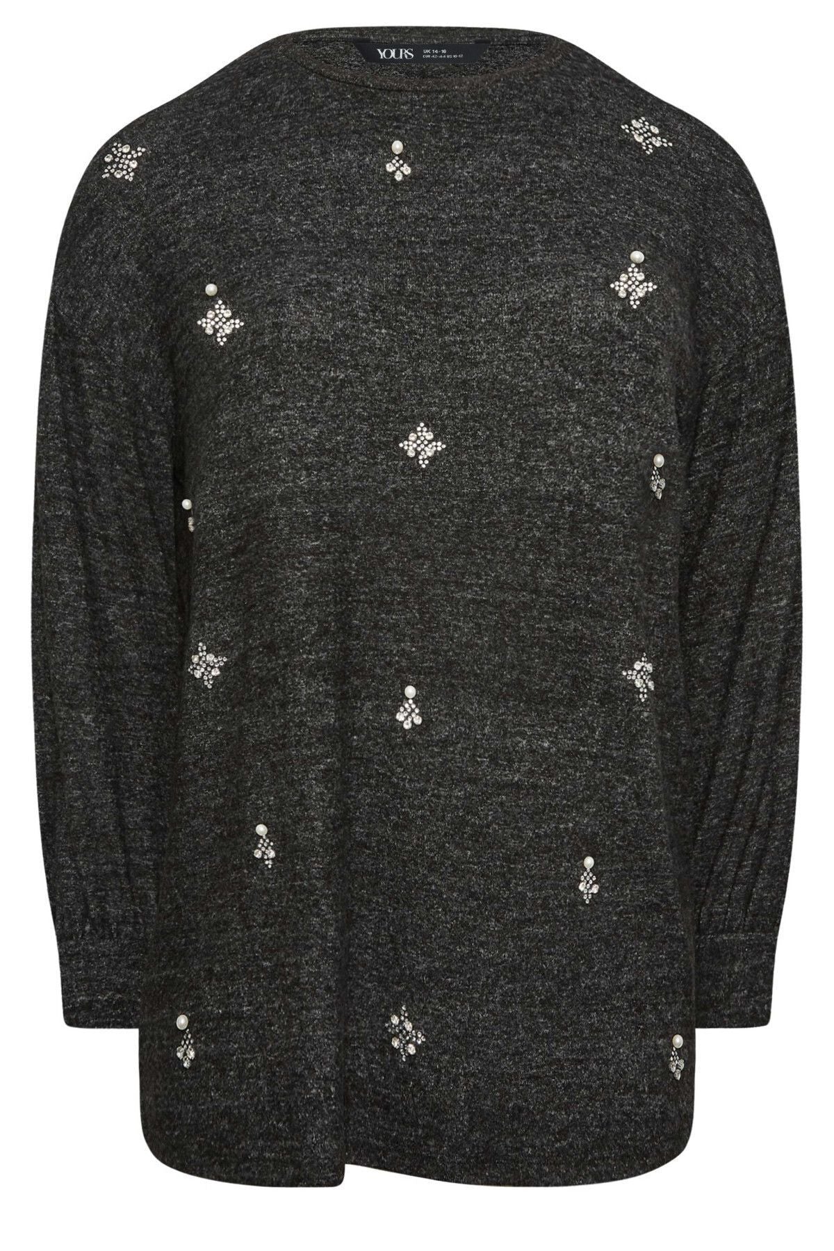 Büyük Beden Bisiklet Yaka Taş Detaylı Uzun Kollu Bluz 302622