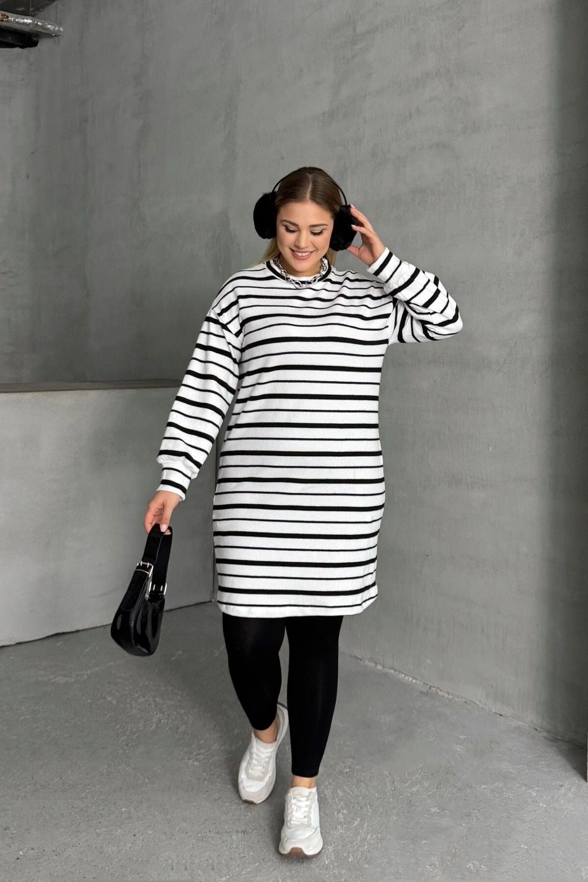 Büyük Beden Bisiklet Yaka Uzun Kollu Bileği Lastikli Çizgili Elbise 303062
