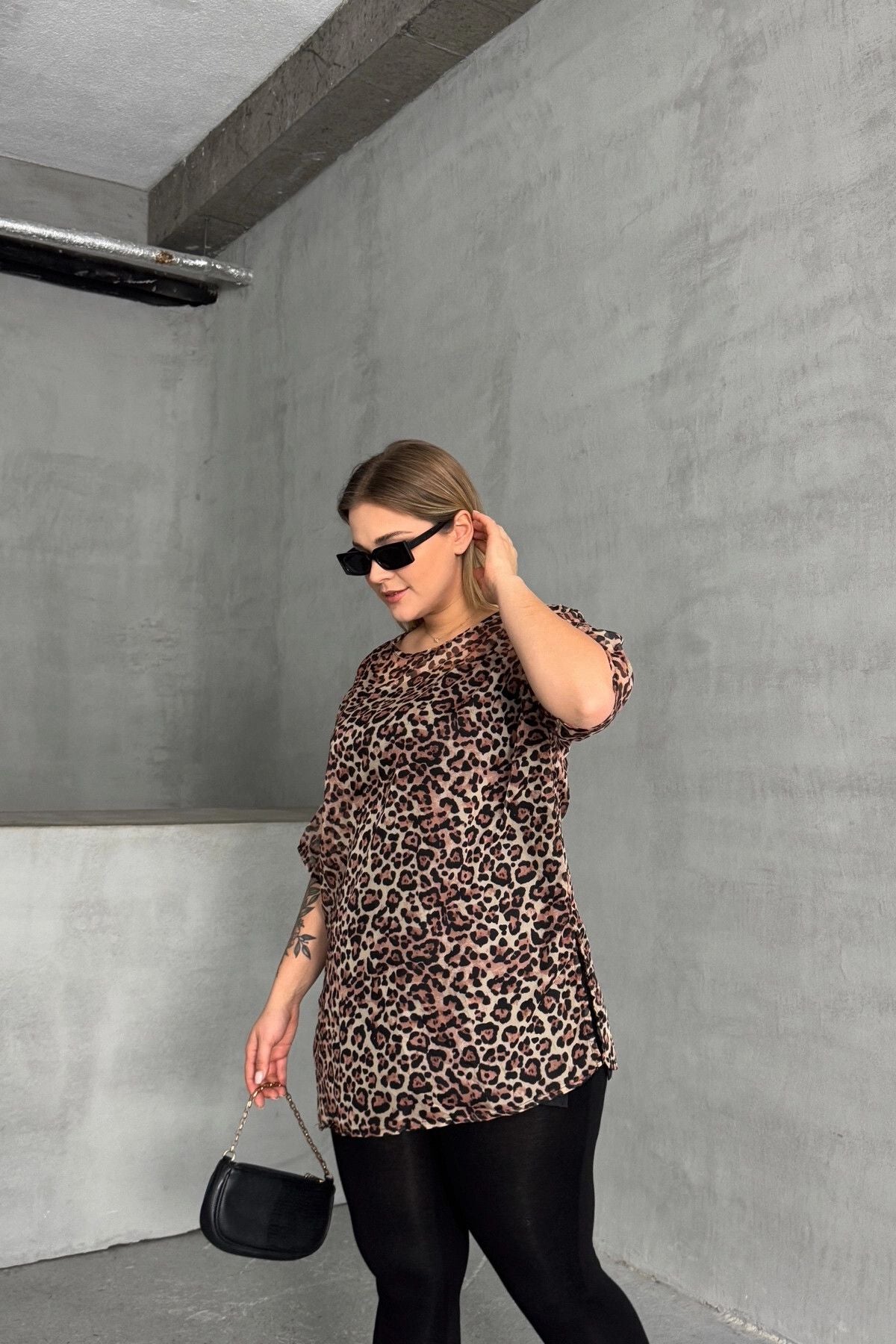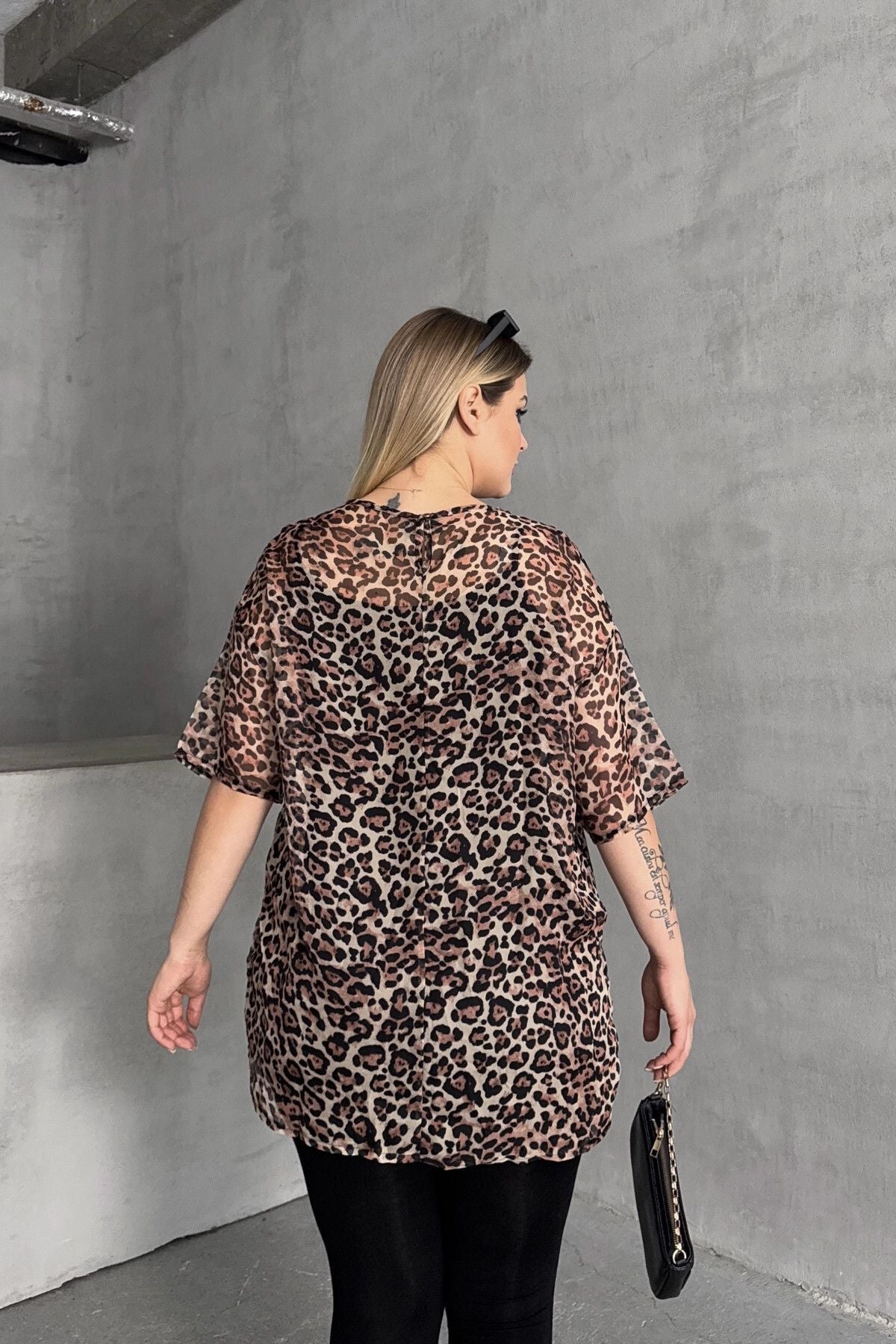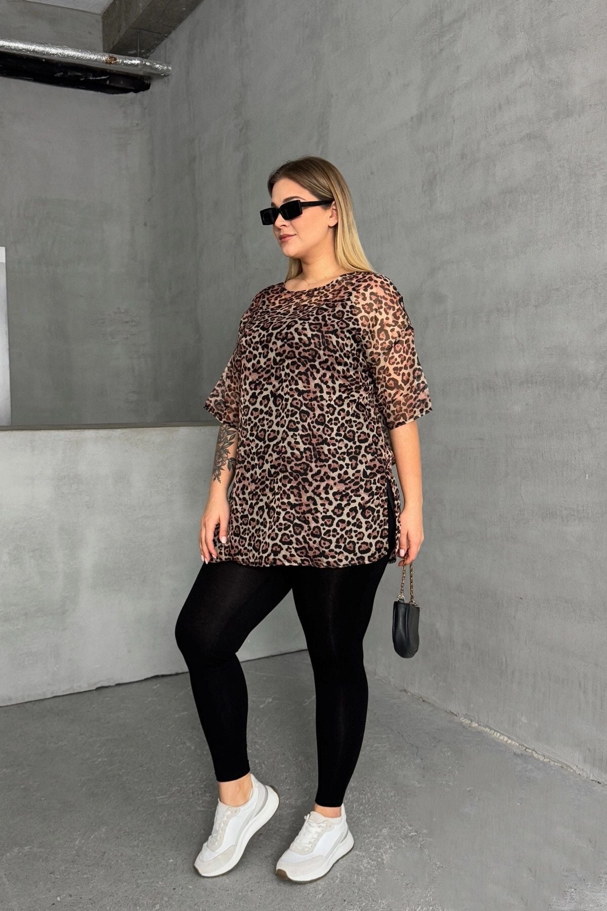 Büyük Beden Bisiklet Yaka Yarım Kollu Astarlı Transparan Bluz 303631