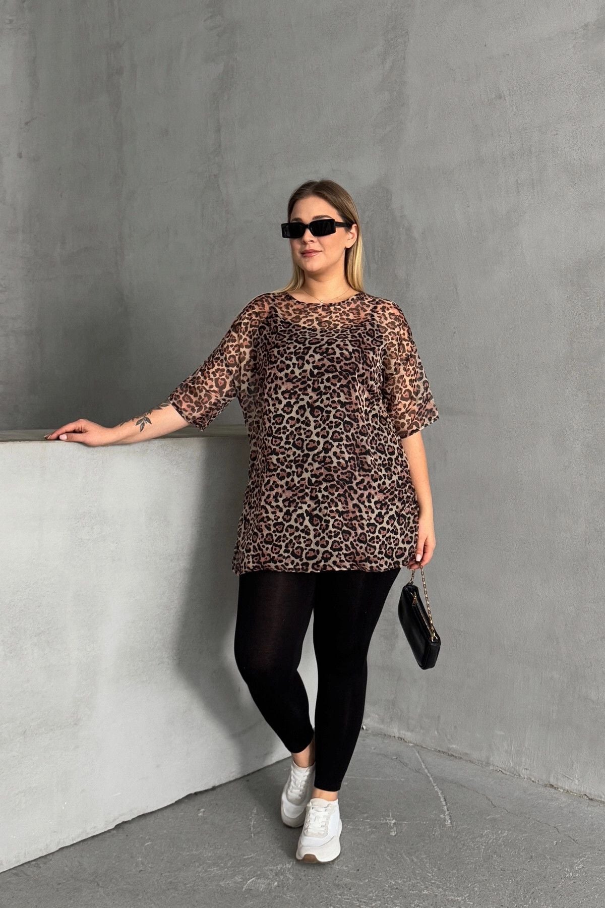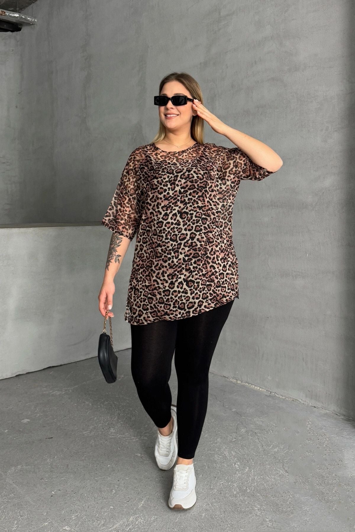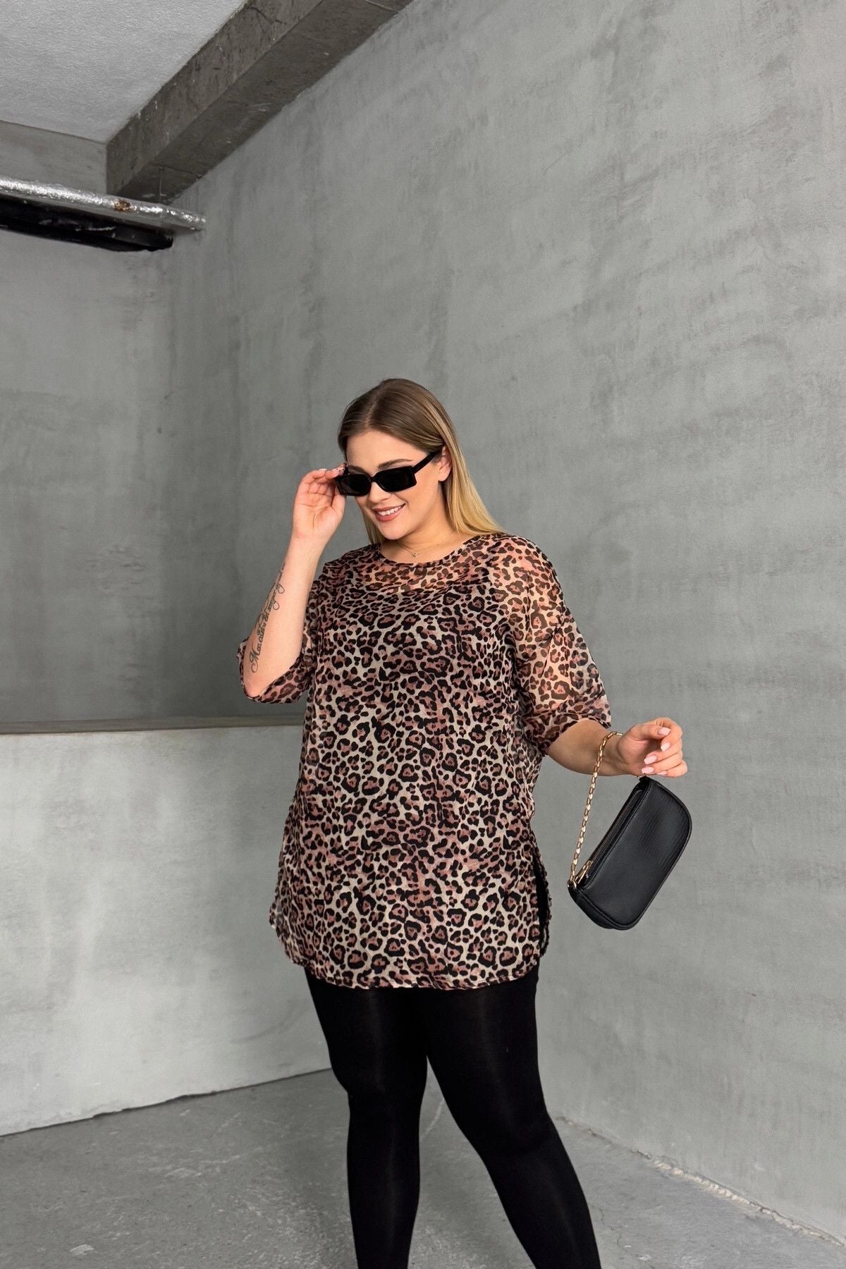 Büyük Beden Bisiklet Yaka Yarım Kollu Astarlı Transparan Bluz 303631