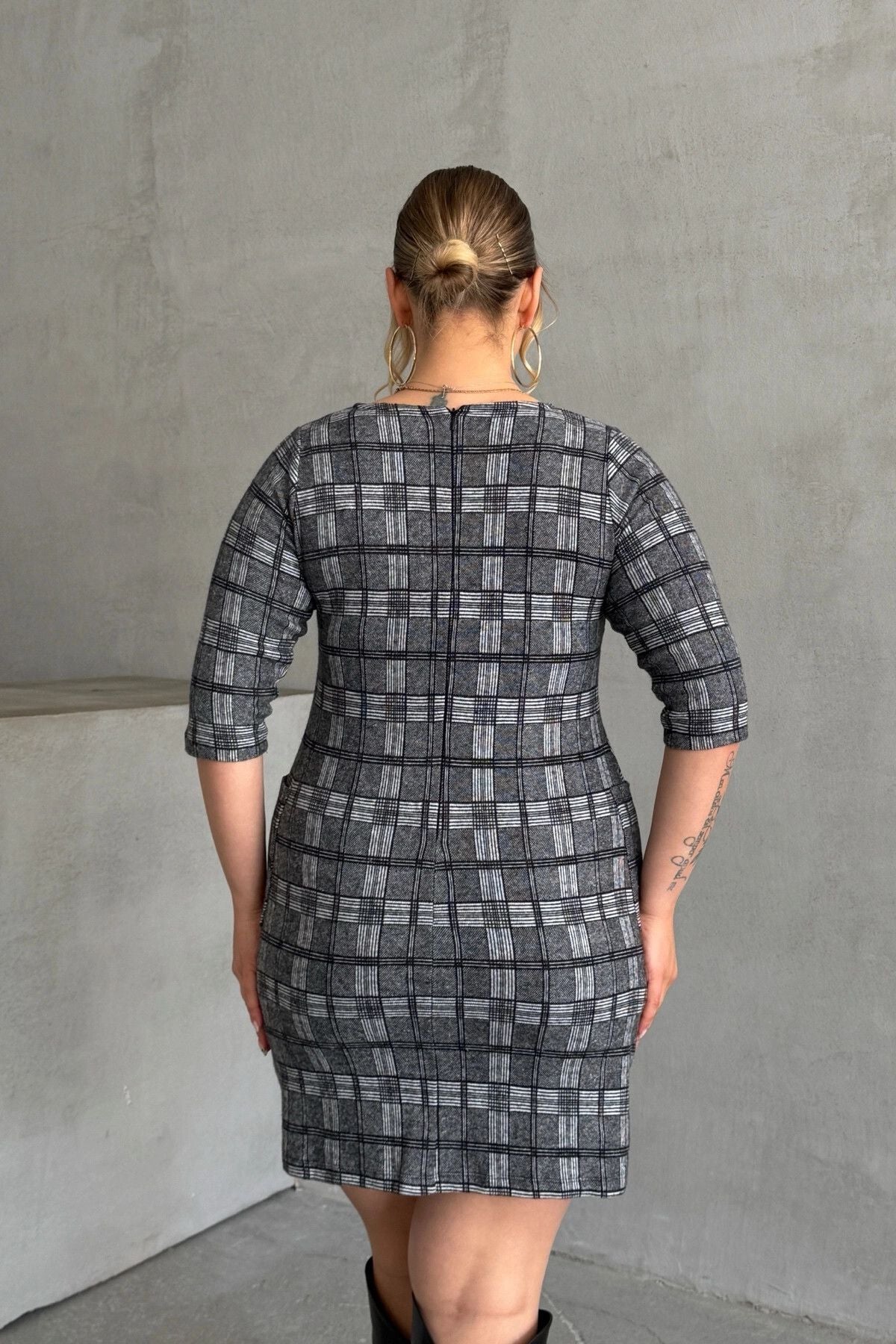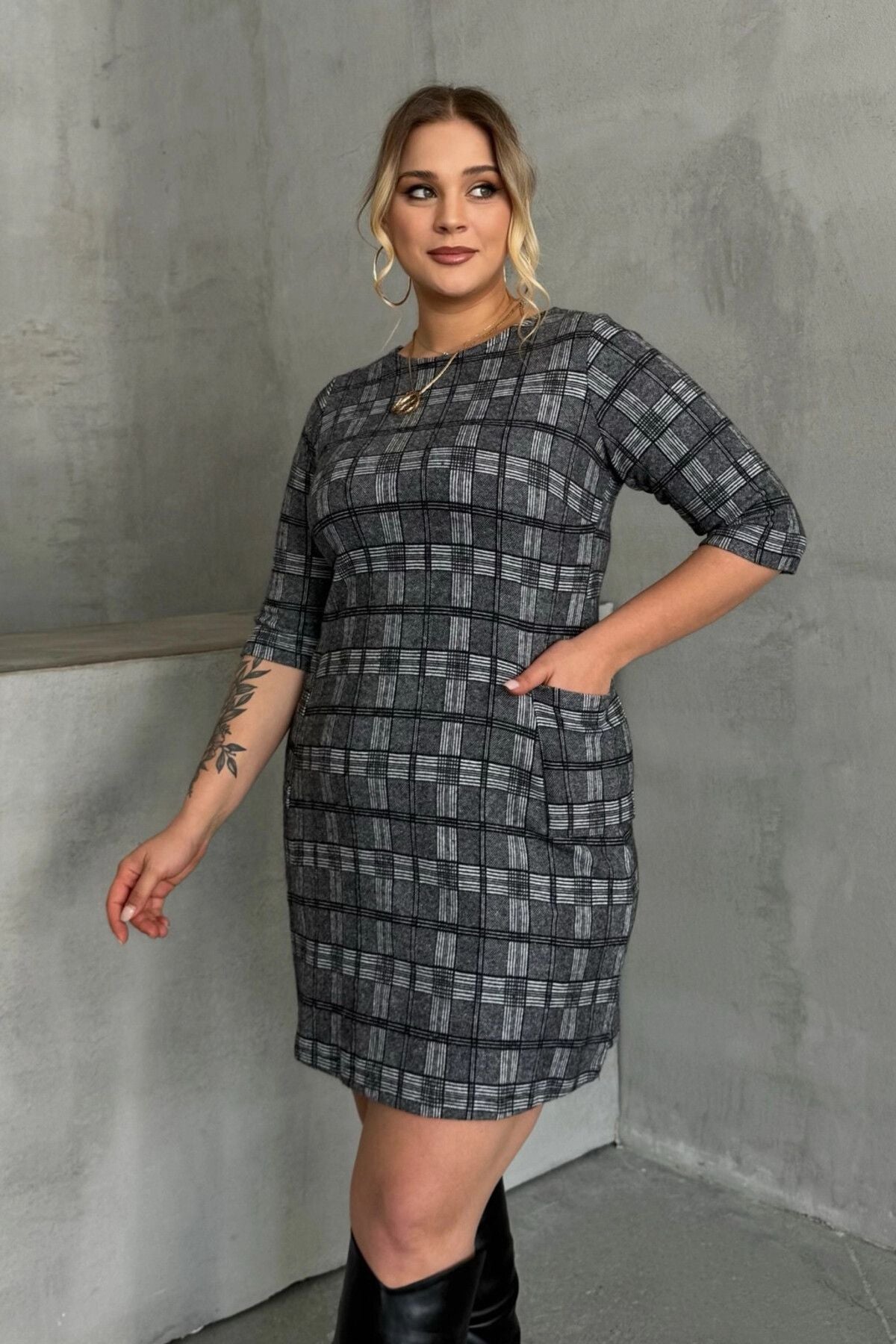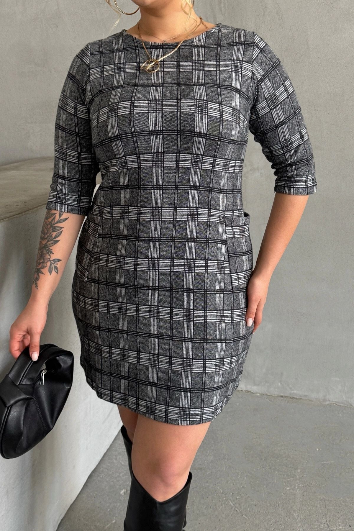 Büyük Beden Bisiklet Yaka Yarım Kollu Cepli Desenli Elbise 301507