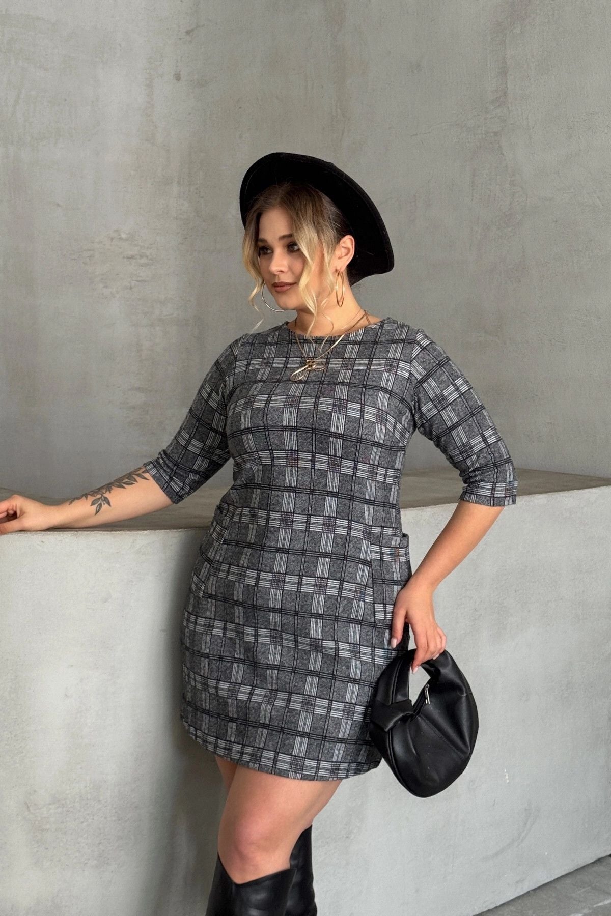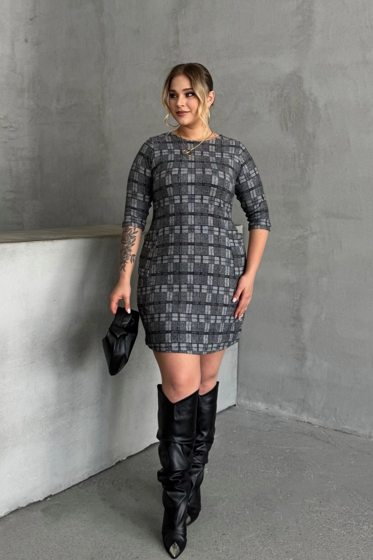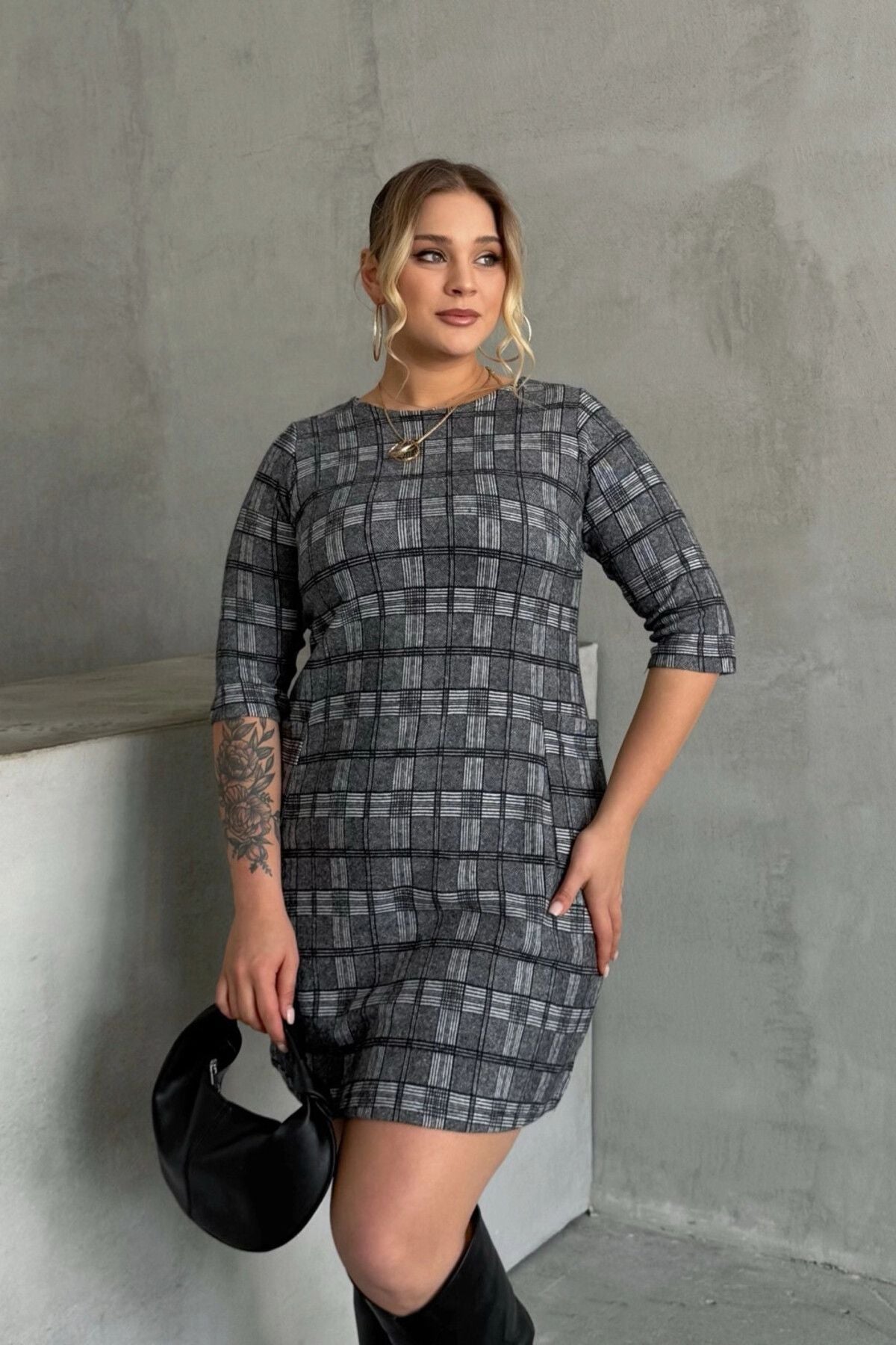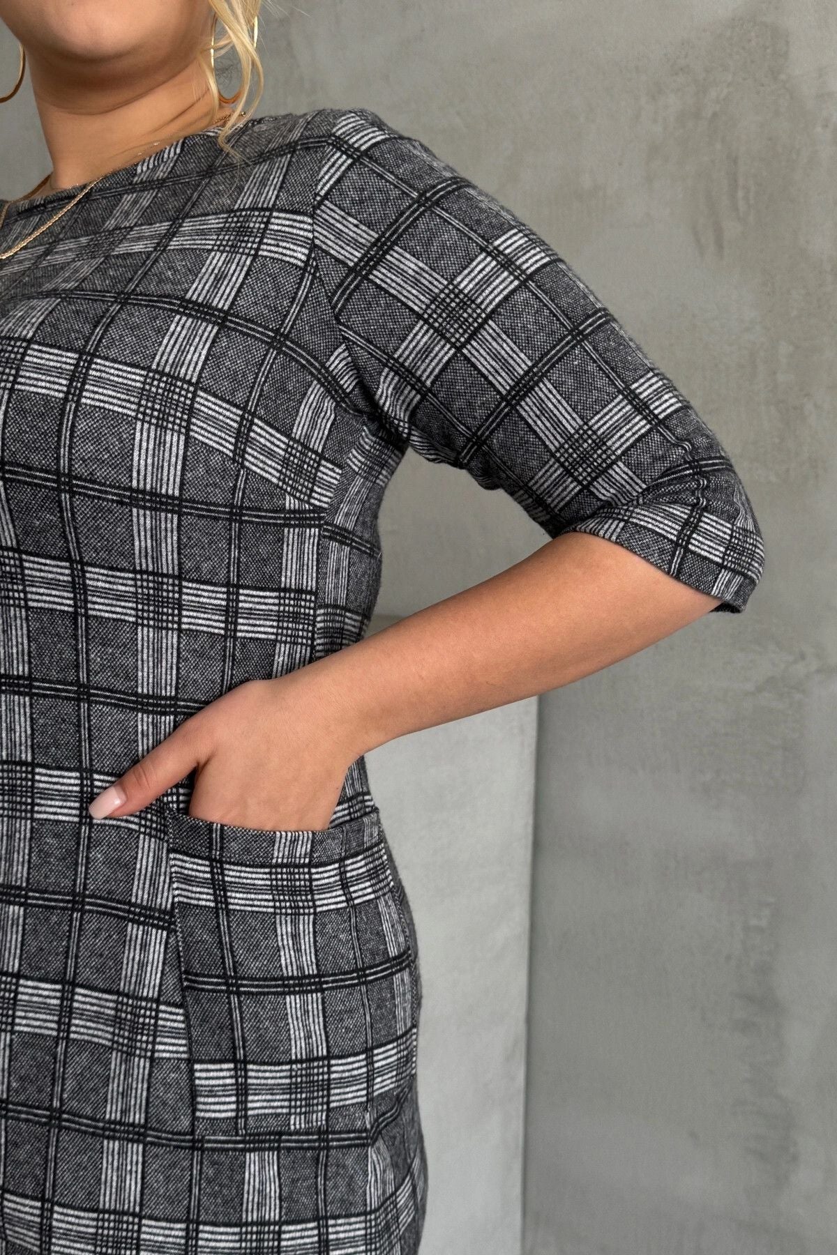 Büyük Beden Bisiklet Yaka Yarım Kollu Cepli Desenli Elbise 301507