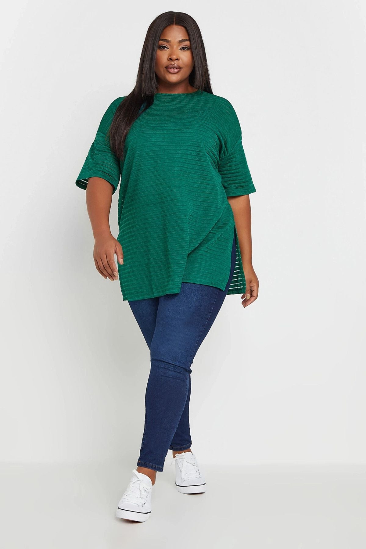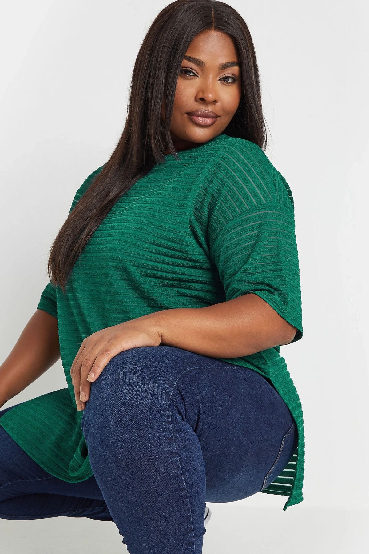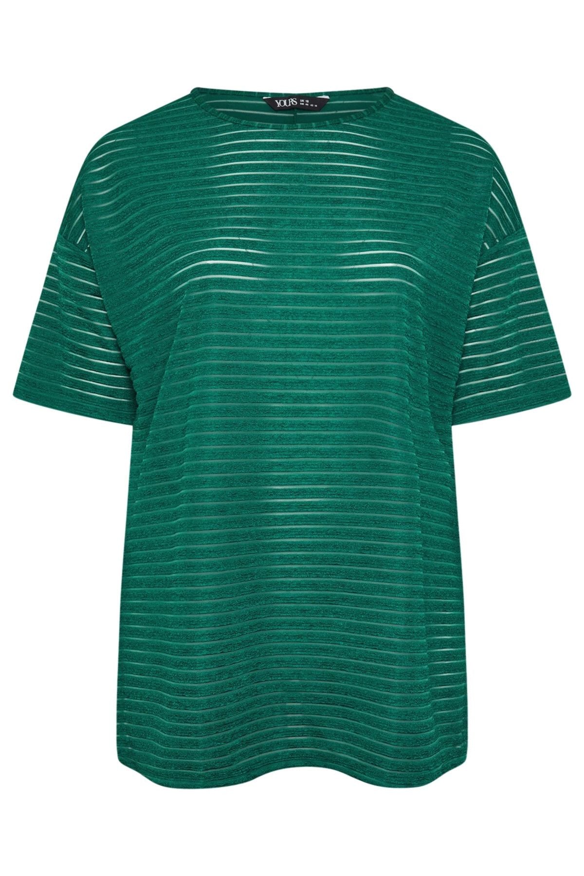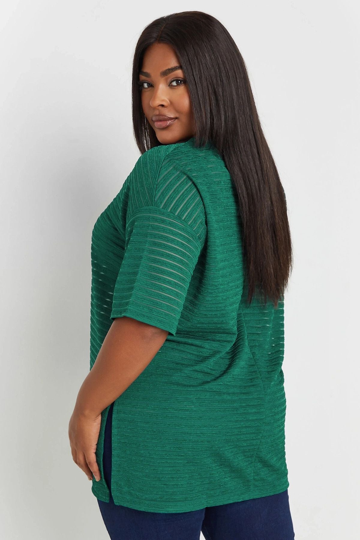 Büyük Beden Bisiklet Yaka Yarım Kollu Yırtmaçlı Çizgili File Bluz 303426