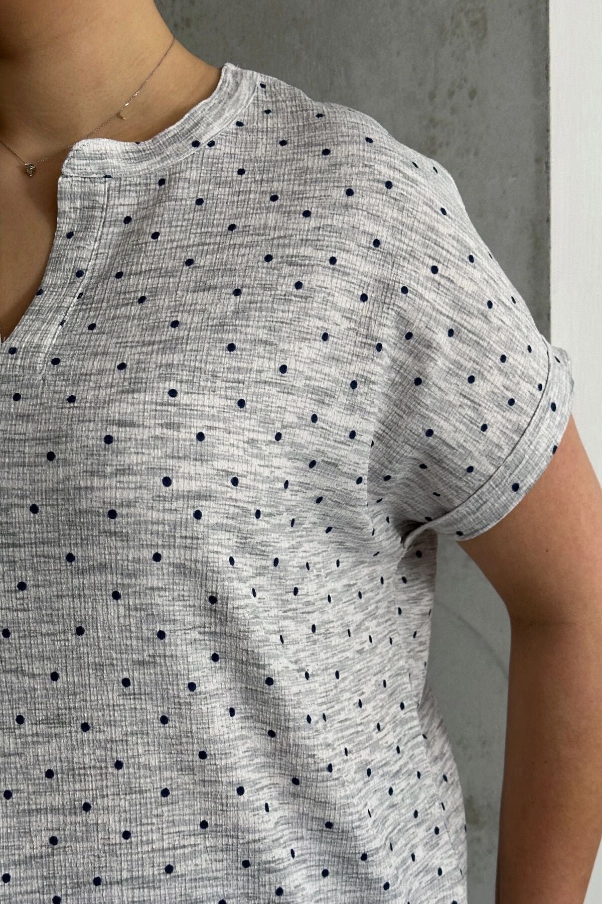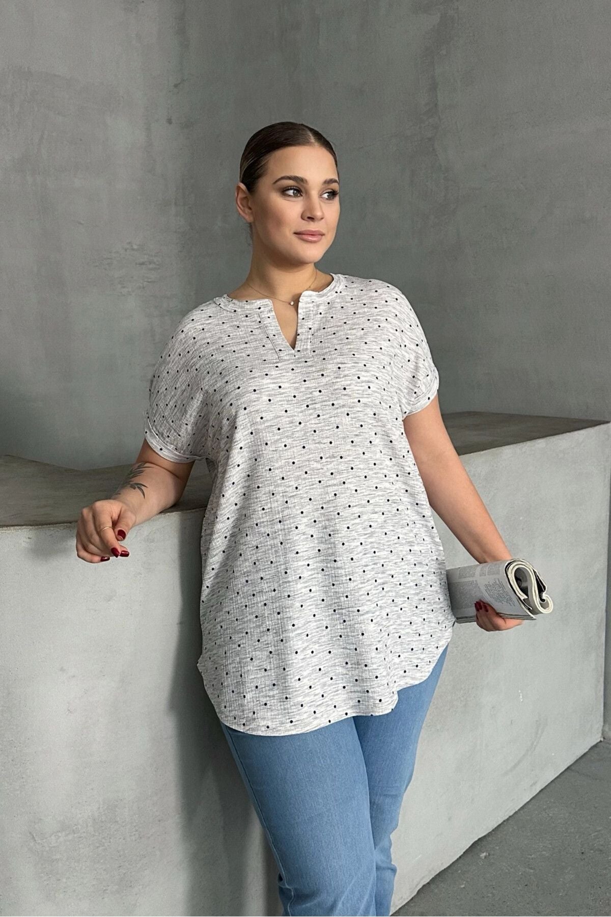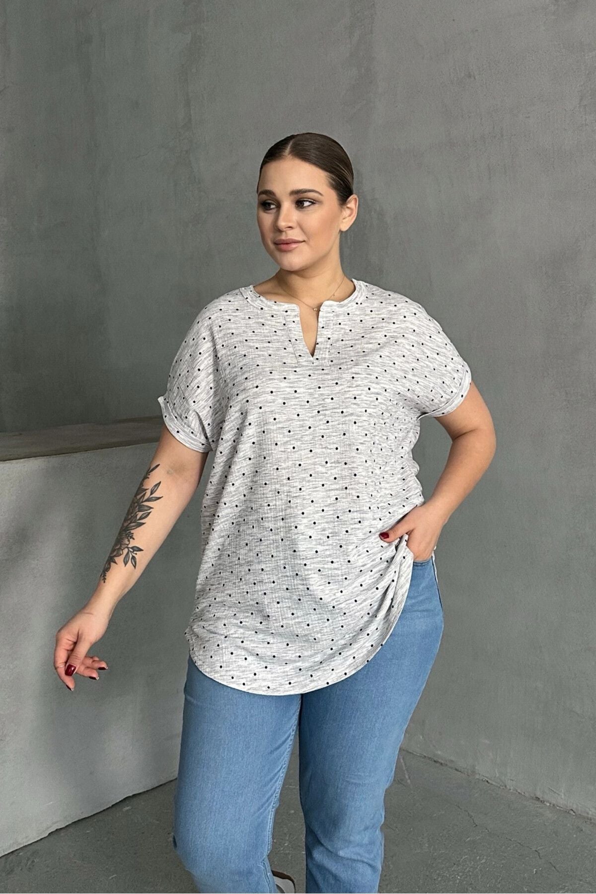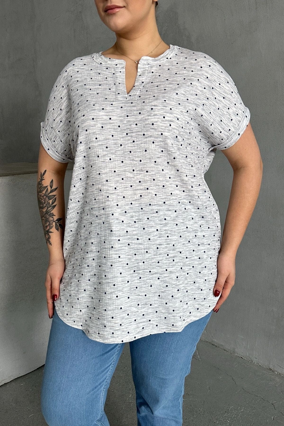 Büyük Beden Çentik V Yaka Kısa Kollu Puantiye Desenli Bluz 303866