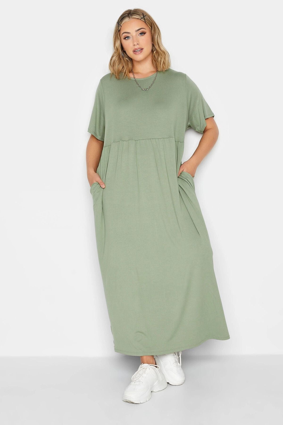 • Büyük Beden Cepli Bisiklet Yaka Yarım Kollu Uzun Elbise 216041