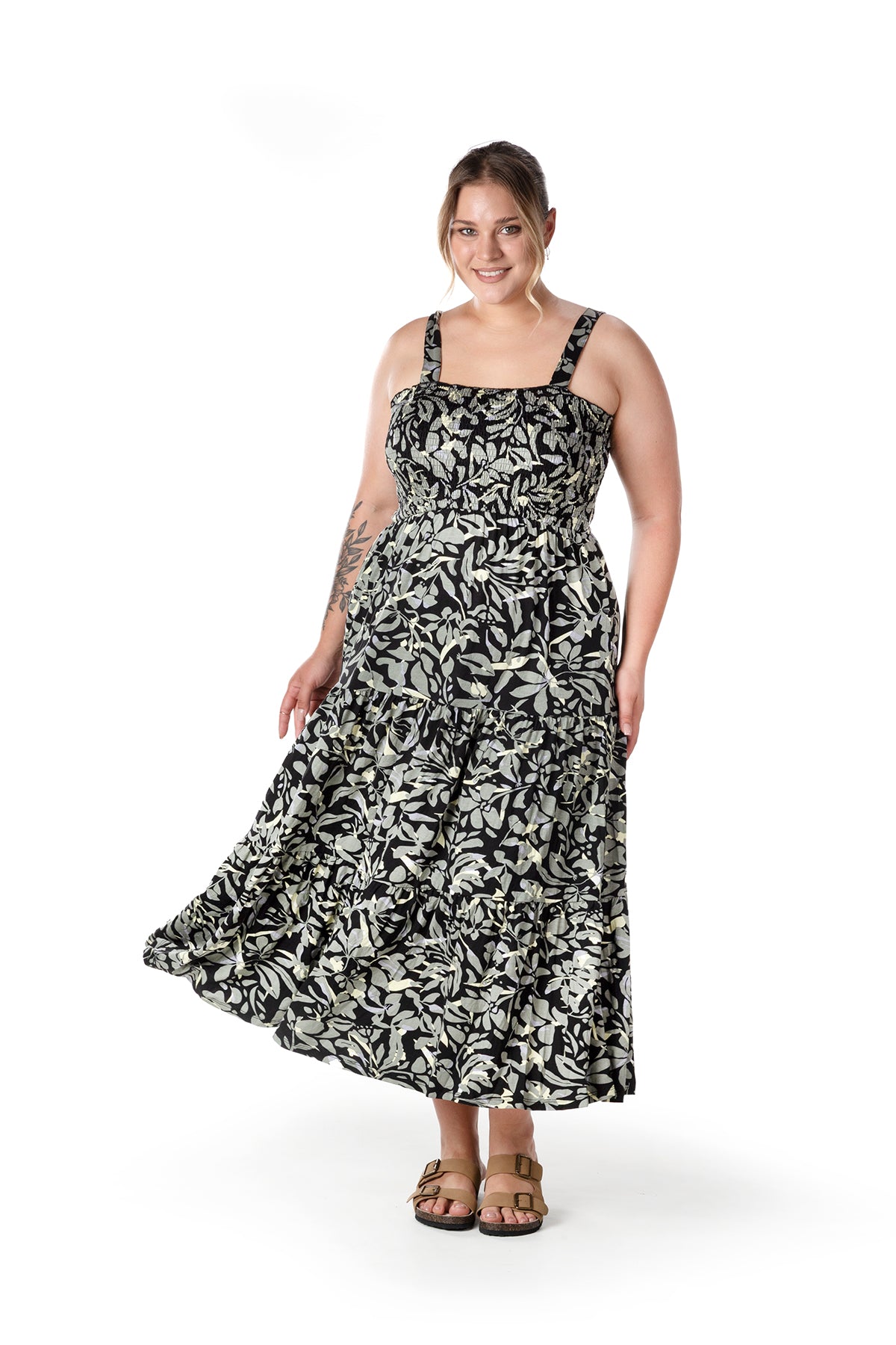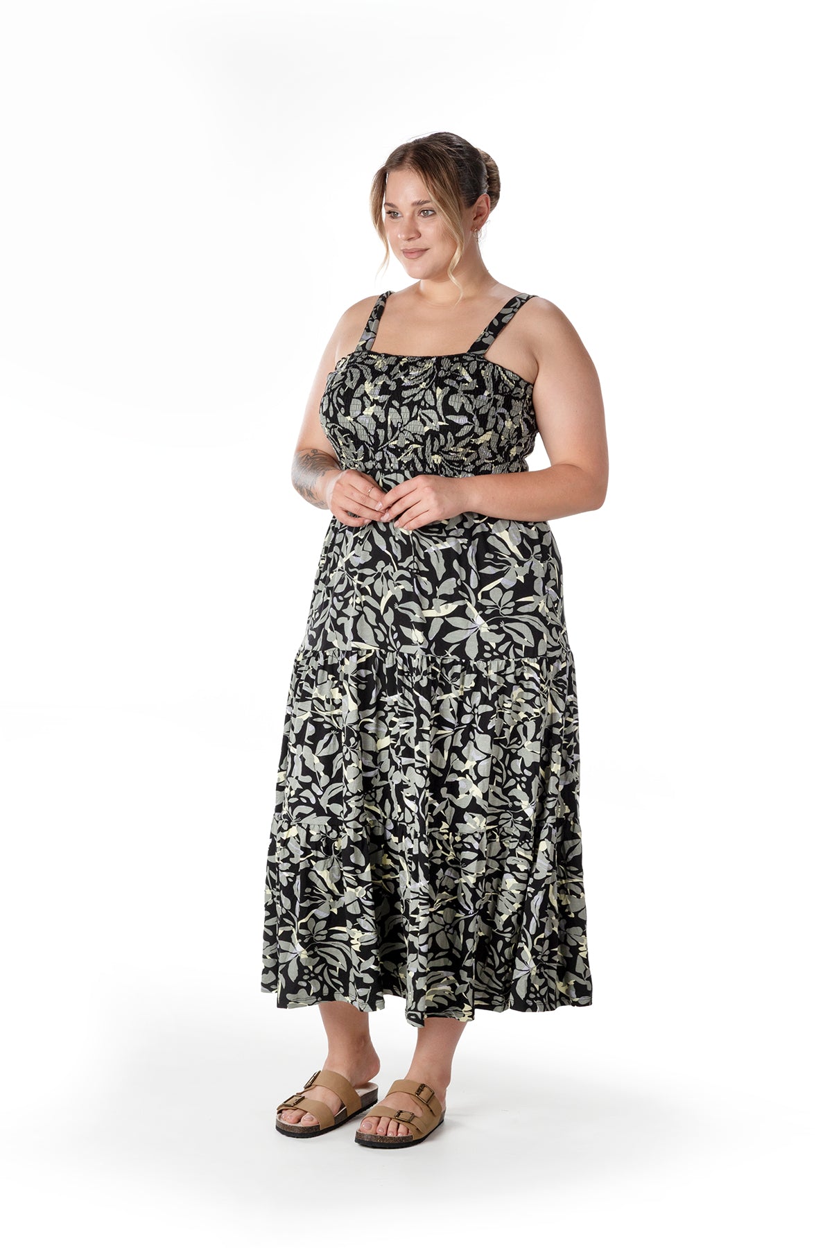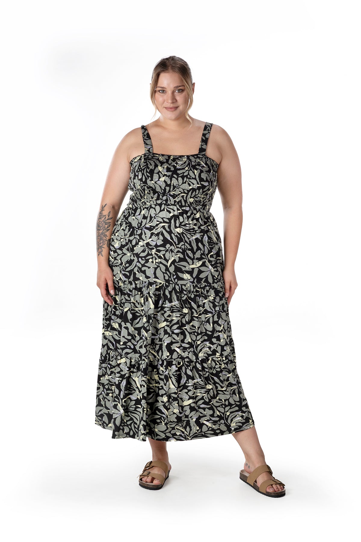 Büyük Beden Çiçek Desenli Kalın Askılı Beli Lastikli Elbise T-81