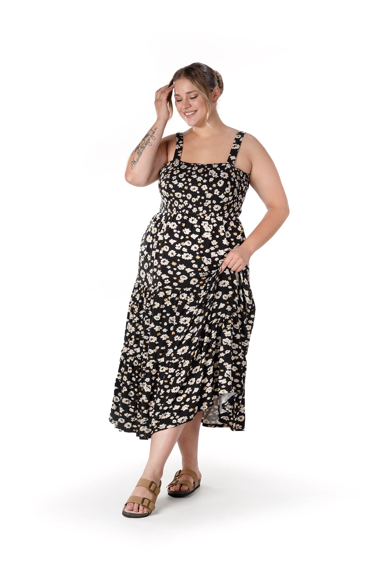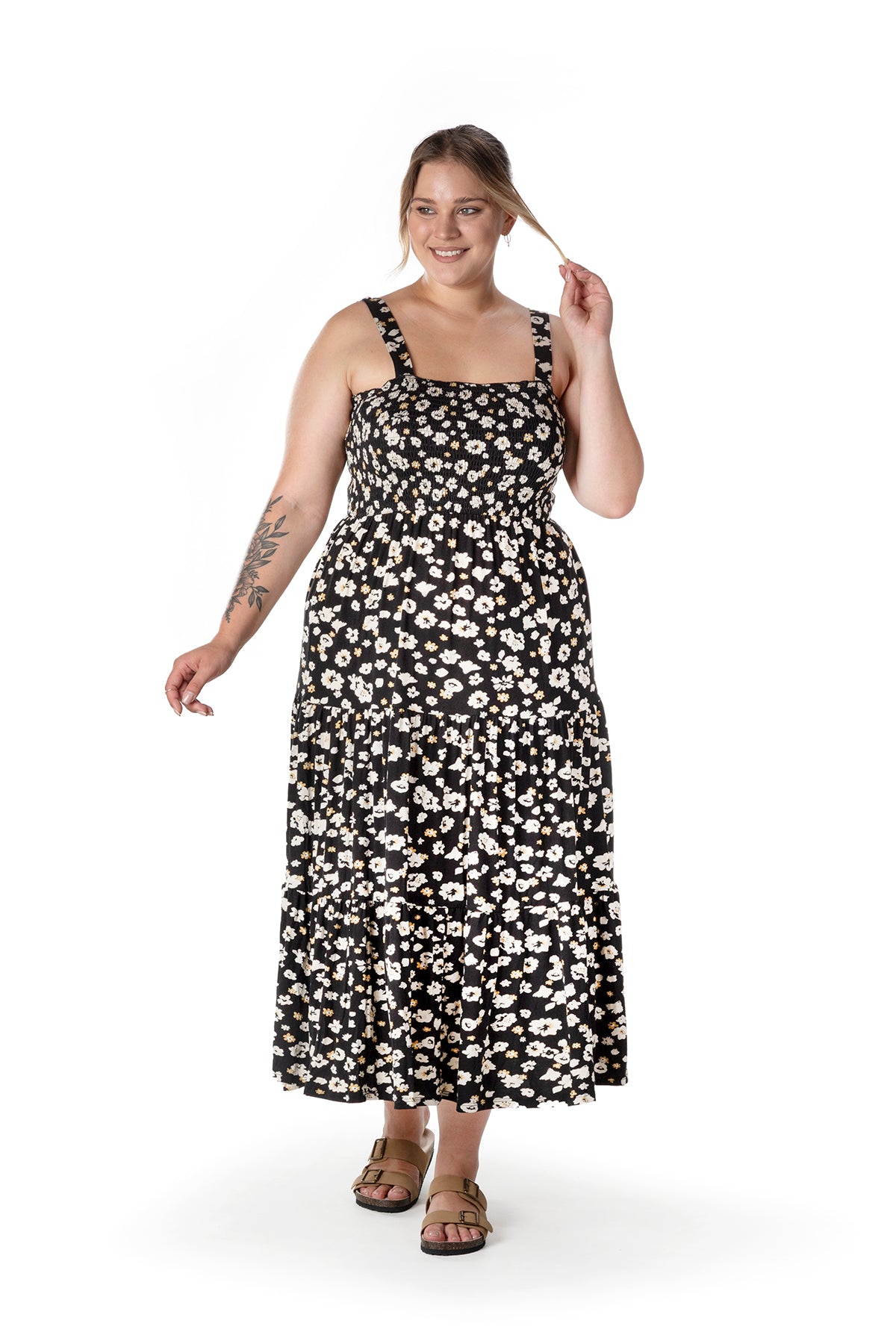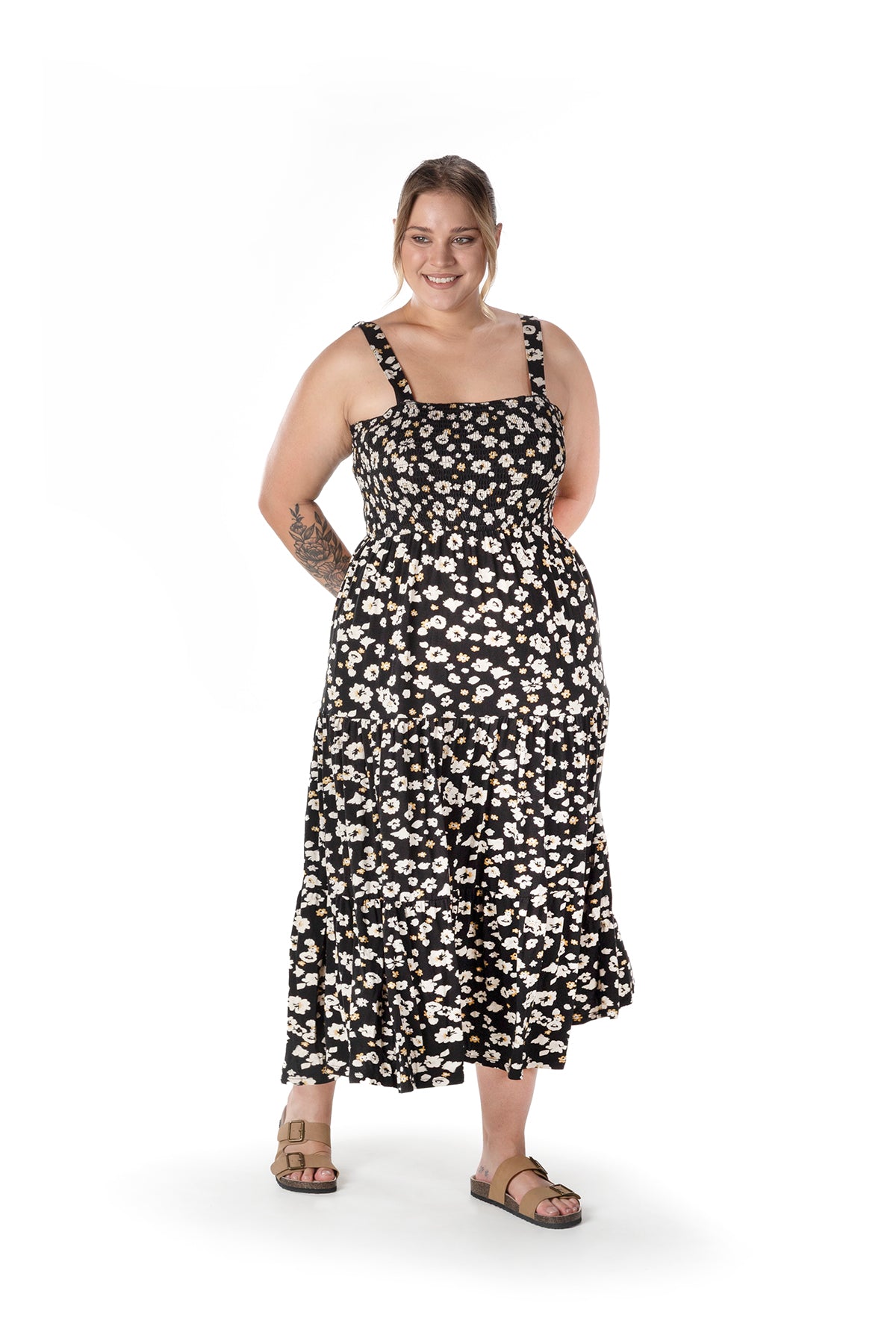 Büyük Beden Çiçek Desenli Kalın Askılı Beli Lastikli Elbise T-83