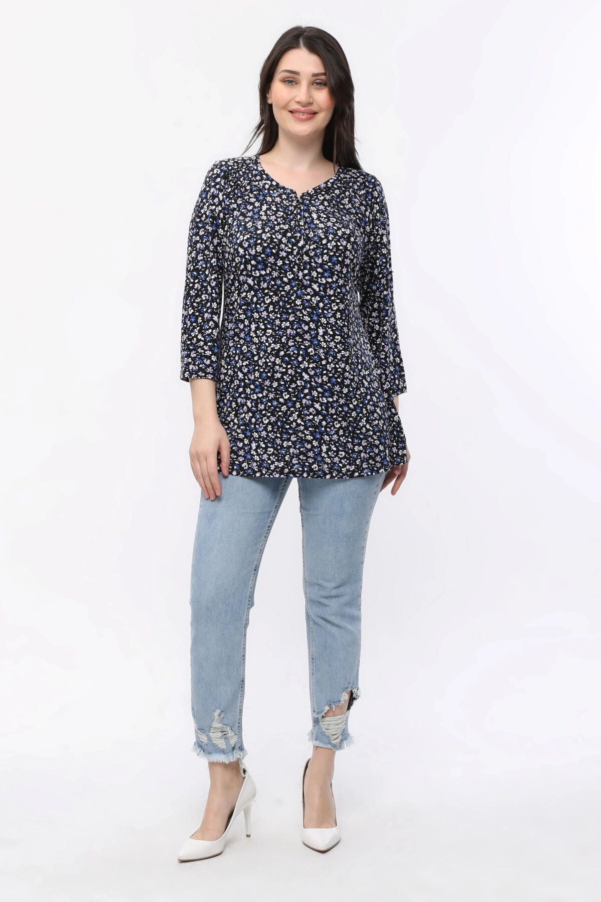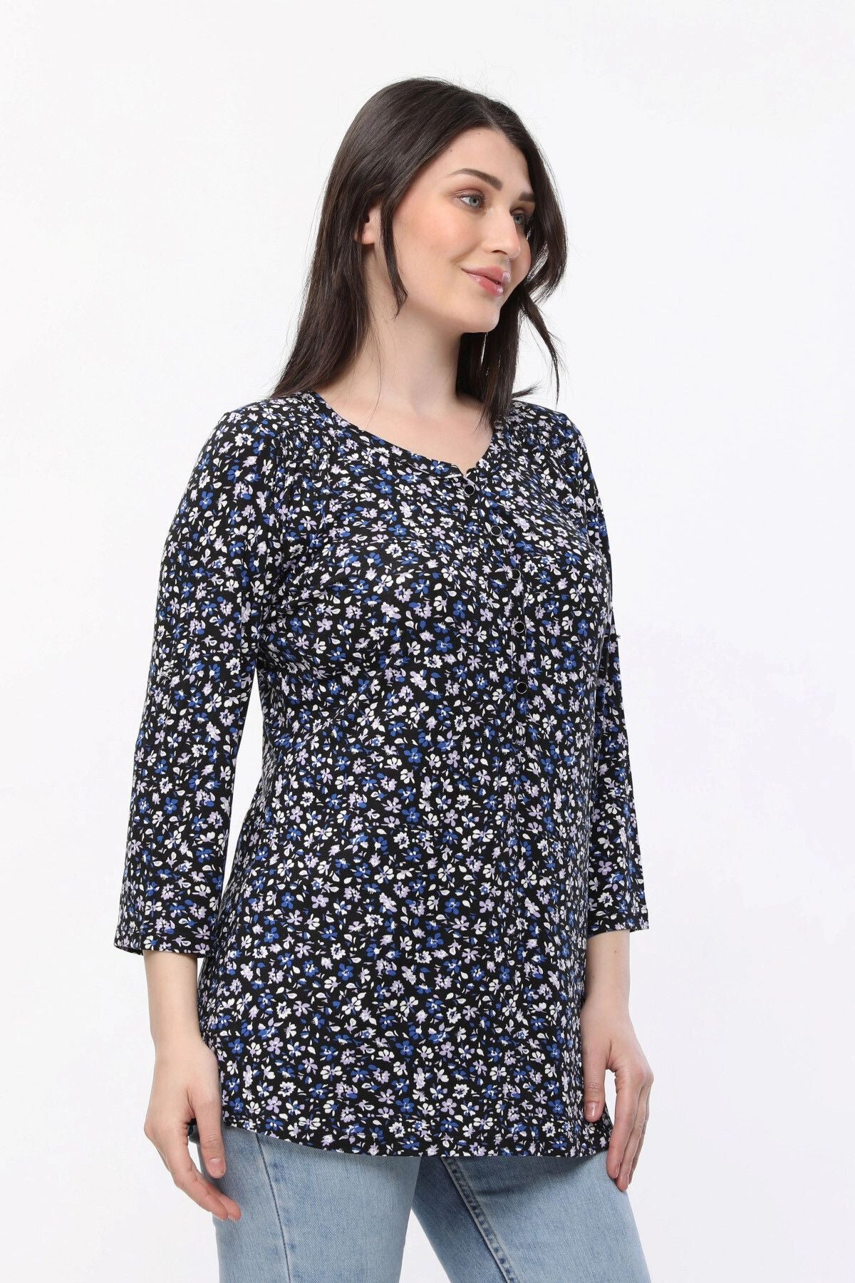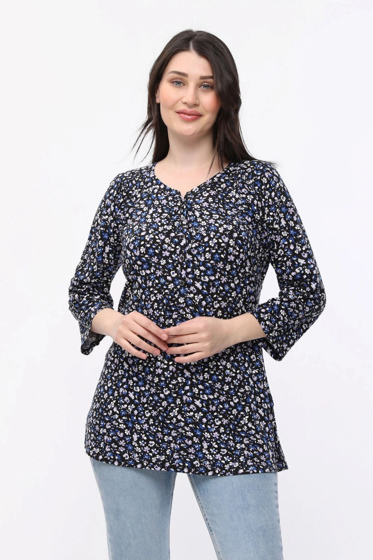 Büyük Beden Çiçek Desenli Önü Düğmeli Fakir Kol Bluz E15156