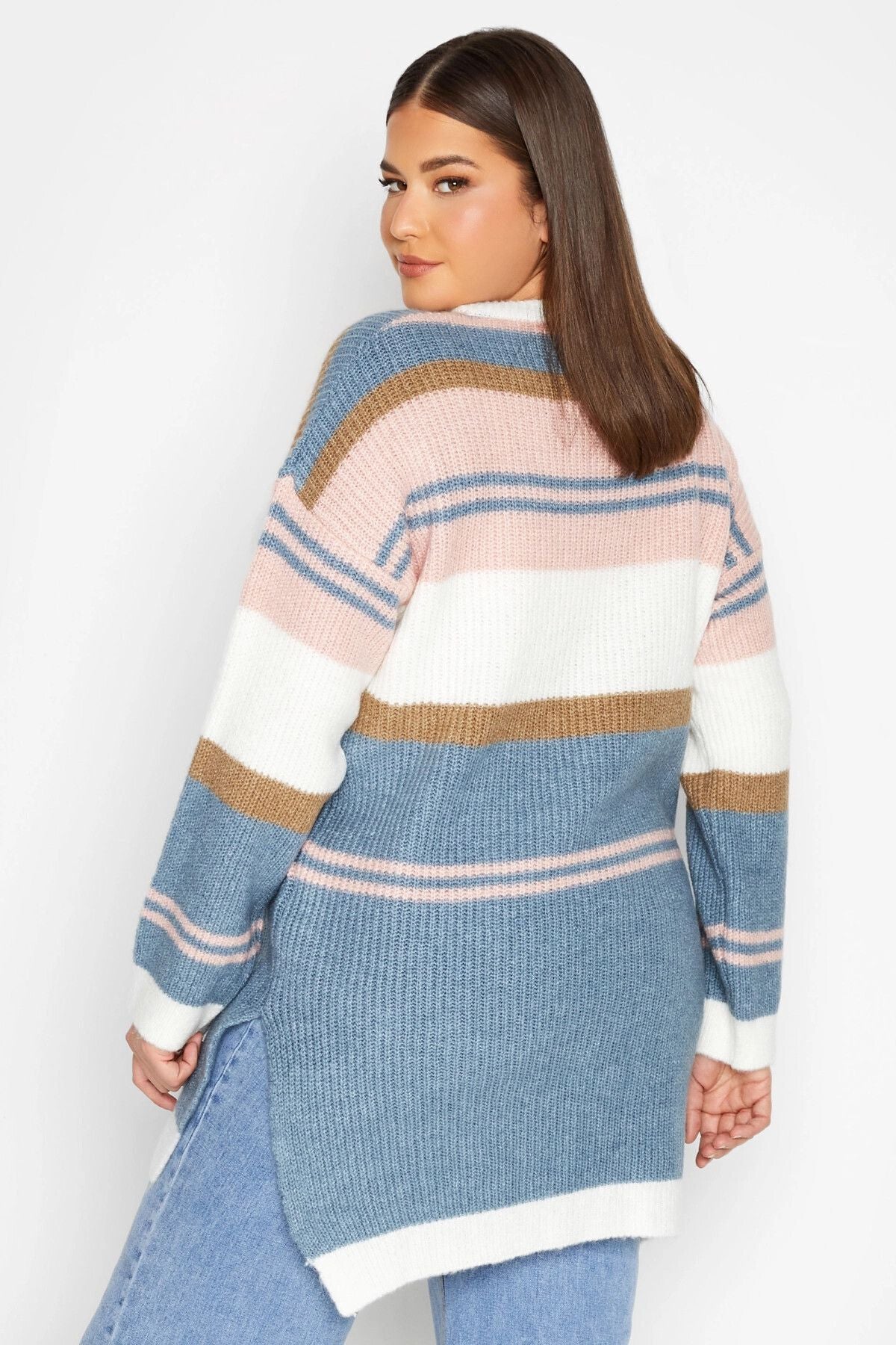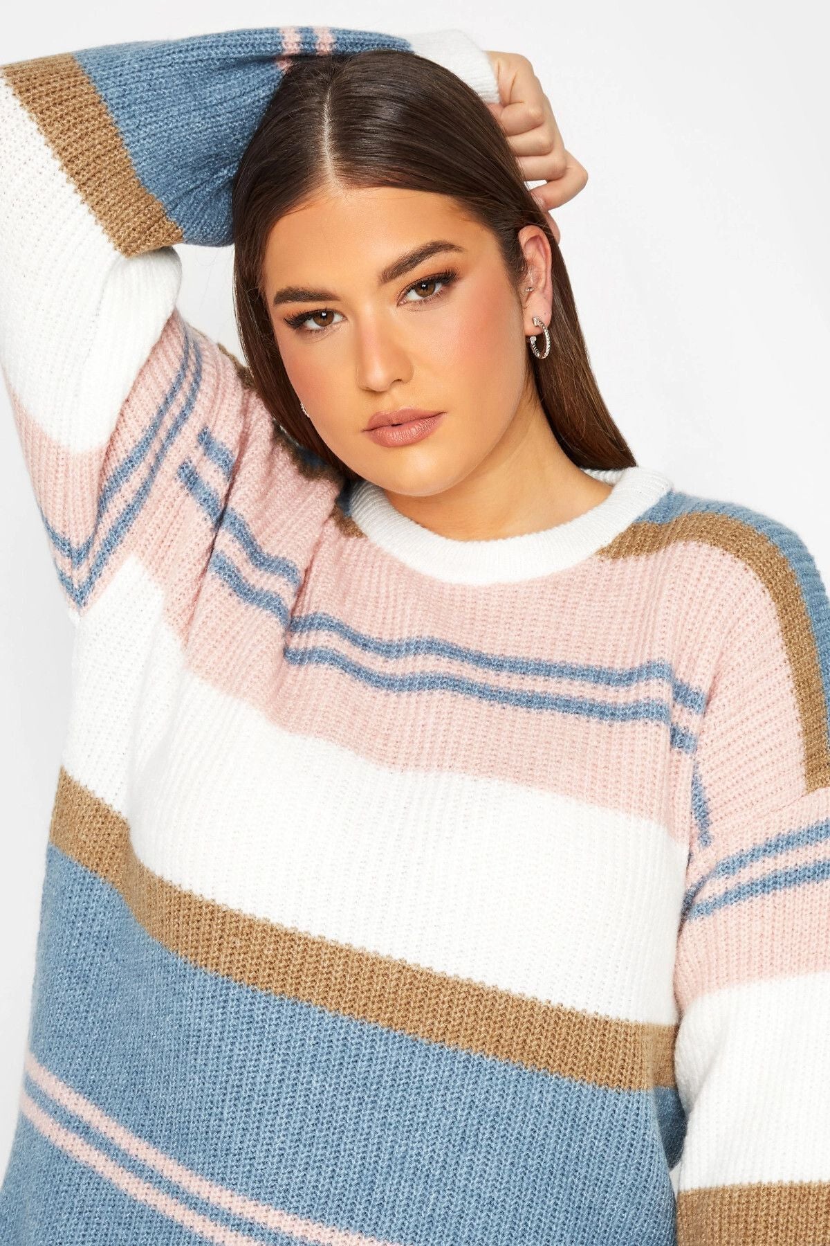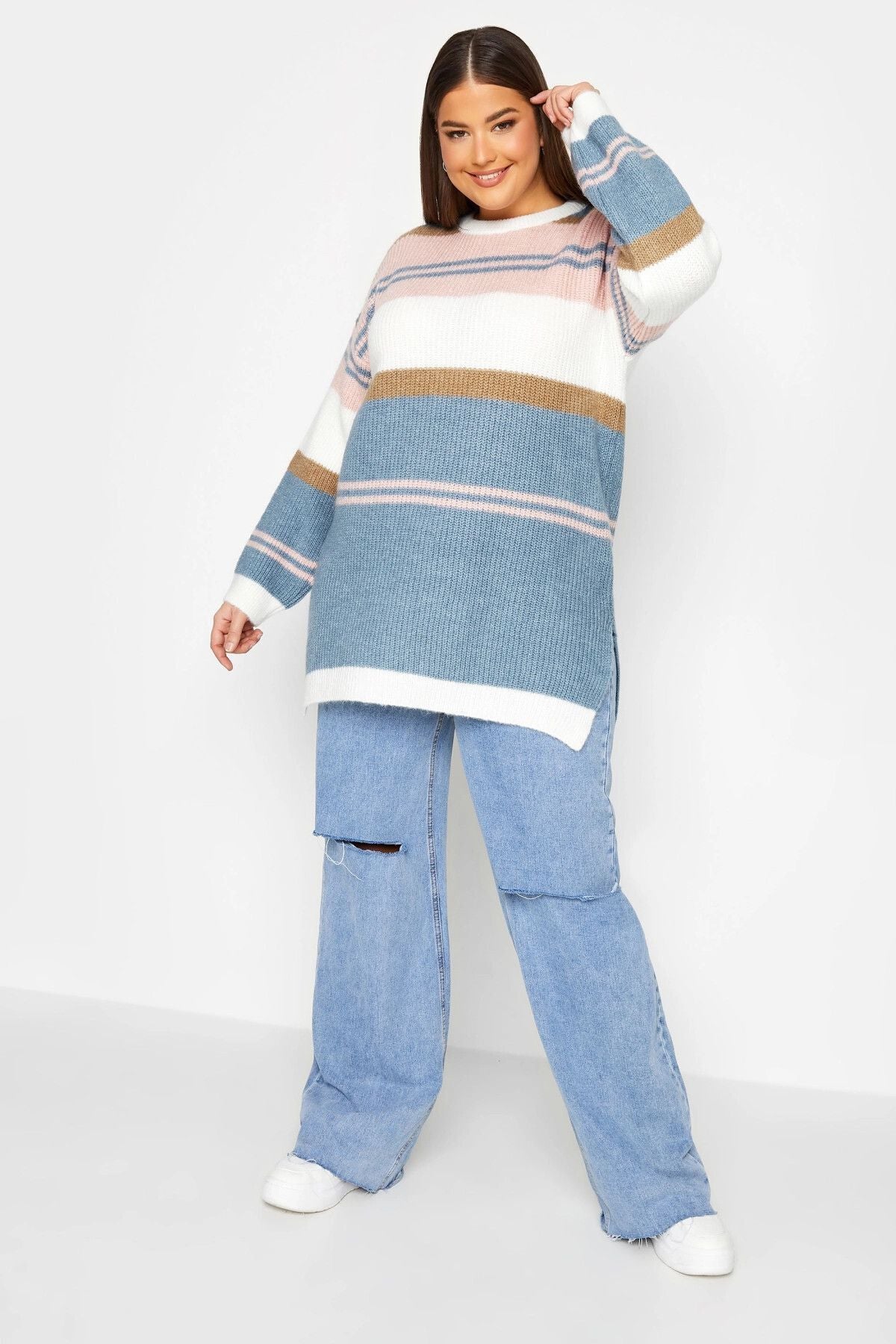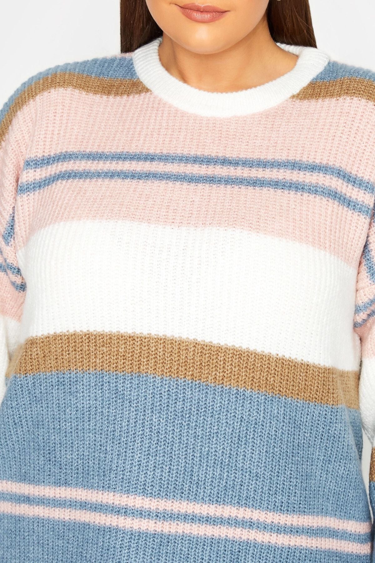 Büyük Beden Çizgili Yuvarlak Yaka Yırtmaç Detaylı Triko Kazak 301828