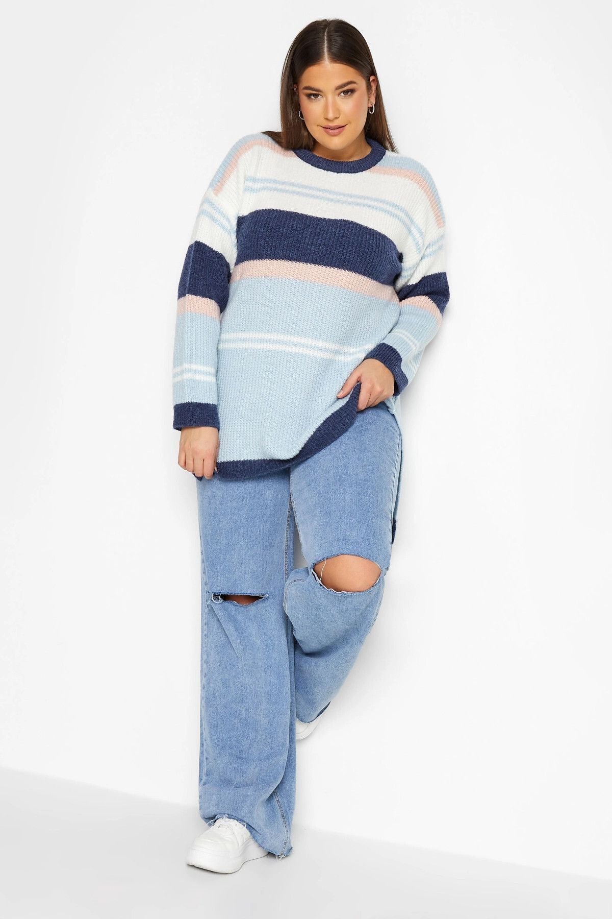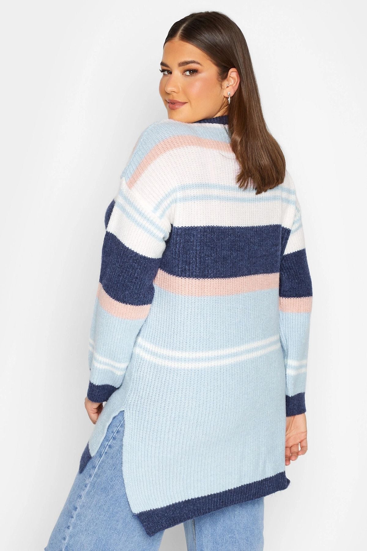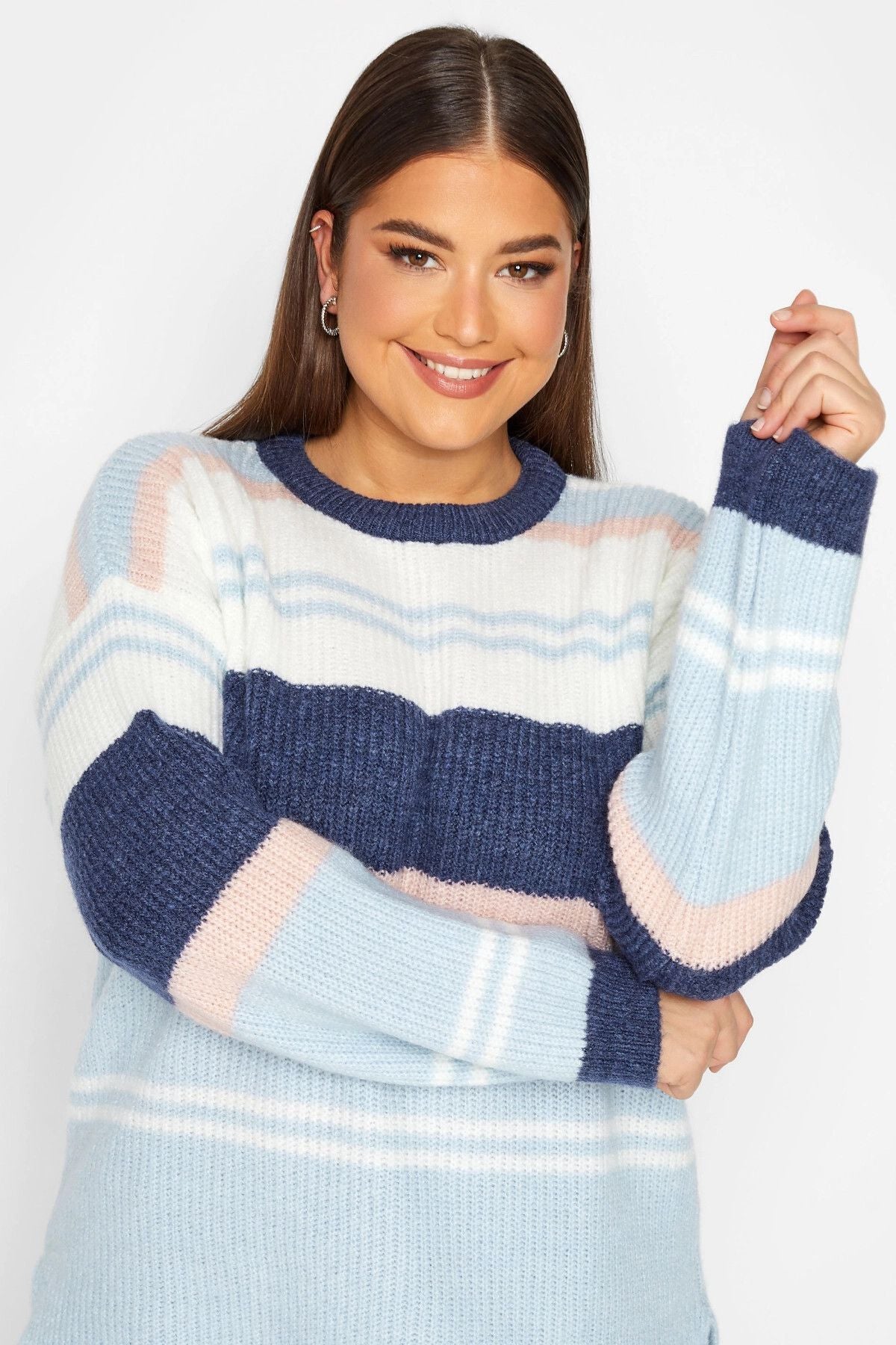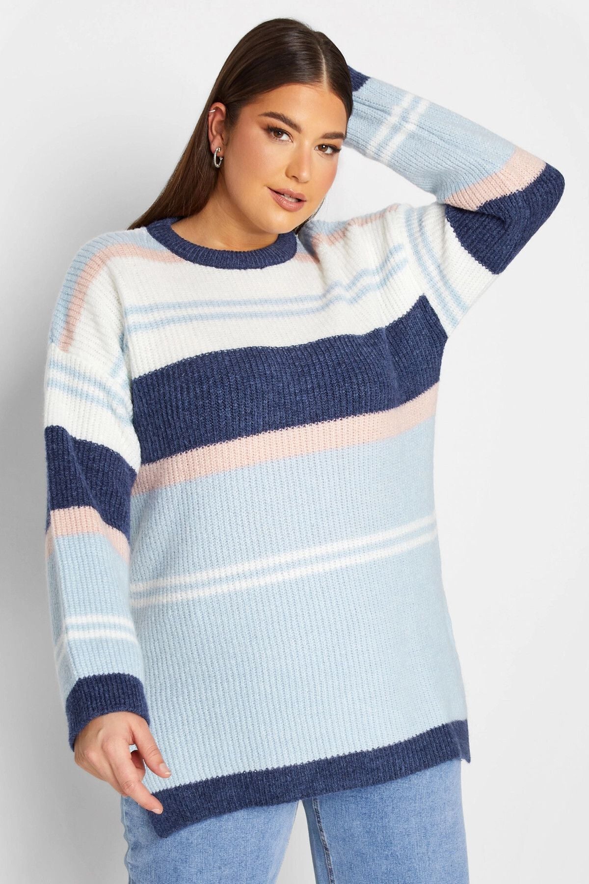 Büyük Beden Çizgili Yuvarlak Yaka Yırtmaç Detaylı Triko Kazak 301830