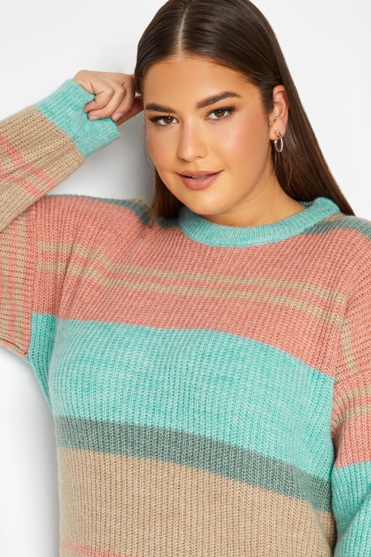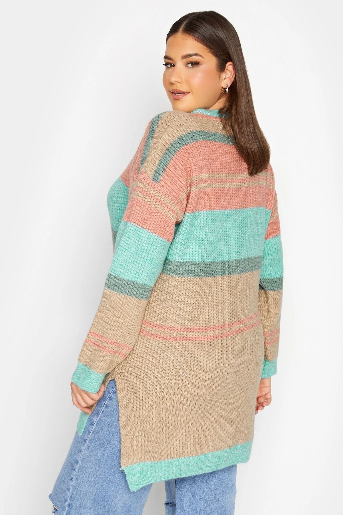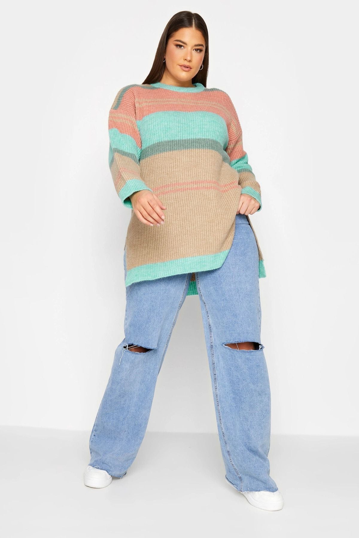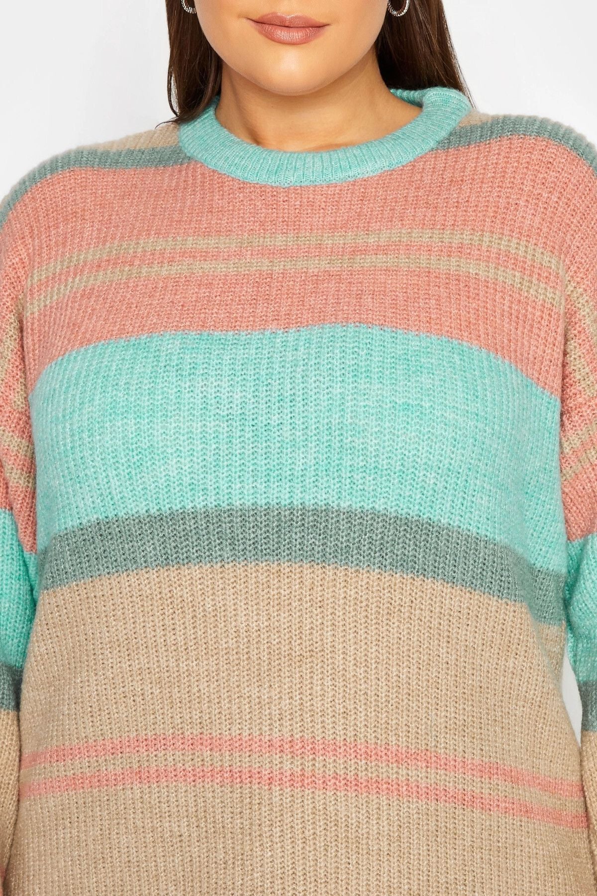 Büyük Beden Çizgili Yuvarlak Yaka Yırtmaç Detaylı Triko Kazak 301832