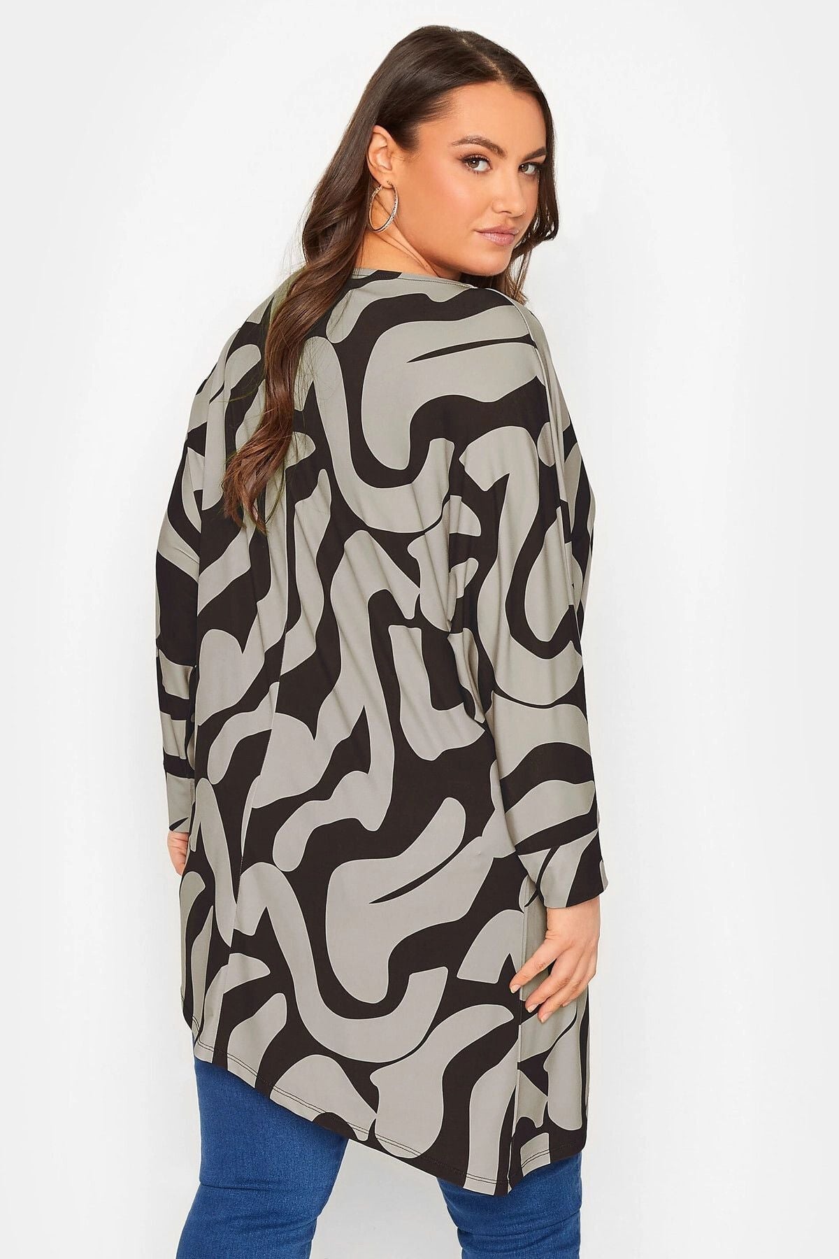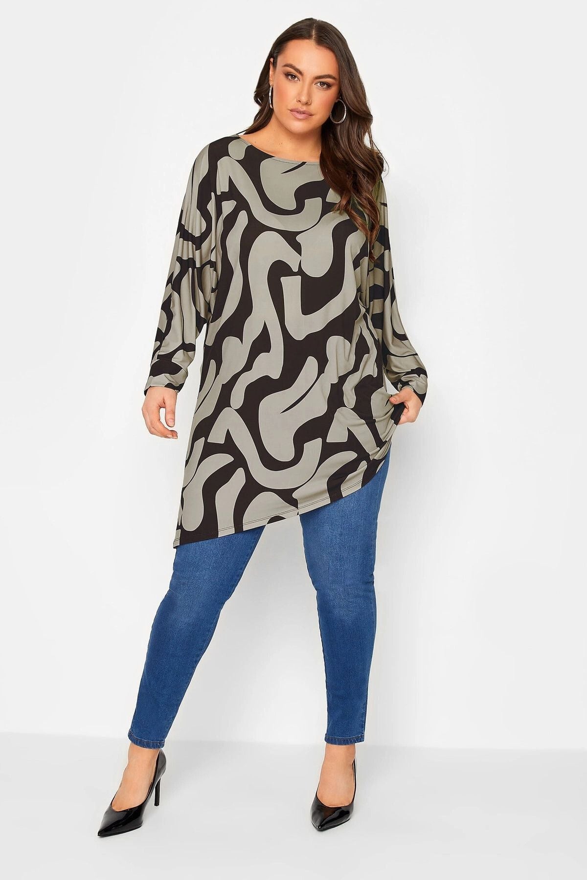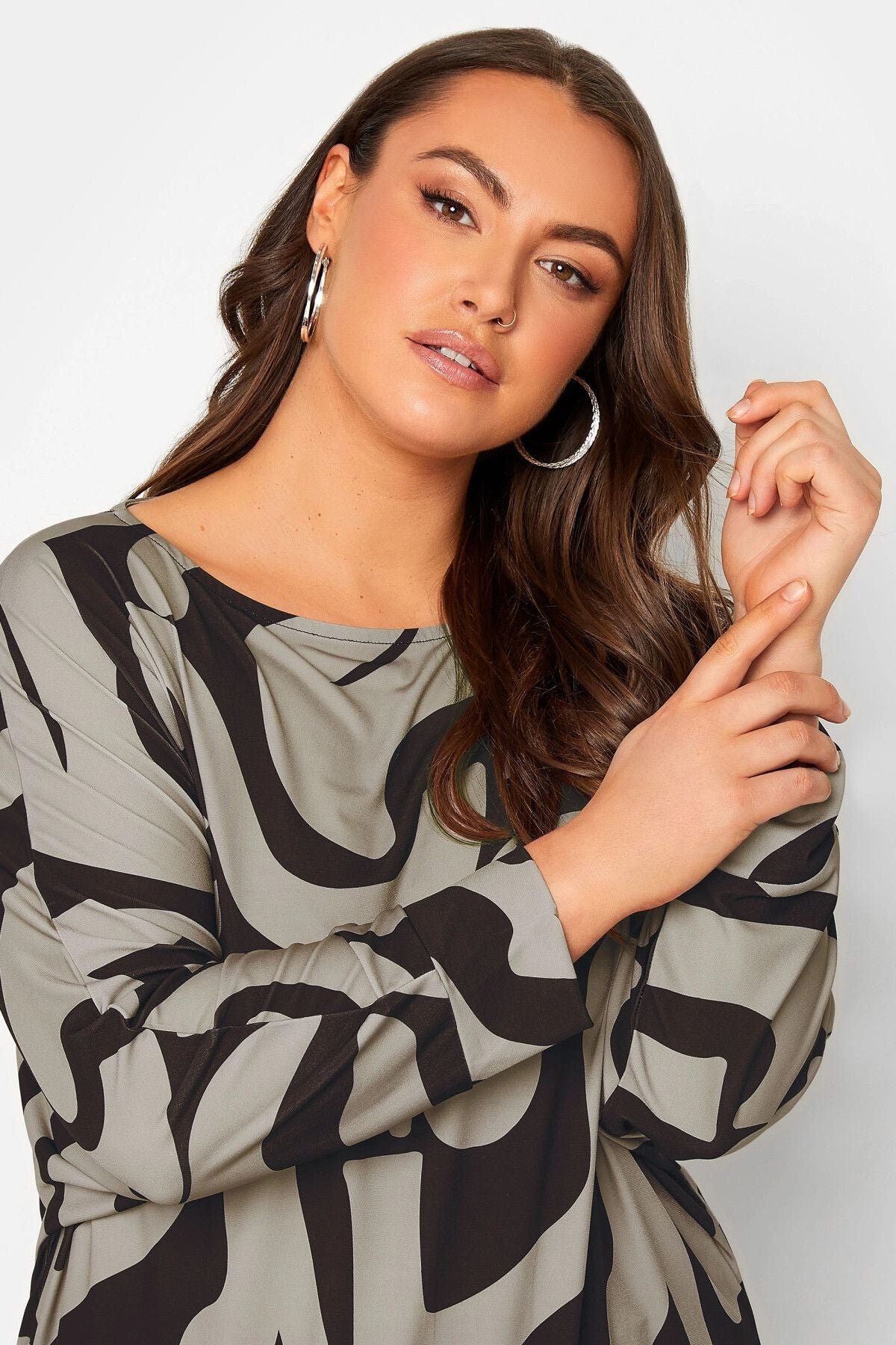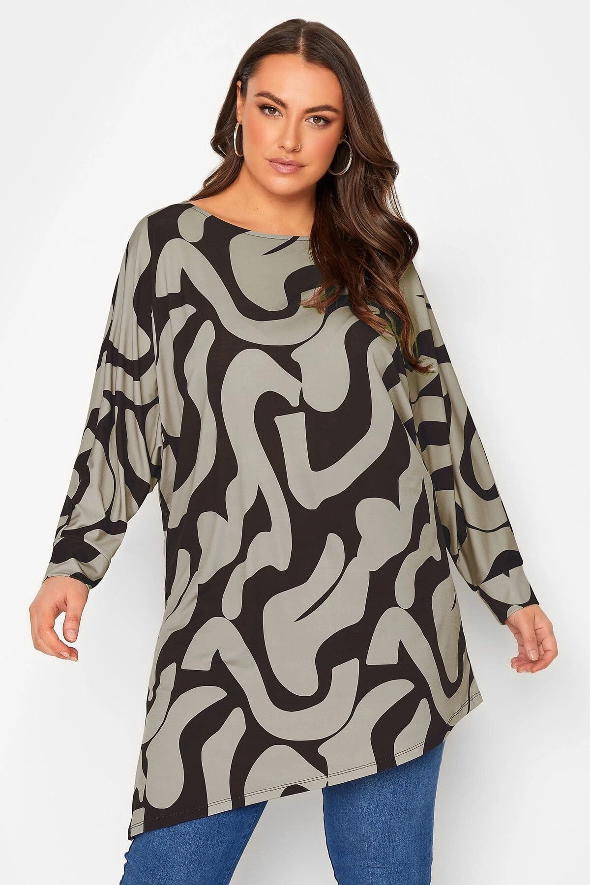 Büyük Beden Desenli Asimetrik Kesim Kayıkçı Yaka Uzun Kollu Bluz 302058