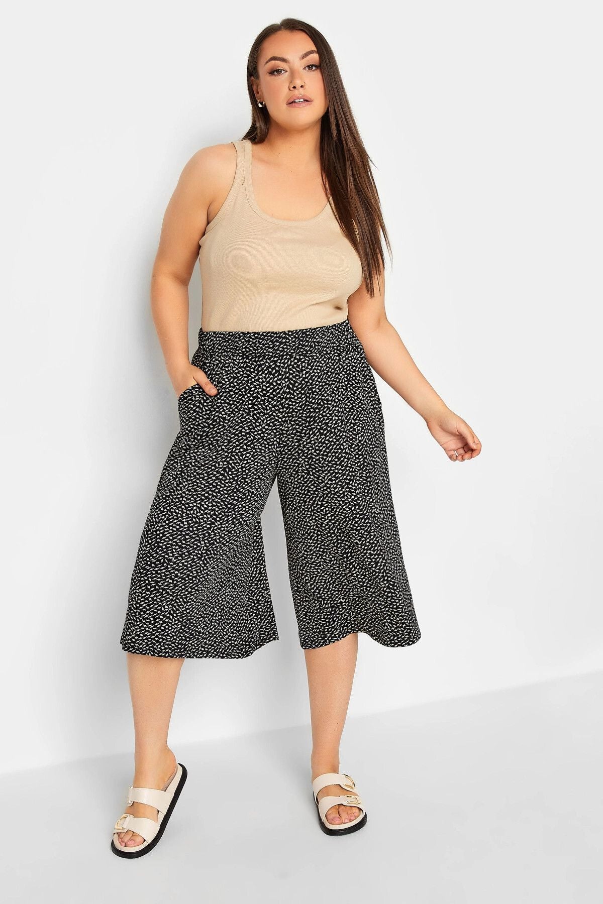 Büyük Beden Desenli Bol Kesim Cepli Likralı Kapri Pantolon 302426