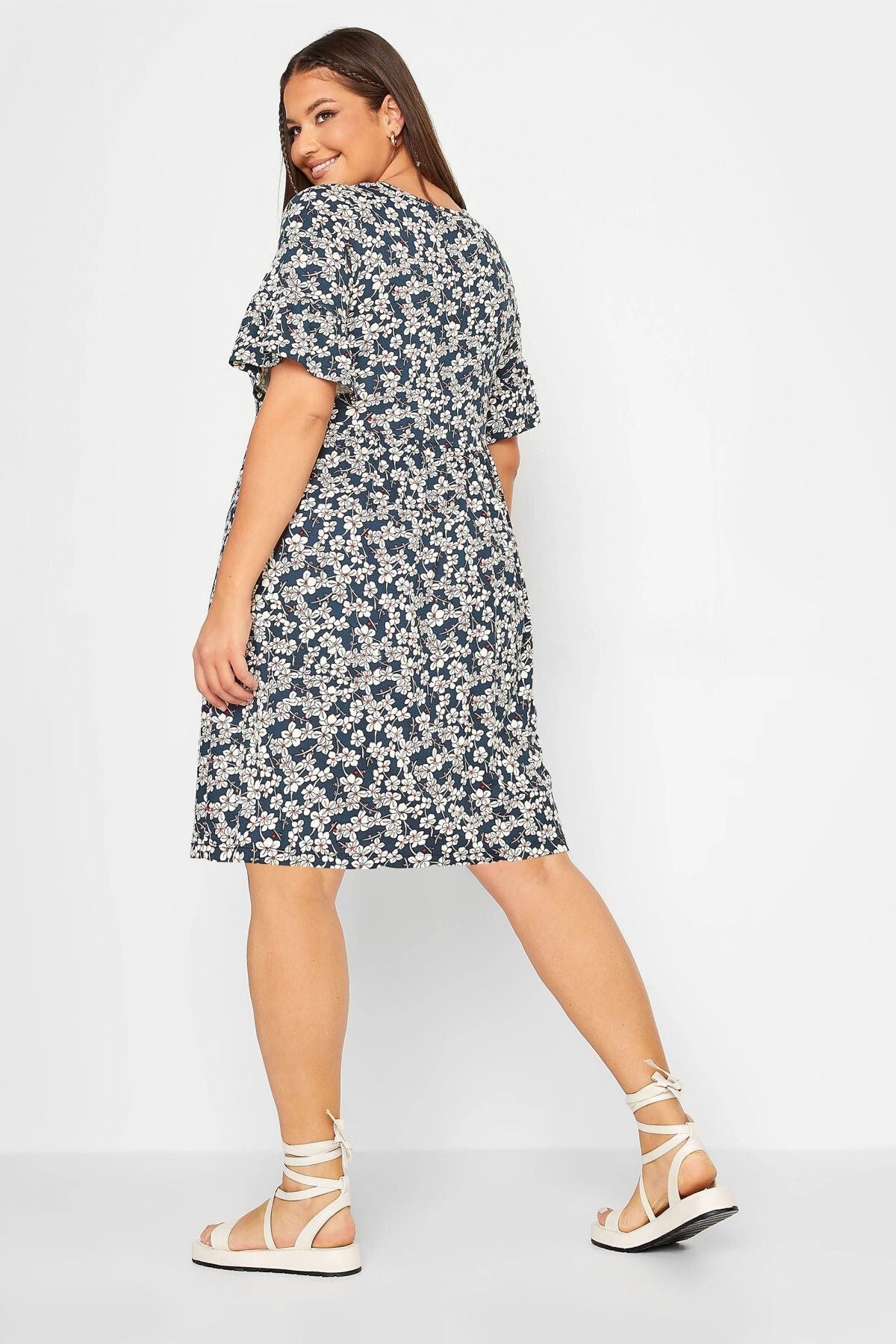 Büyük Beden Desenli Fırfırlı Yarım Kol Likralı Kısa Elbise 302358