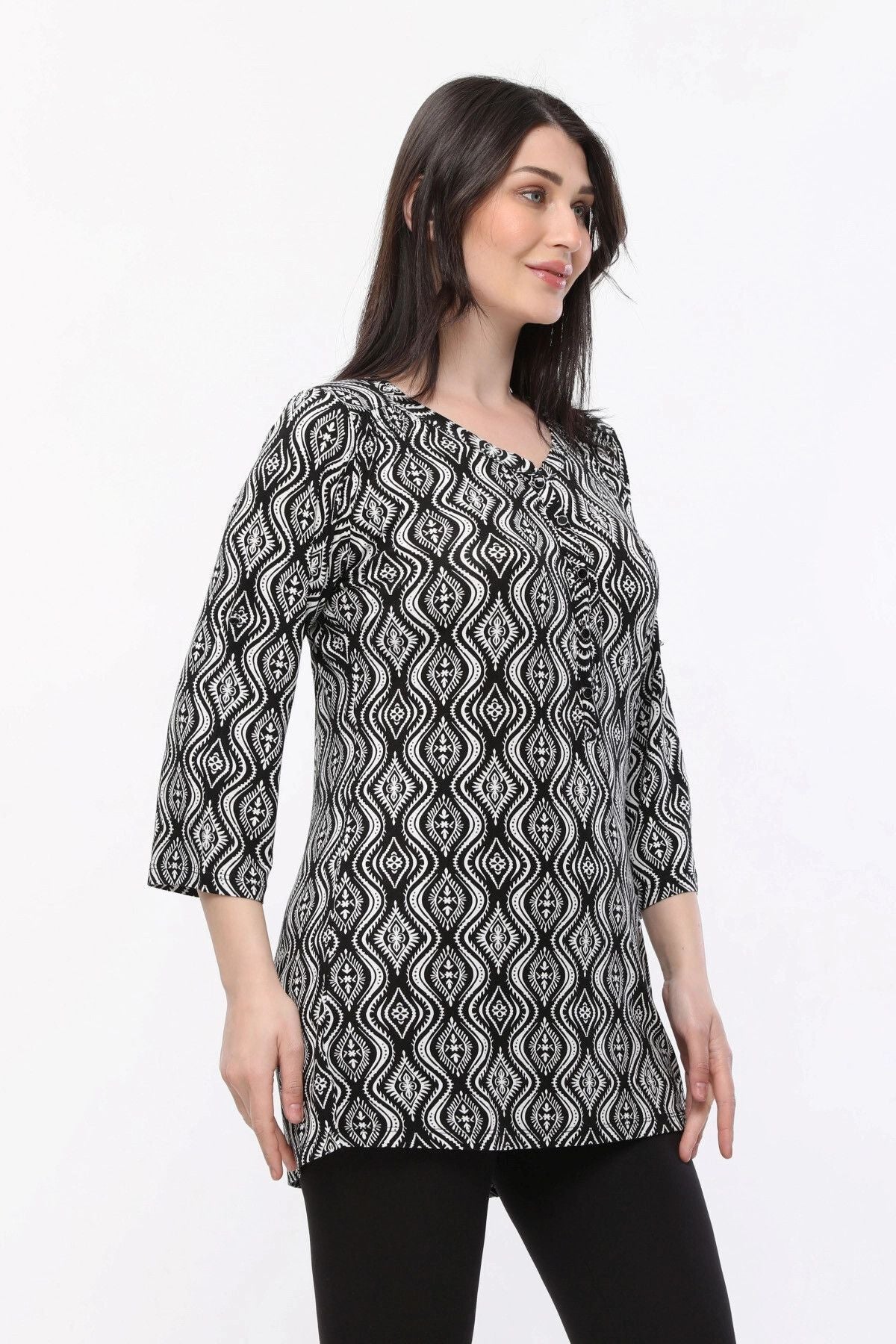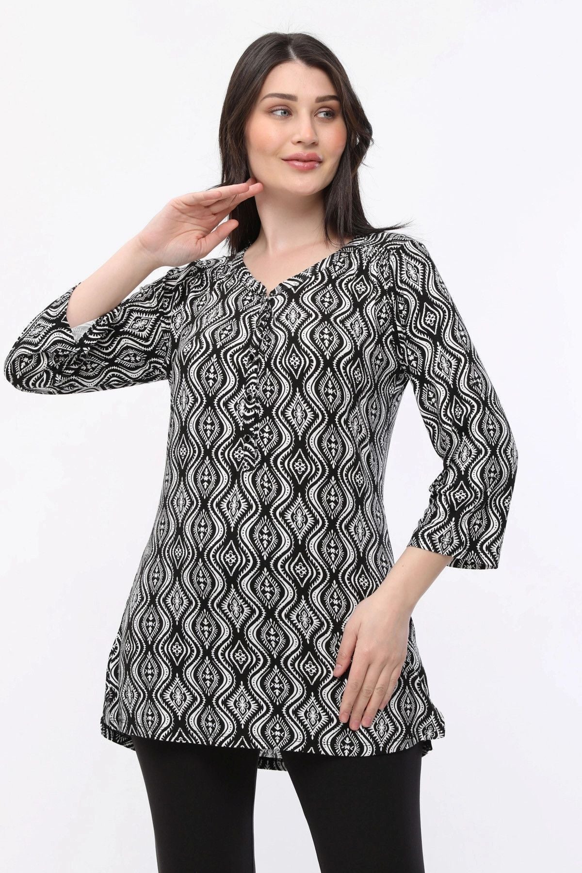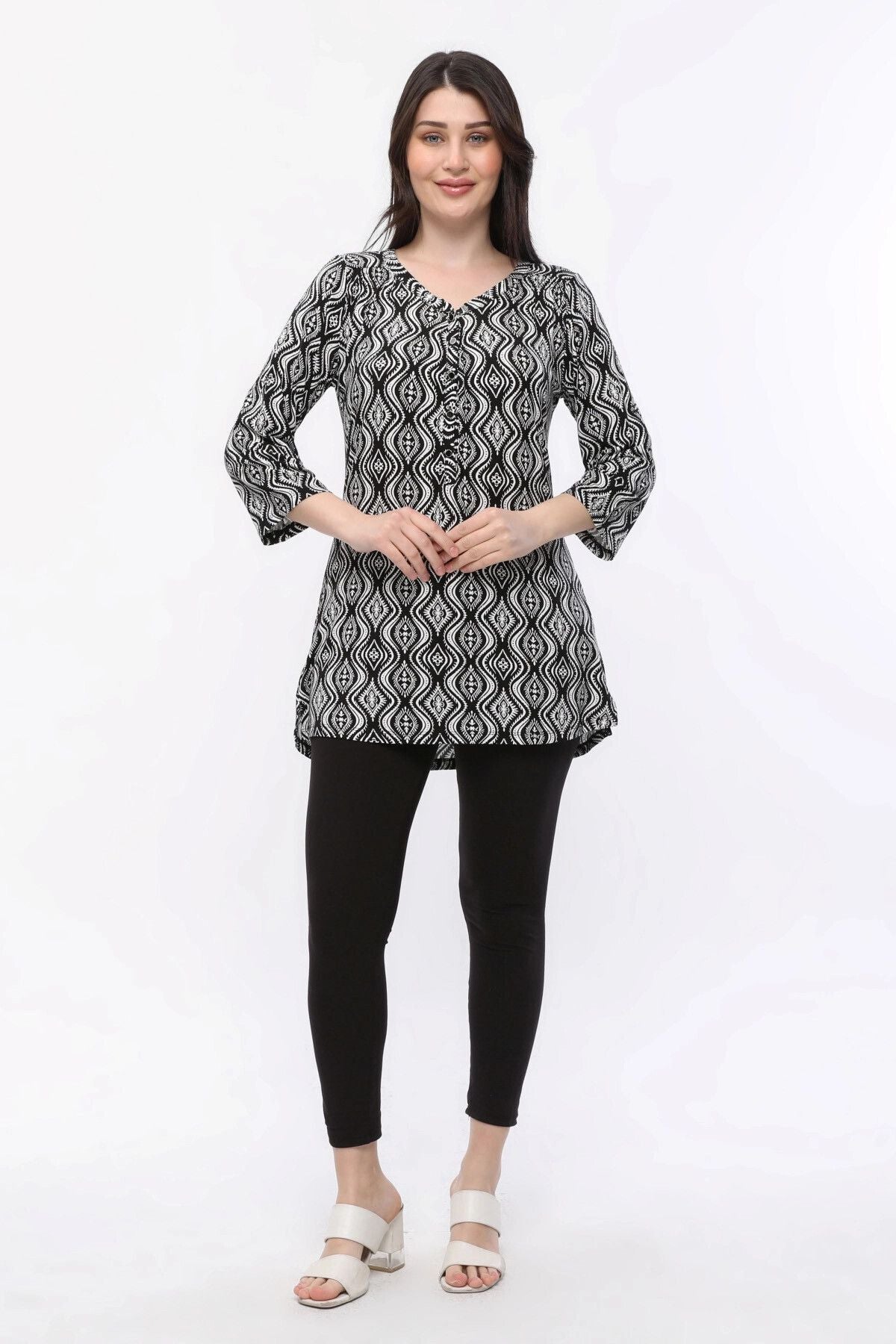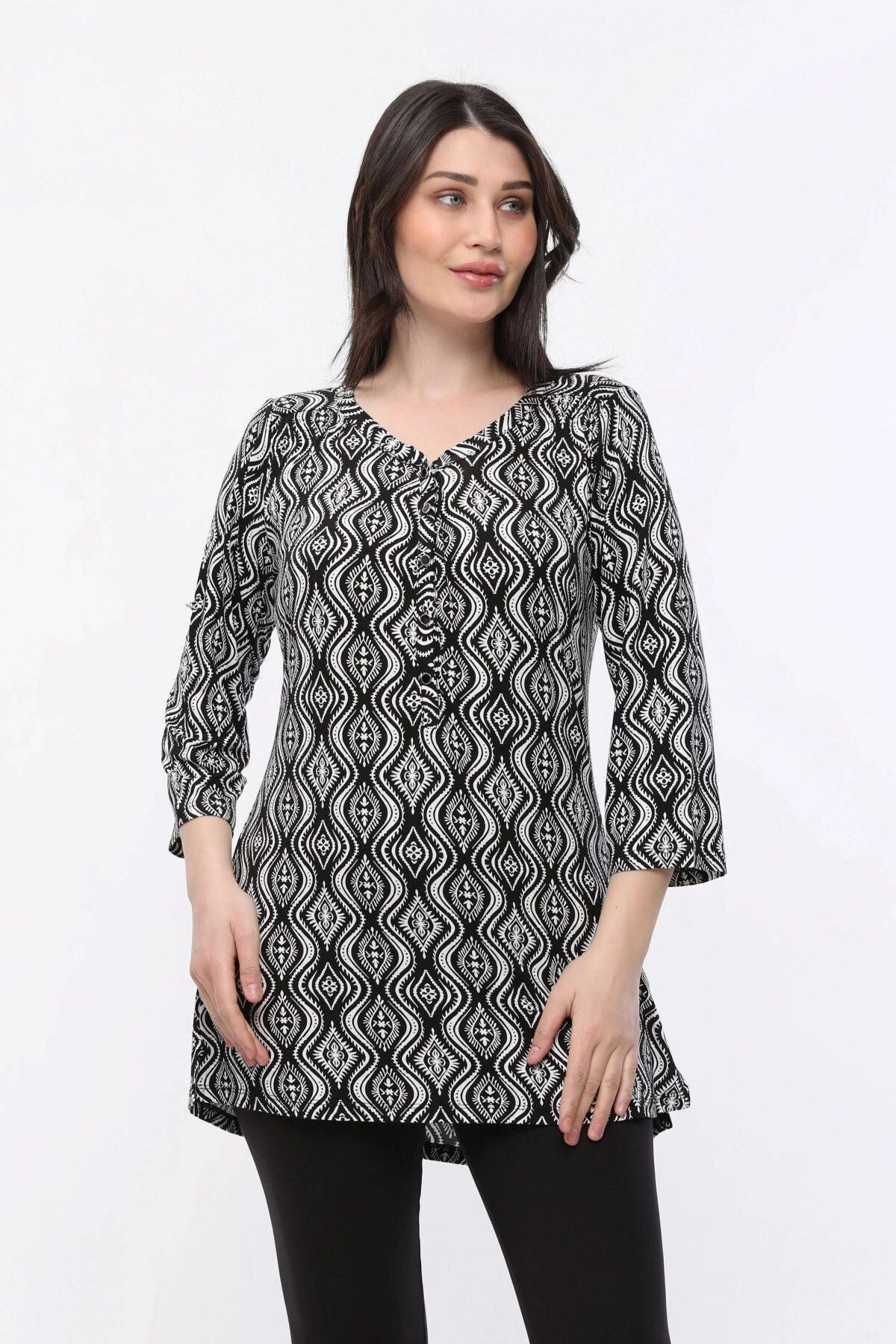 Büyük Beden Desenli Önü Düğmeli Fakir Kol Bluz E15156