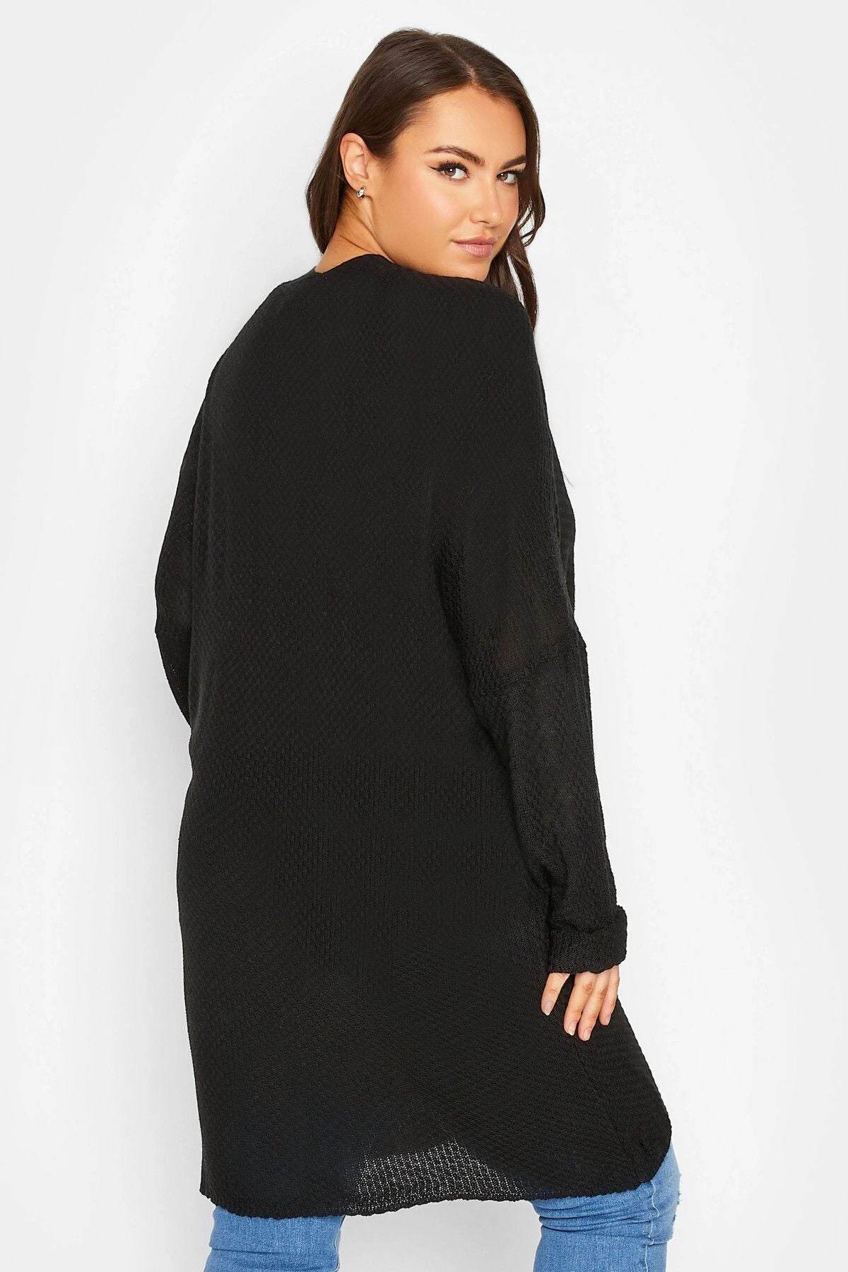 Büyük Beden Düğmesiz Nervürlü Örme Uzun Kollu Midi Hırka 300286
