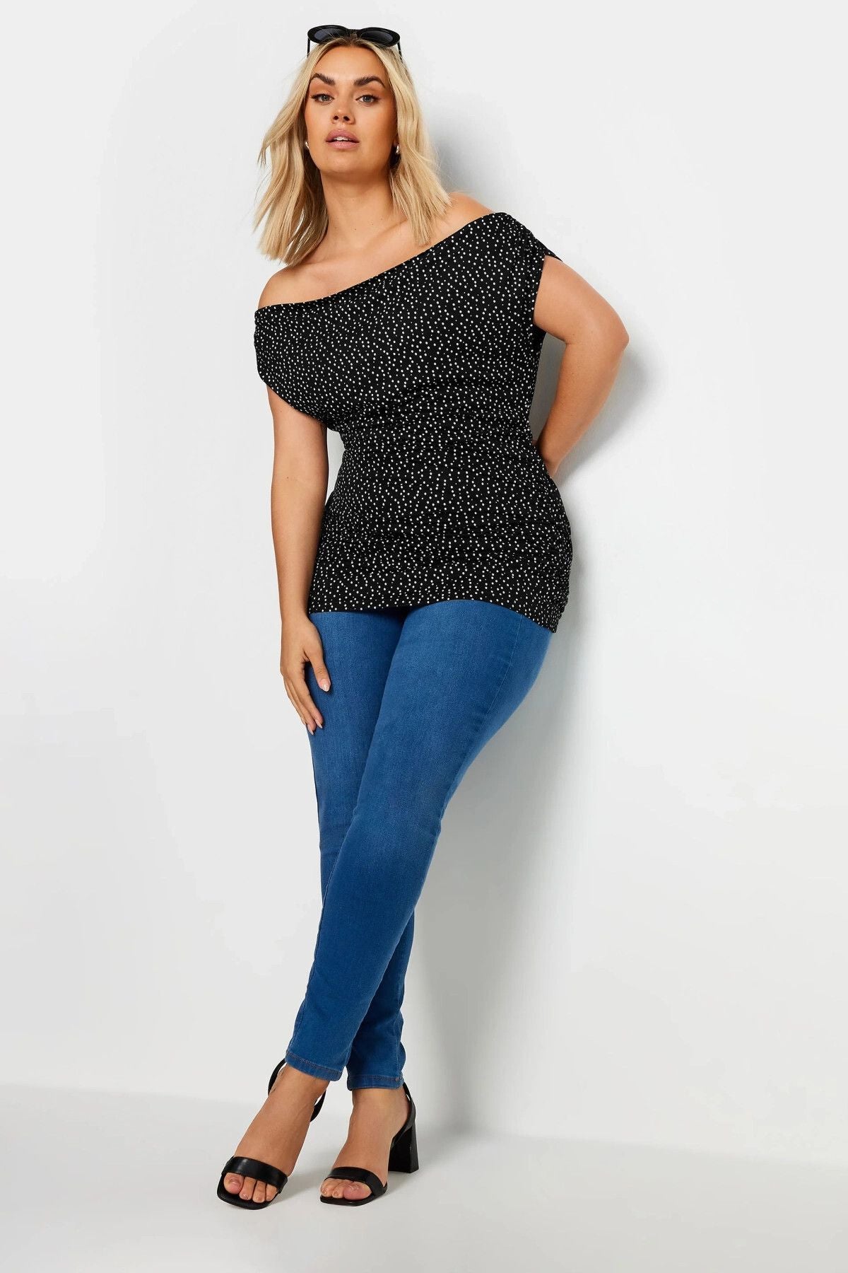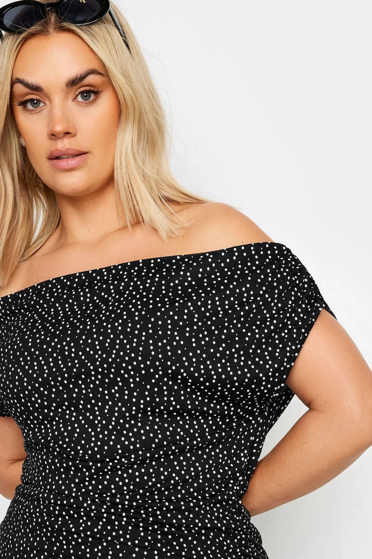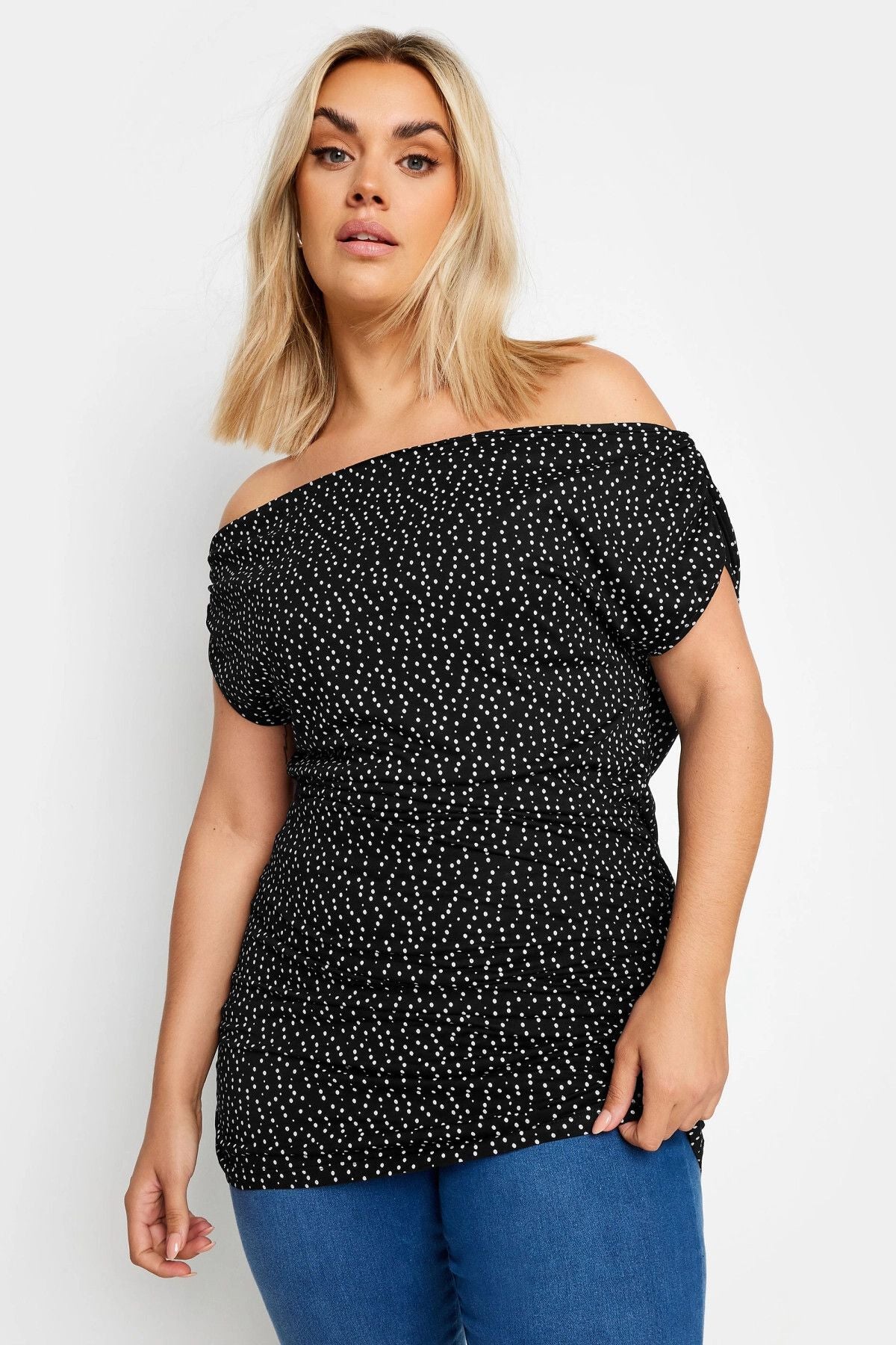 Büyük Beden Düşük Omuz Kolları Drapeli Puantiye Desenli Bluz 303353