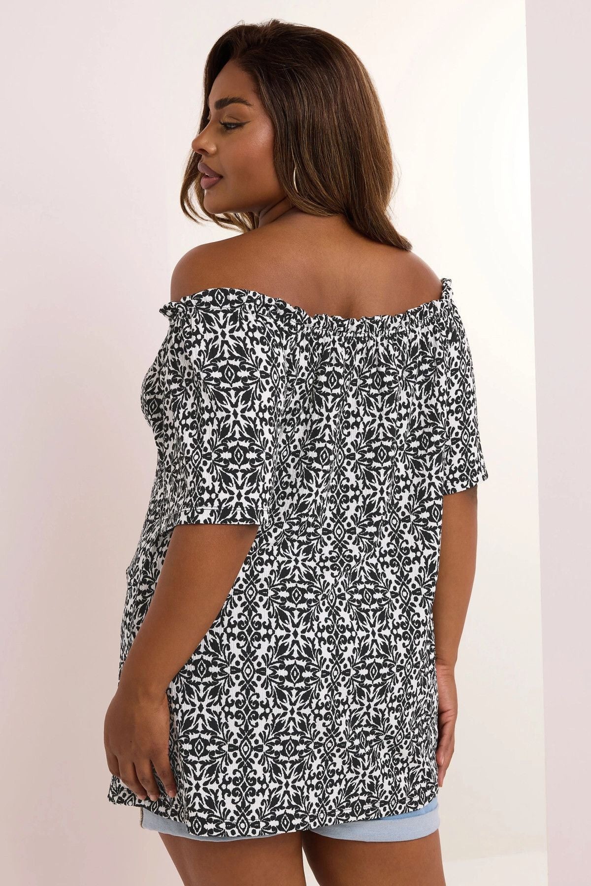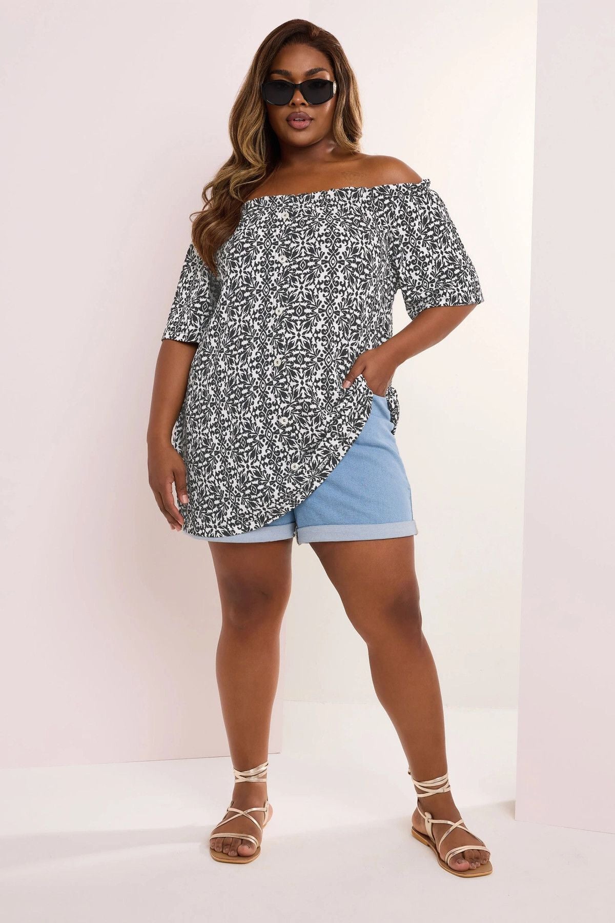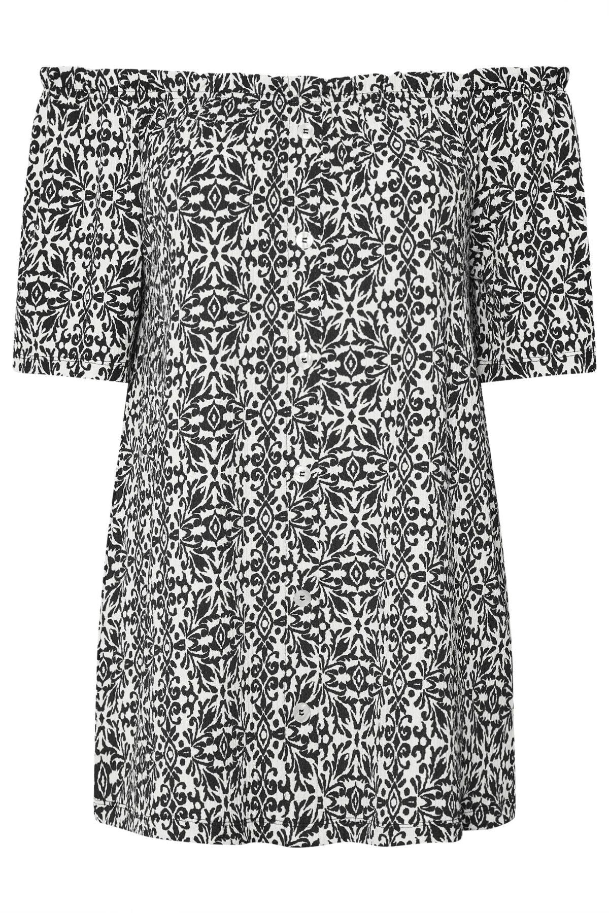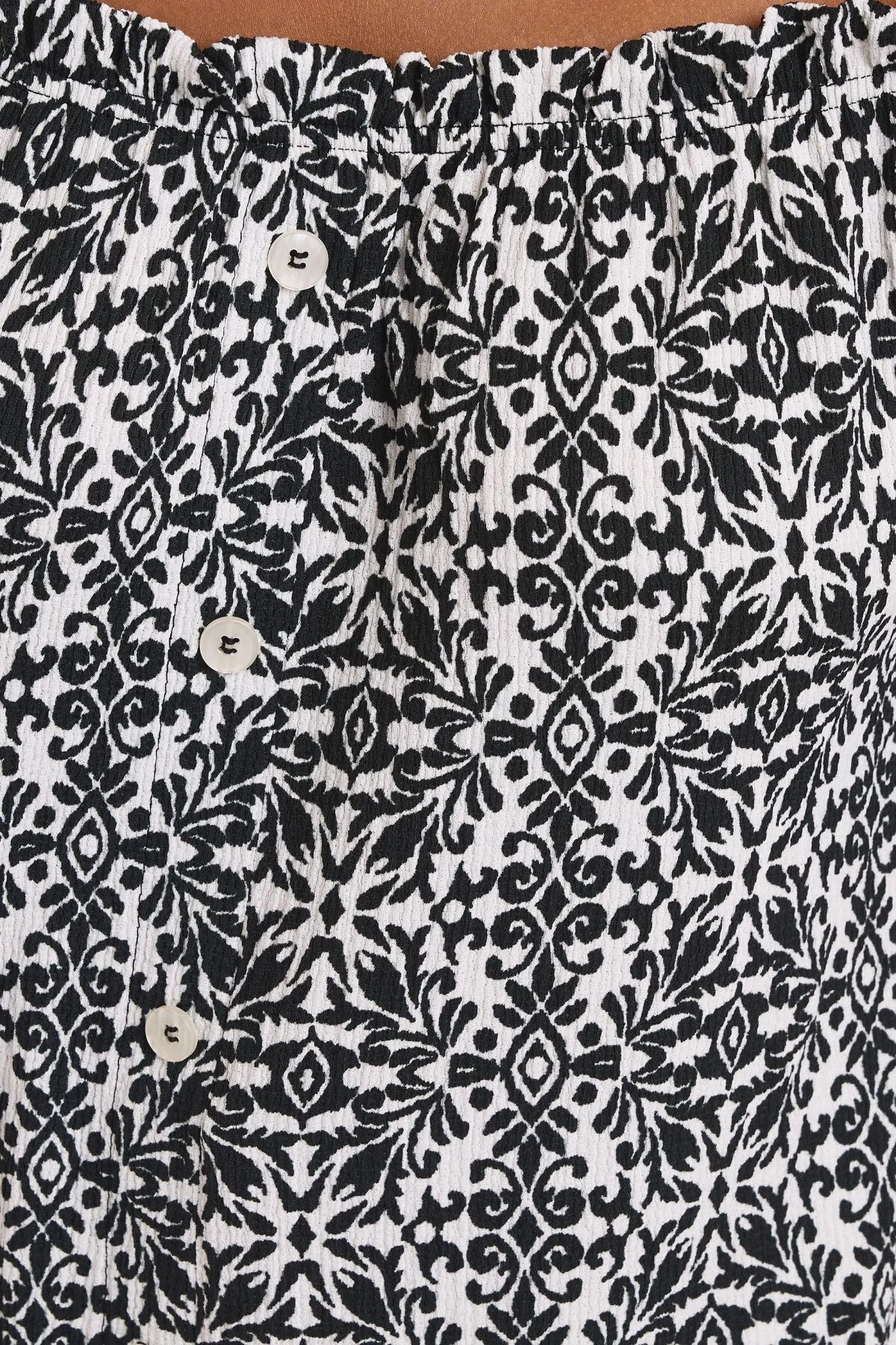 Büyük Beden Düşük Omuzlu Kısa Kollu Düğme Detaylı Desenli Bluz 322679