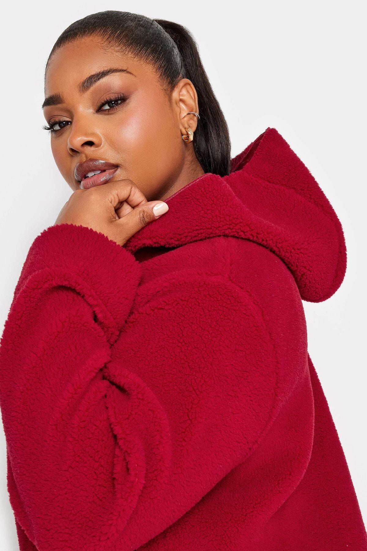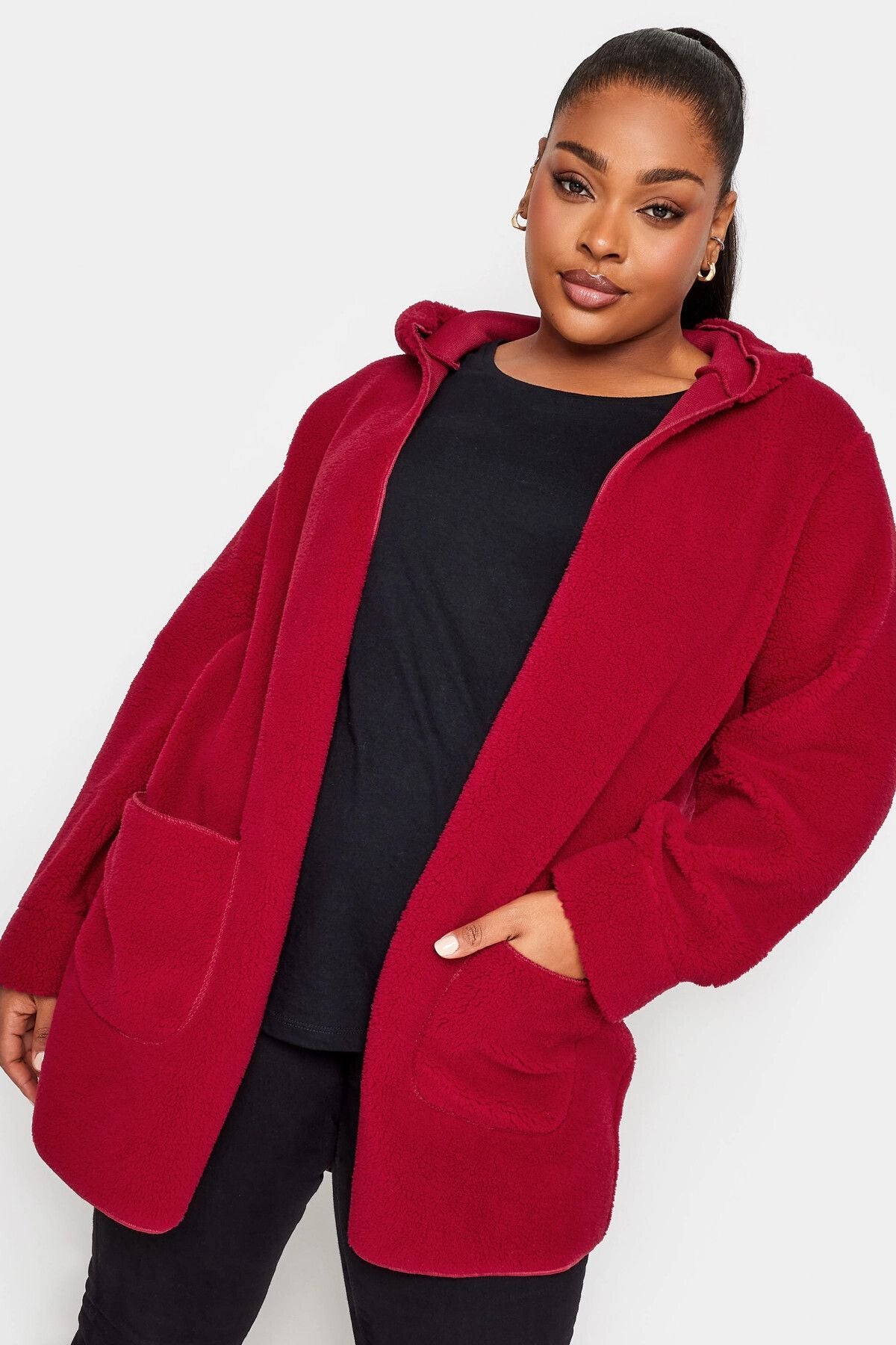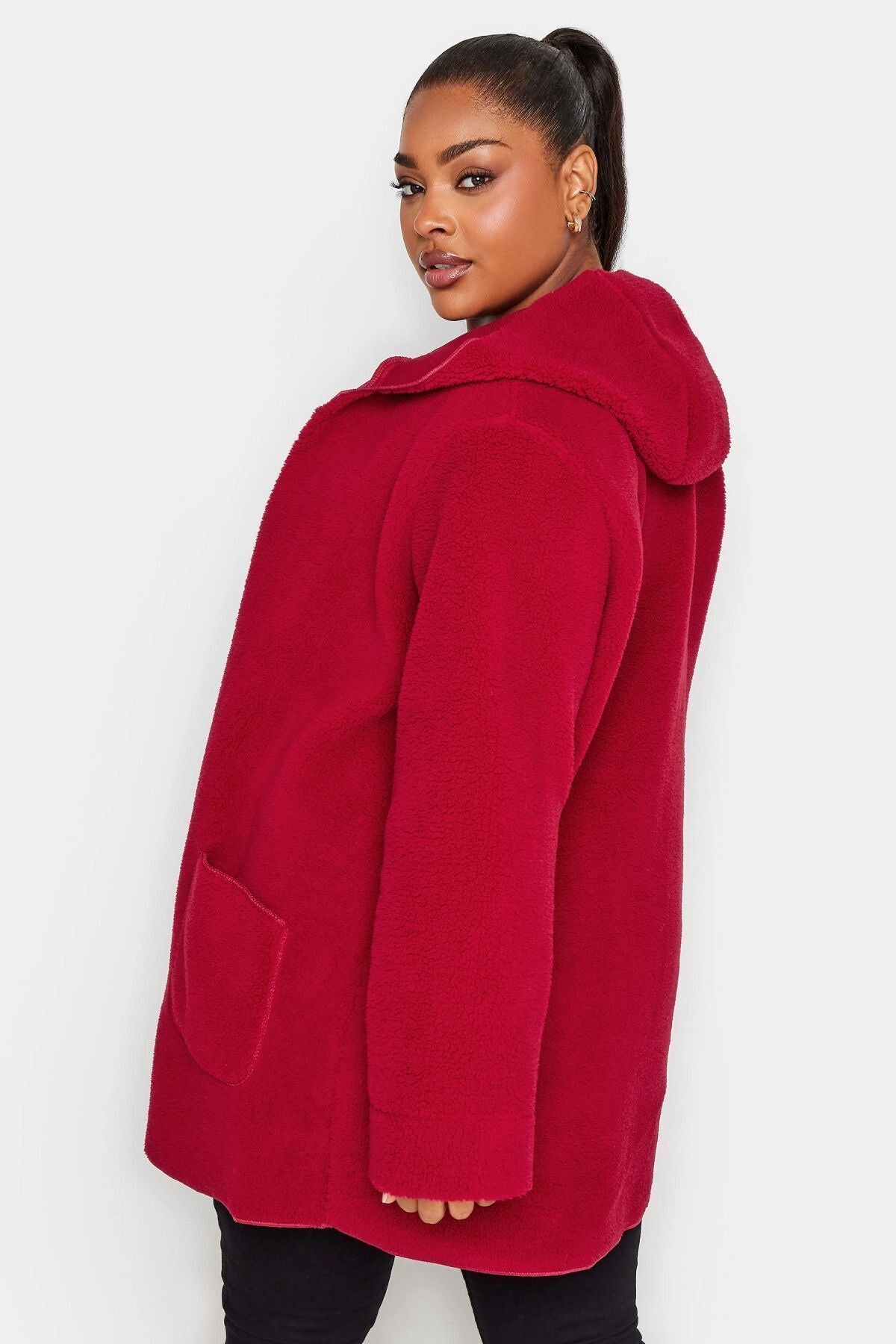 Büyük Beden Kapüşonlu Düğmesiz Önü Cepli Peluş İnce Ceket 302659