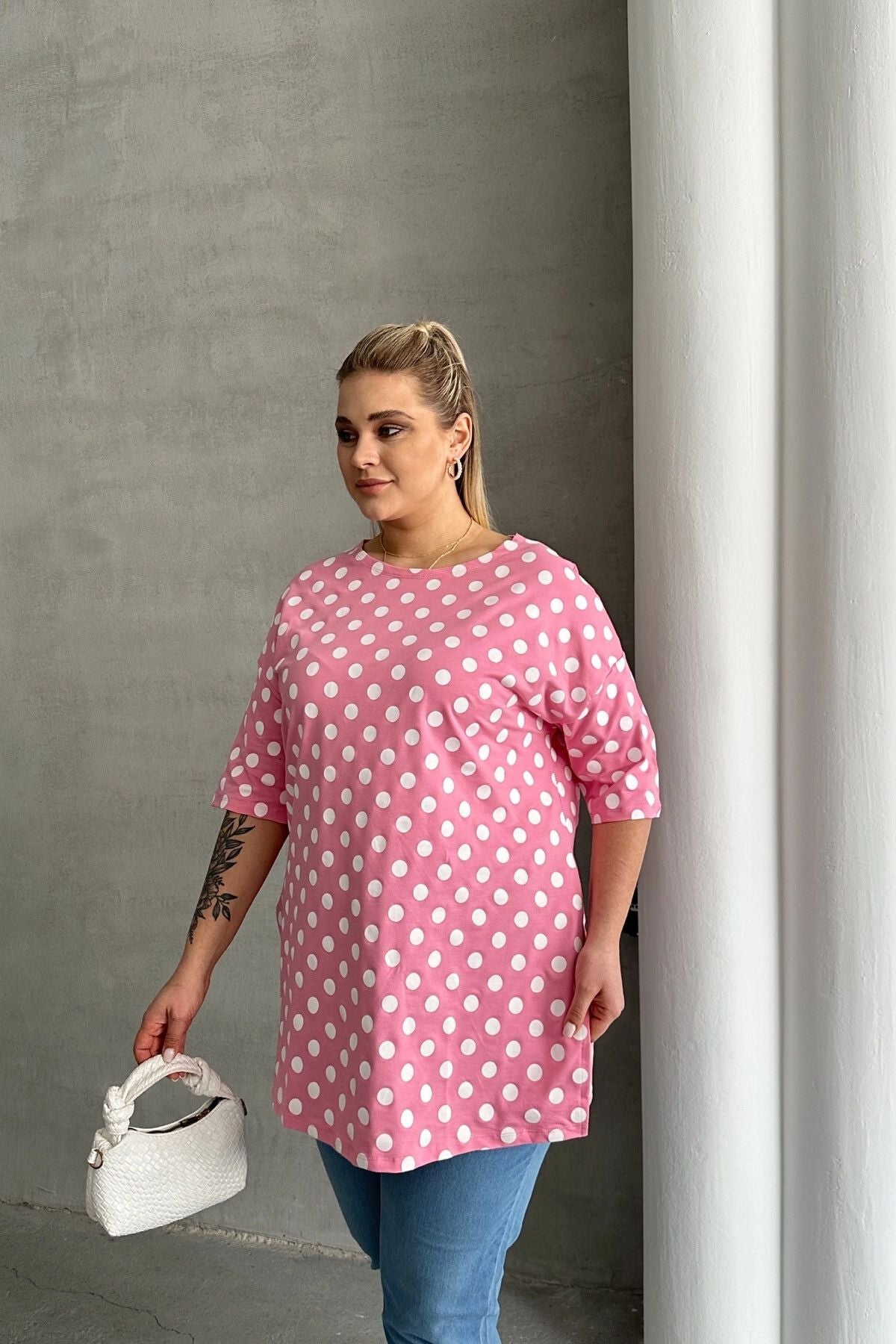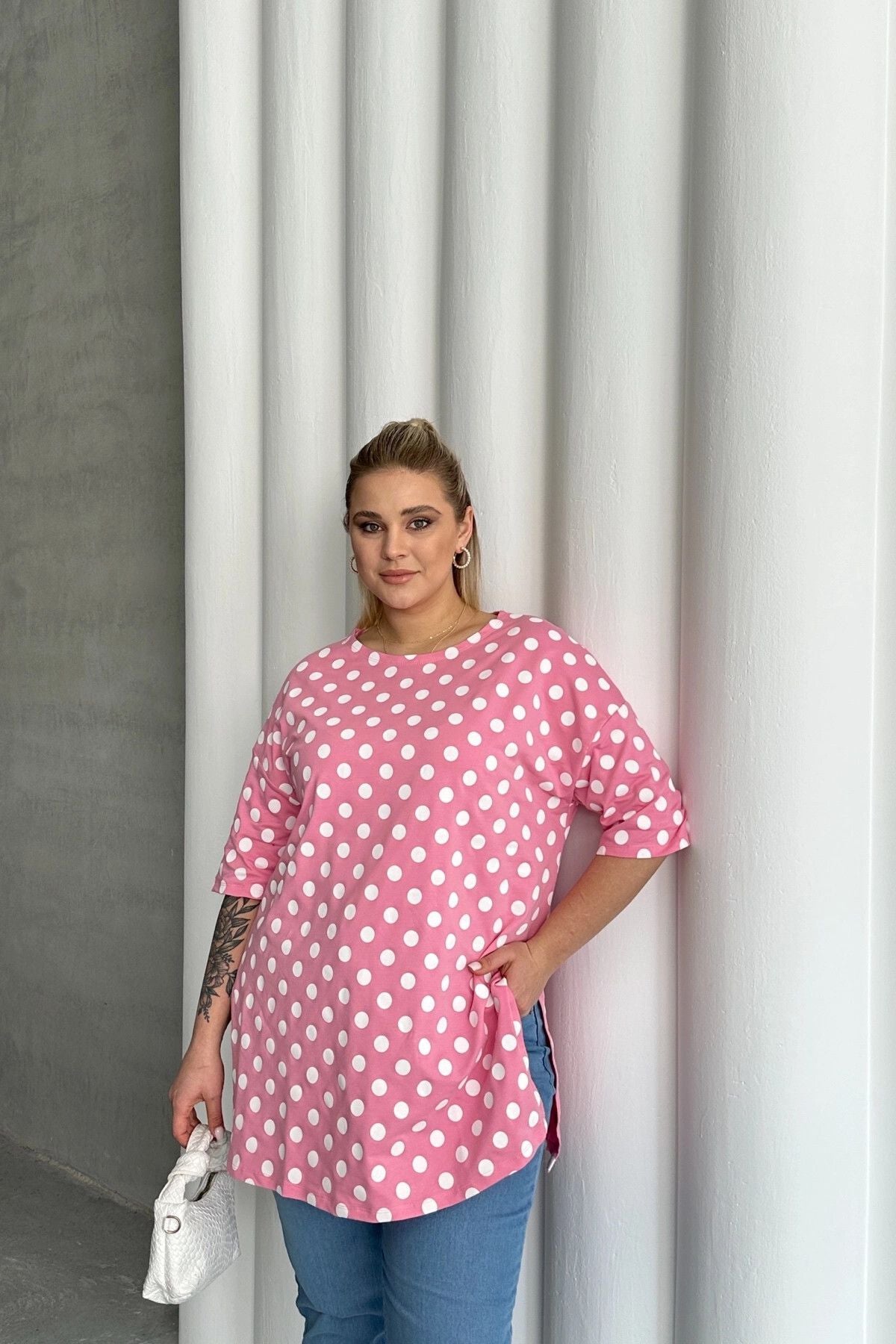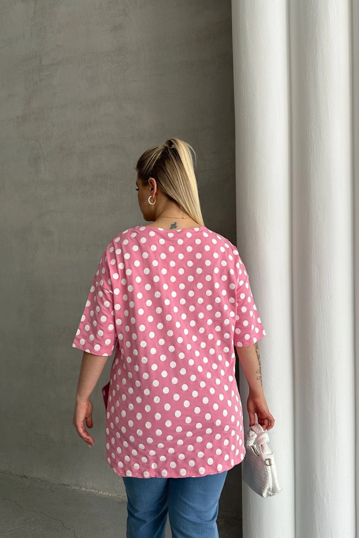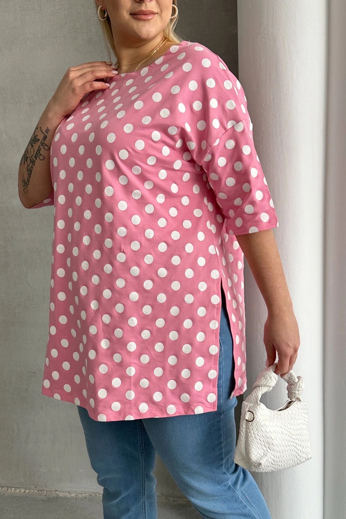 Büyük Beden Kısa Kollu Bisiklet Yaka Yanları Yırtmaçlı Puantiyeli Bluz 98-55