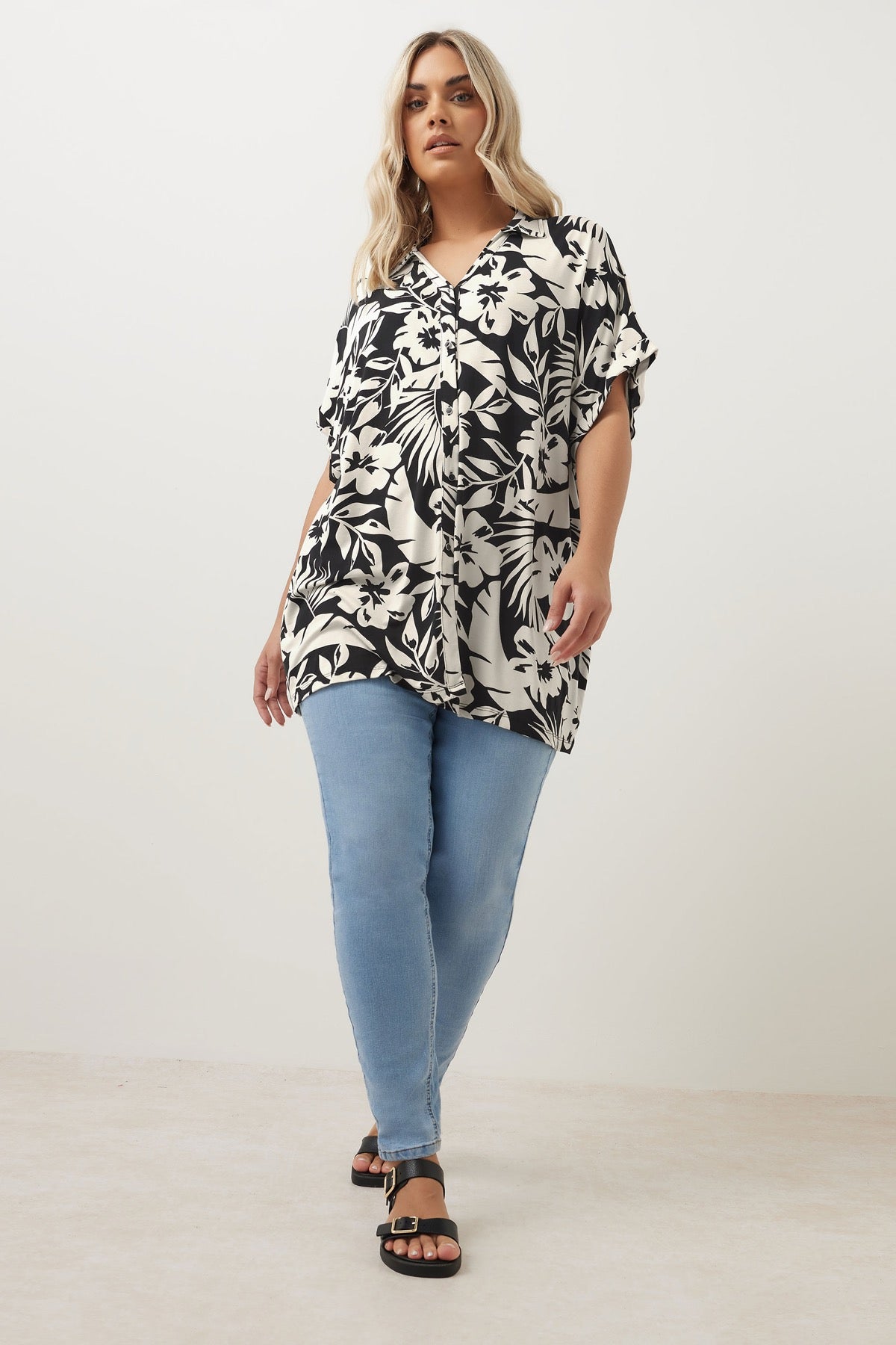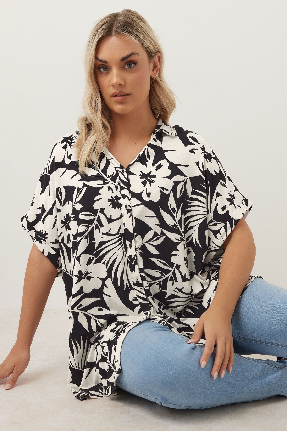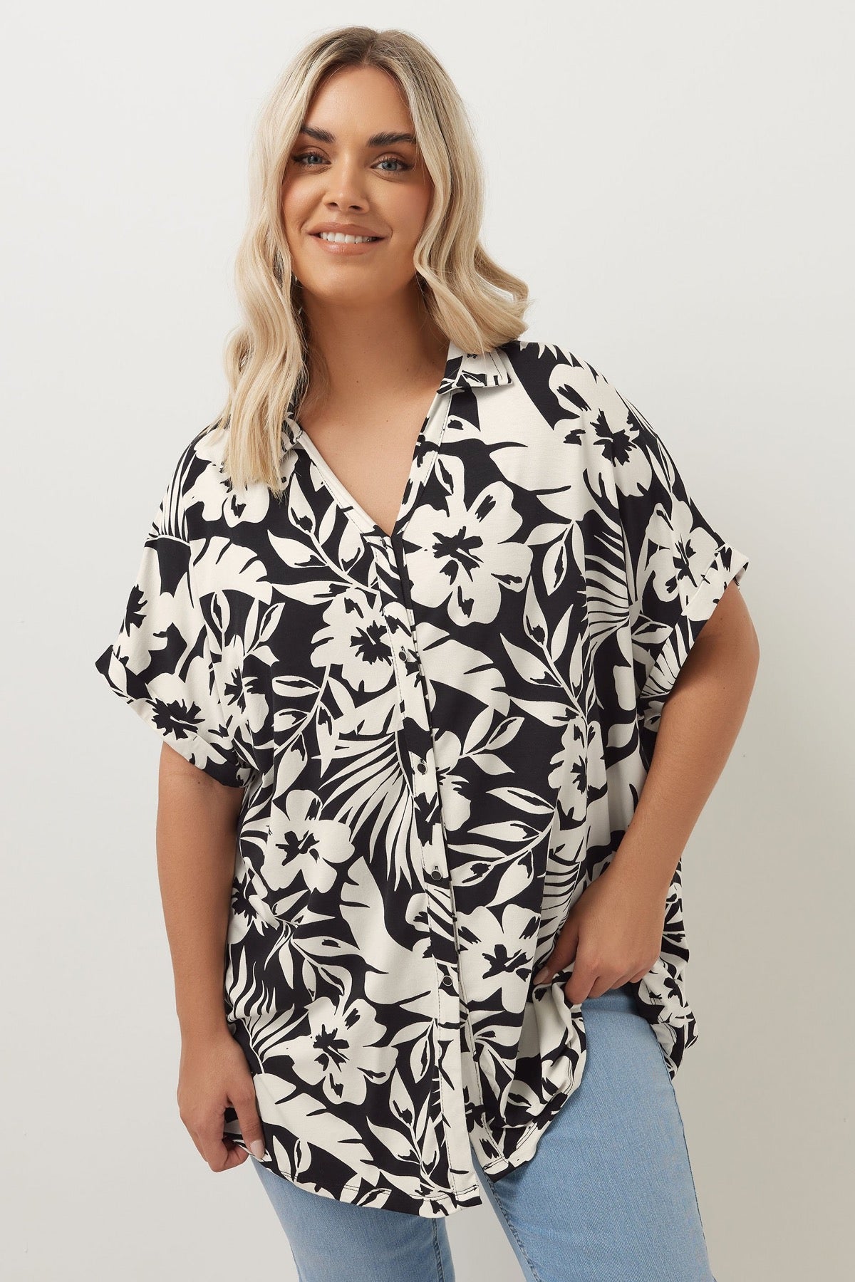 Büyük Beden Kısa Kollu Çiçek Desenli Gömlek 303686