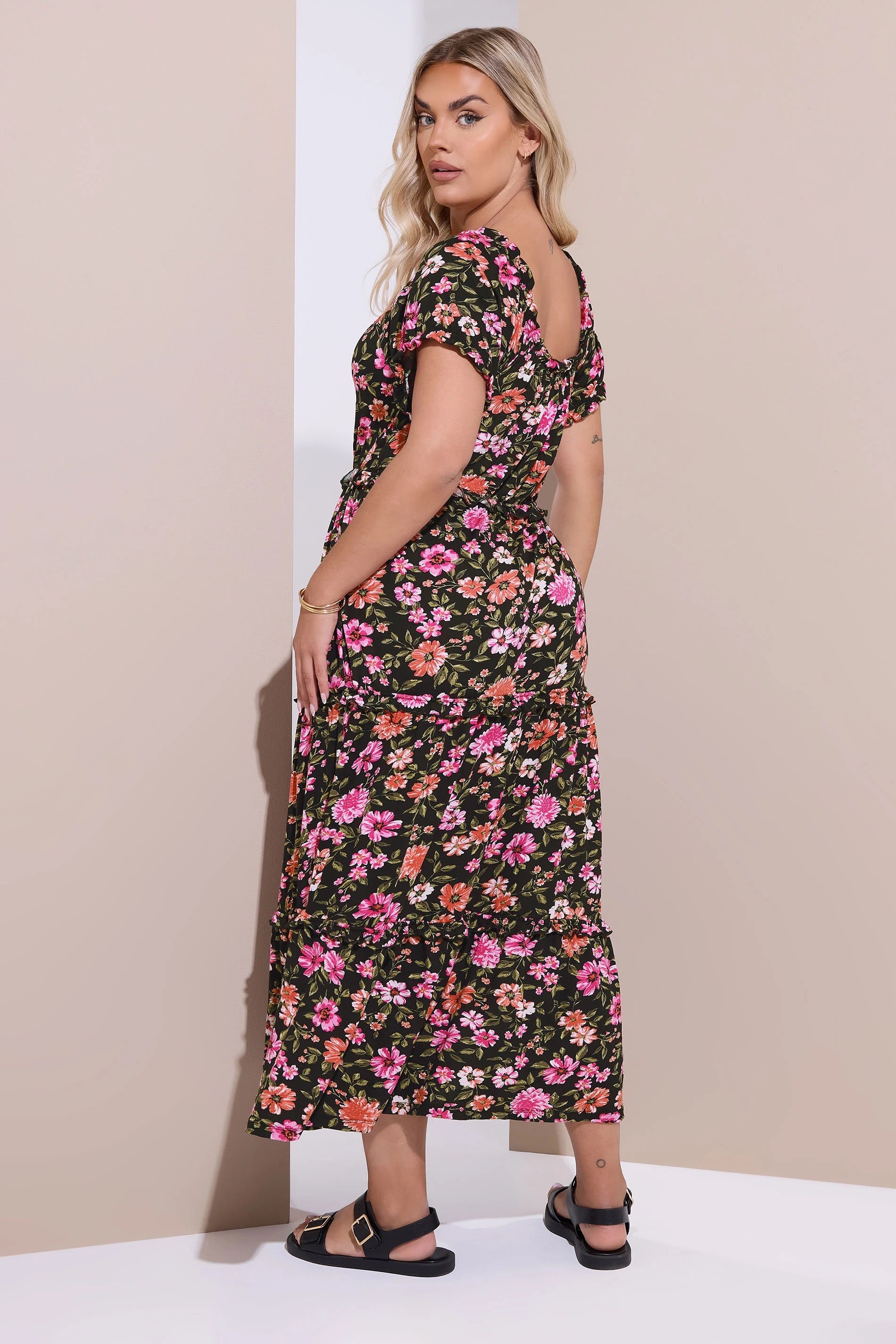 Büyük Beden Kısa Kollu Çiçek Desenli Yakası Büzgülü Maxi Elbise 270237