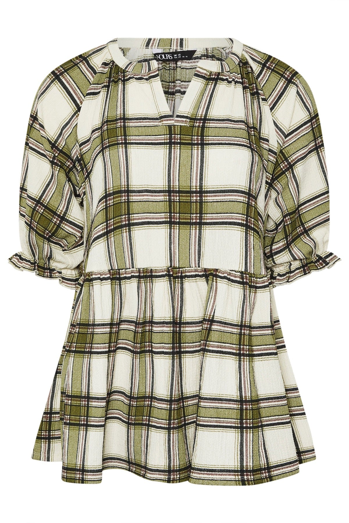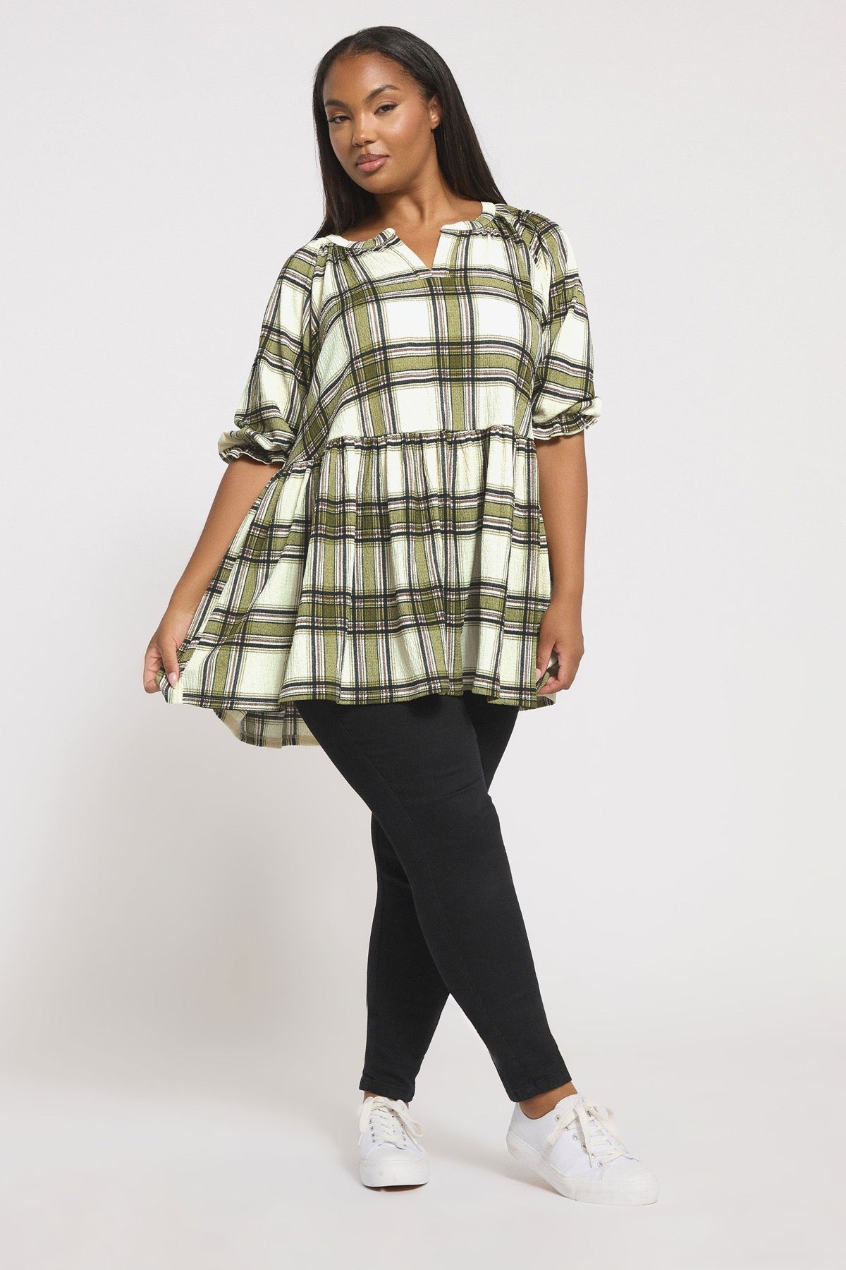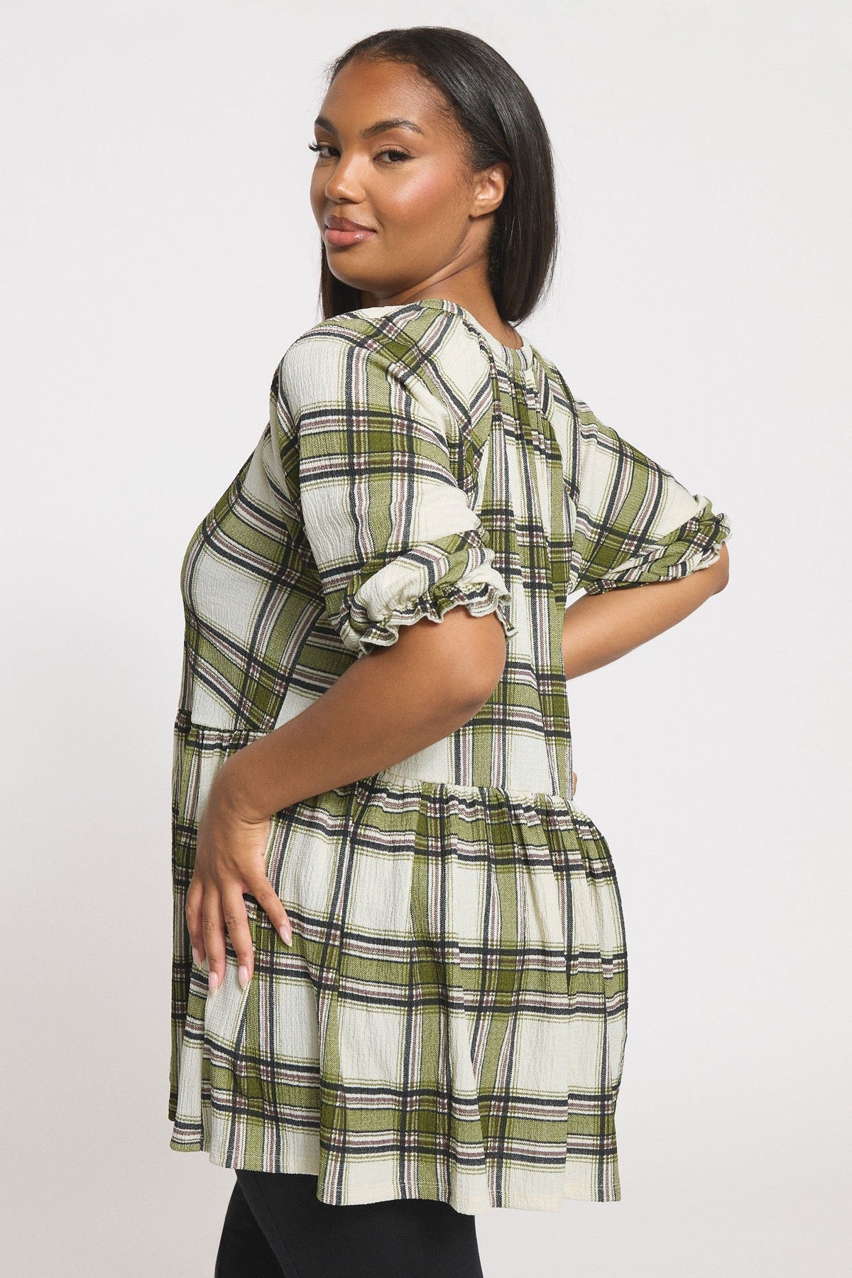 Büyük Beden Kısa Kollu V Yaka Fırfırlı Beli Lastikli Kareli T-shirt 322964