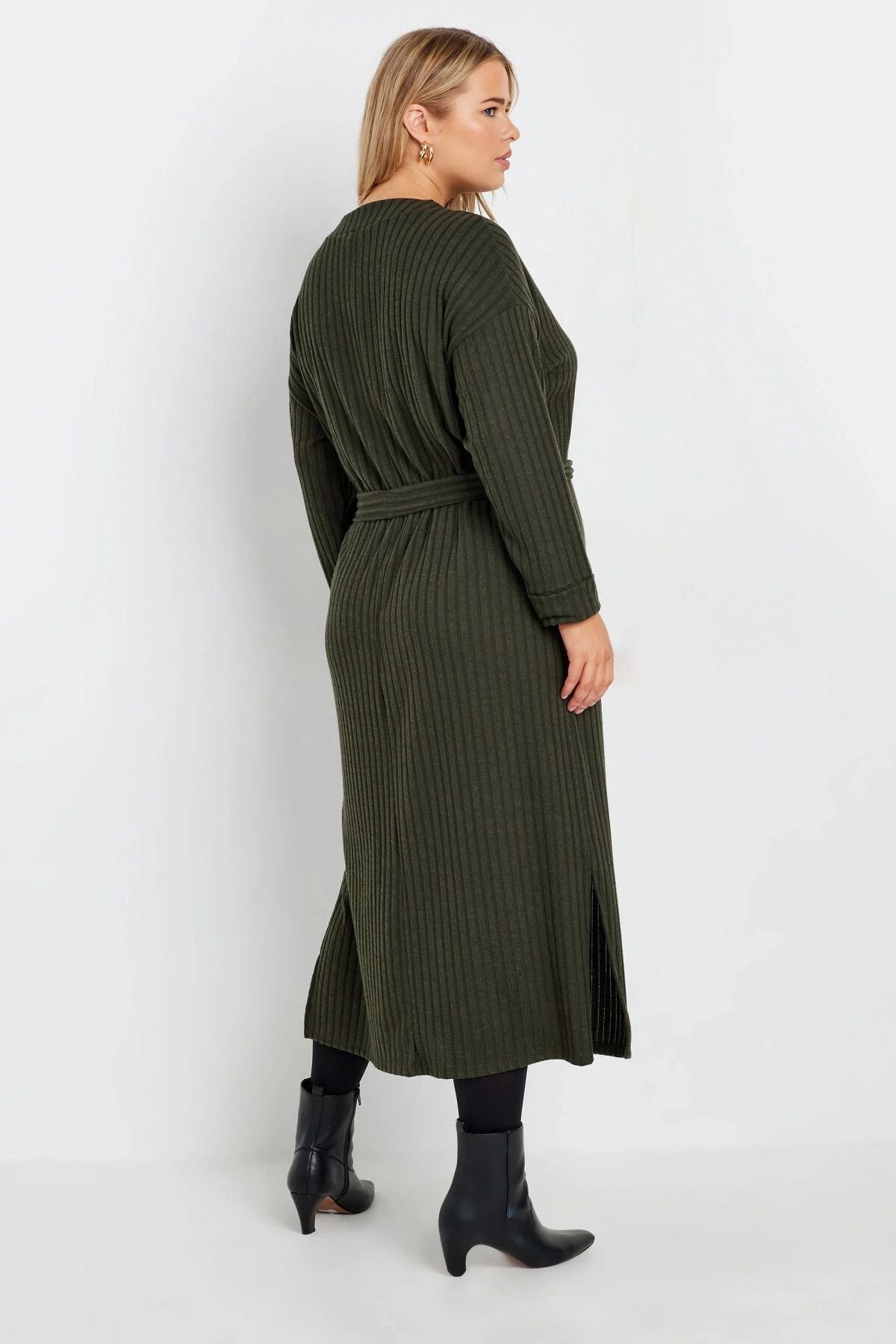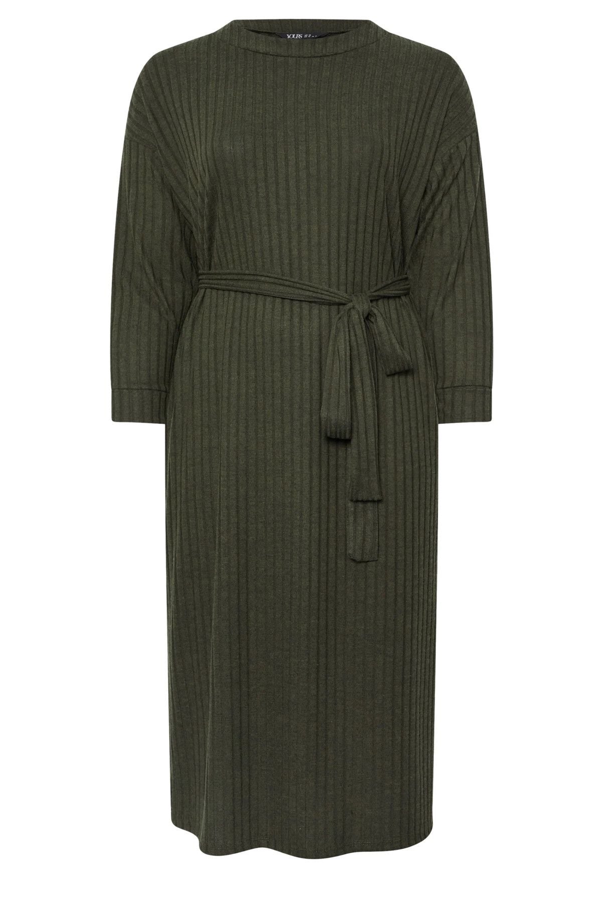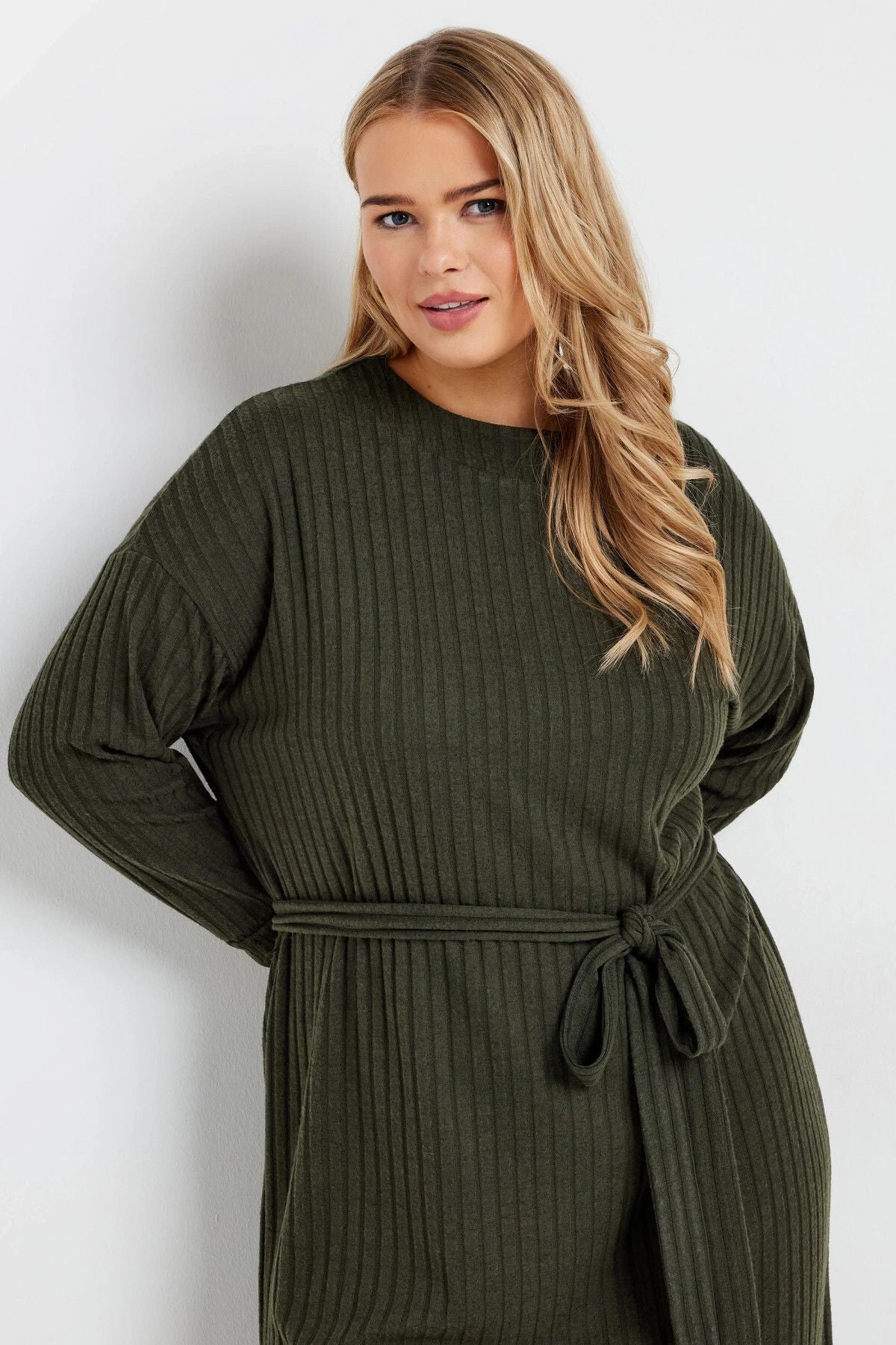 Büyük Beden Kuşaklı Düz Kesim Fitilli Uzun Kollu Astarsız Midi Elbise 322196